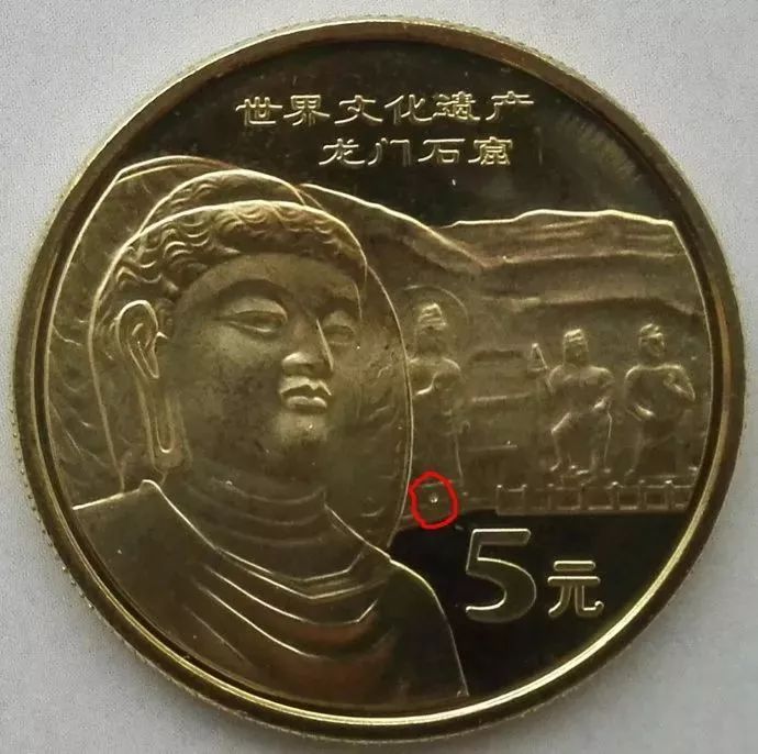 暗记位置在币的中间,“5元”上方大佛右侧佛像腿下部,刻有世界遗产标志暗记。