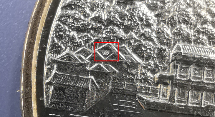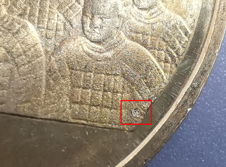 暗记位置在4点钟方向,头排靠币外廓的兵马俑身体下方,刻有世界遗产标志暗记。