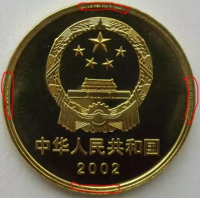 国徽正面外廓内缘刻有“SHI JIE WEN HUA YI CHAN”缩微大写拼音字母,在上下左右四个方向,见下图。