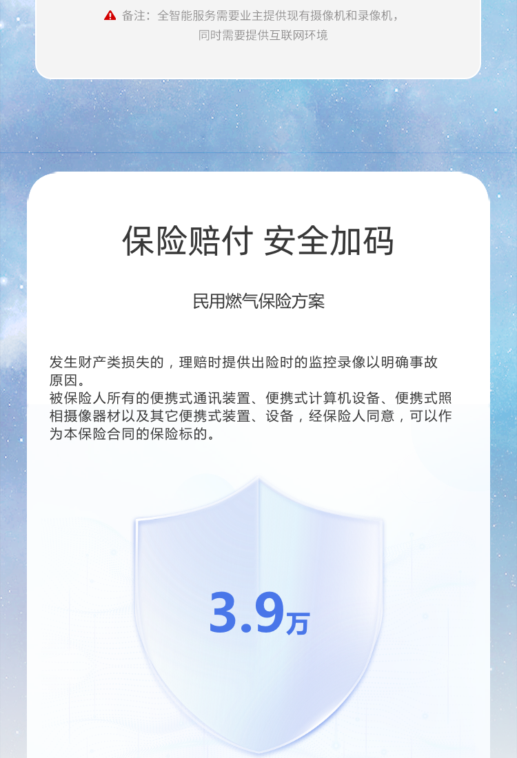 我们为客户提供家庭、商住场景的24小时在线防盗、防火、防毒以及无人化管理服务。实现老旧电子、消防设备“e”键入云,99%时间无故障使用,并升级智能化能力。