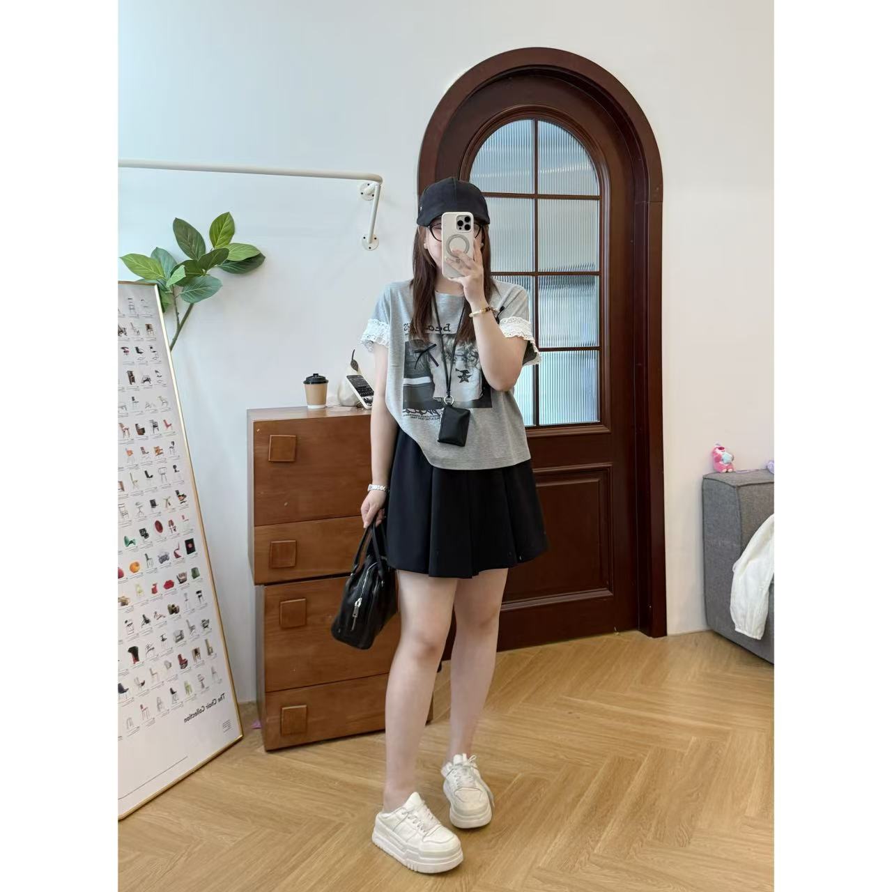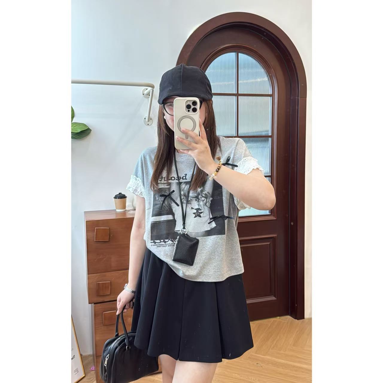 2025新品 佳佳同款【芭蕾报刊】袖口蕾丝辣妹蝴蝶结T恤休闲夏季宽松韩版时尚