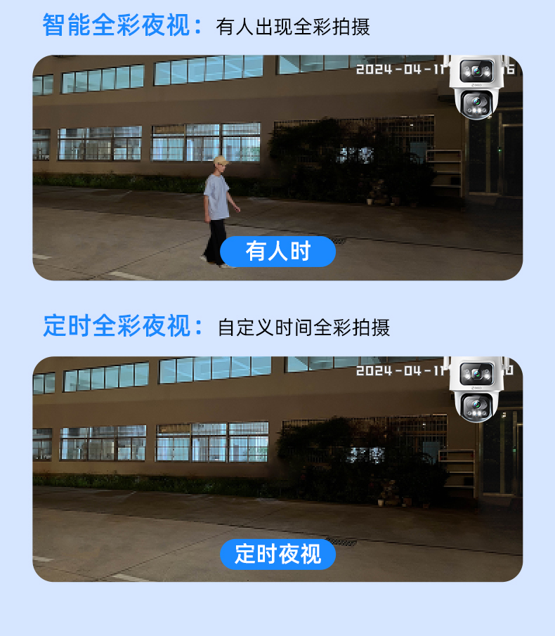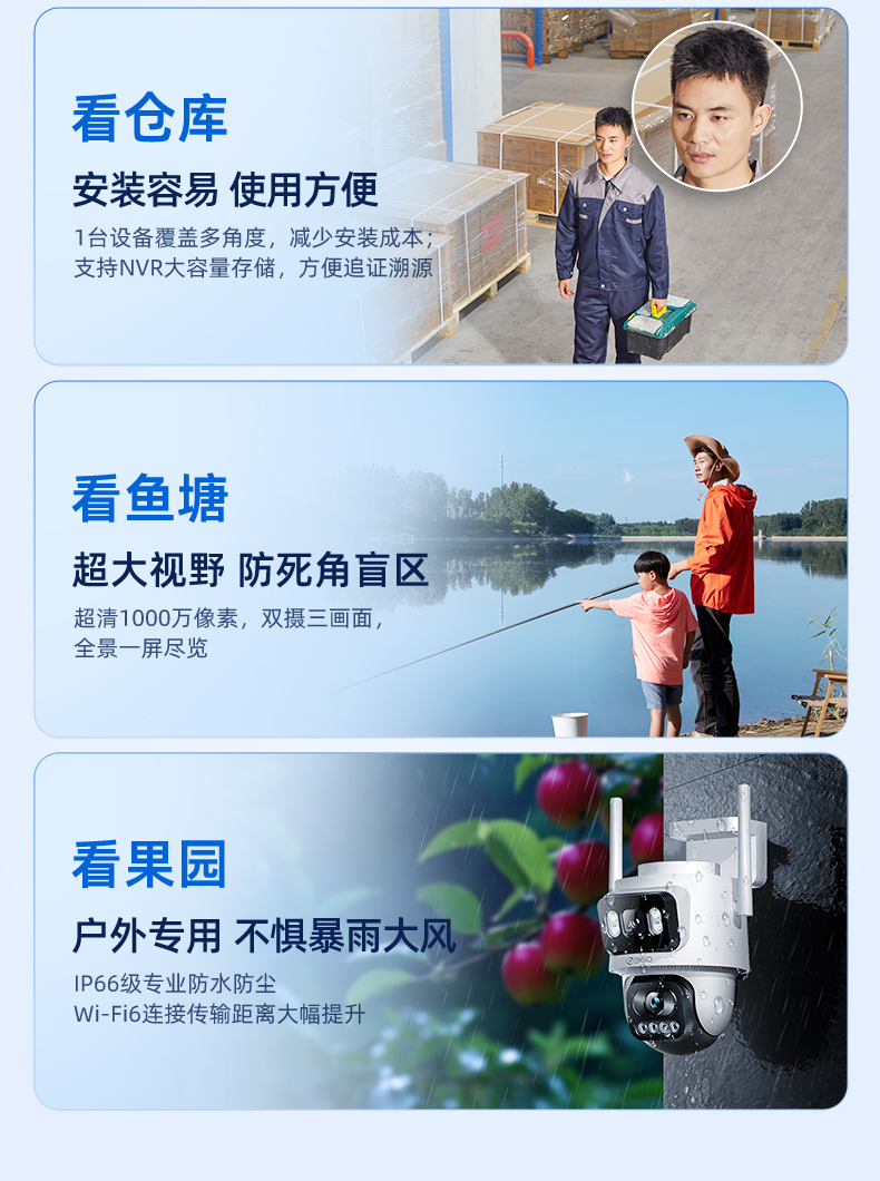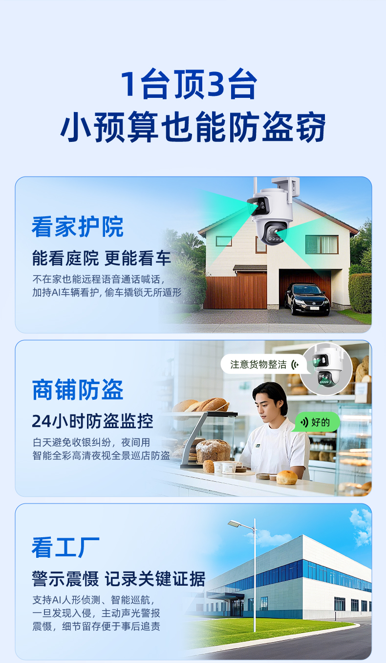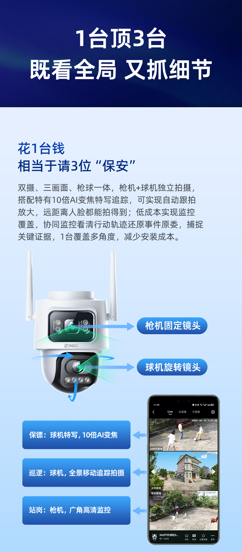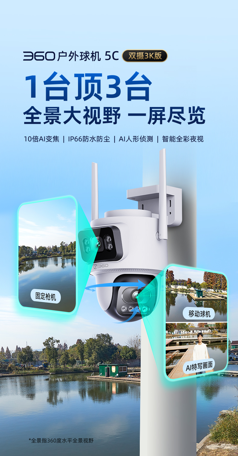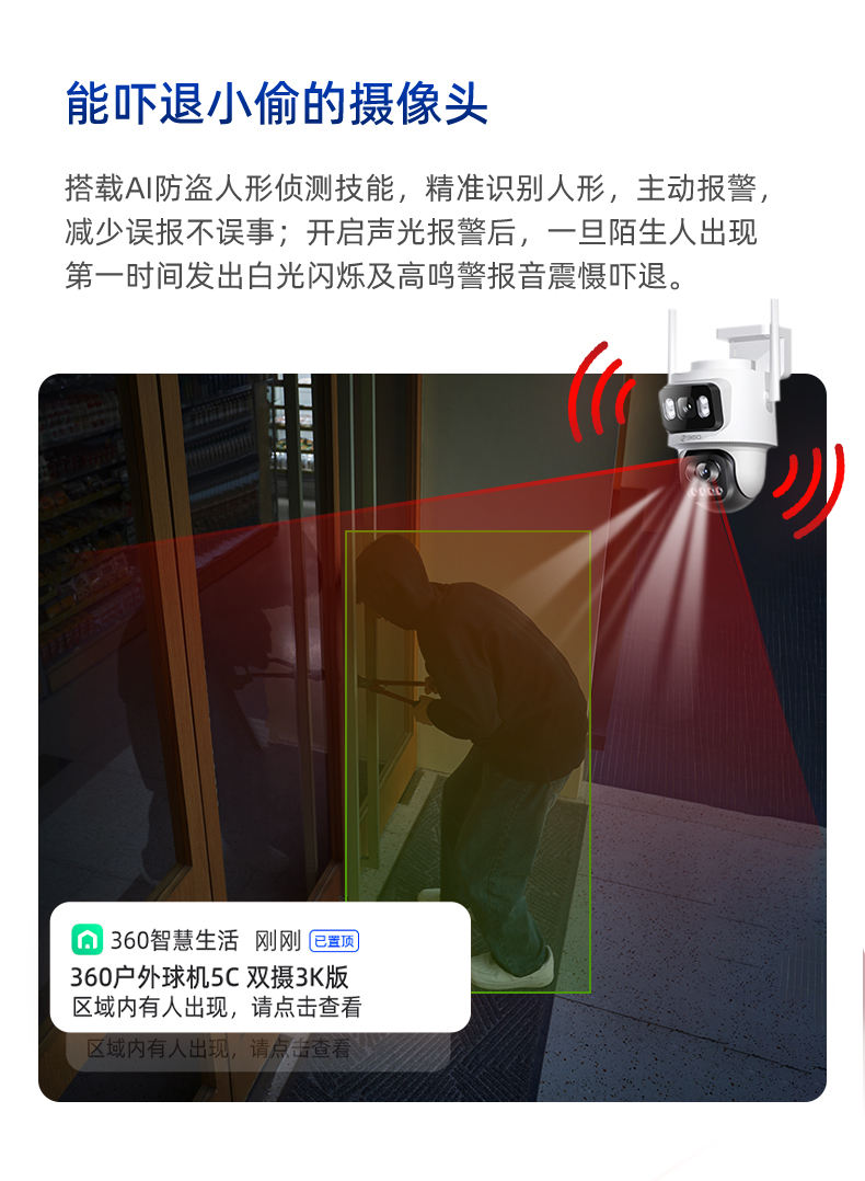【超值】360云台摄像机P500双摄版 双500万镜头 微光夜视 AI移动侦测 360°全景视野 一台顶三台