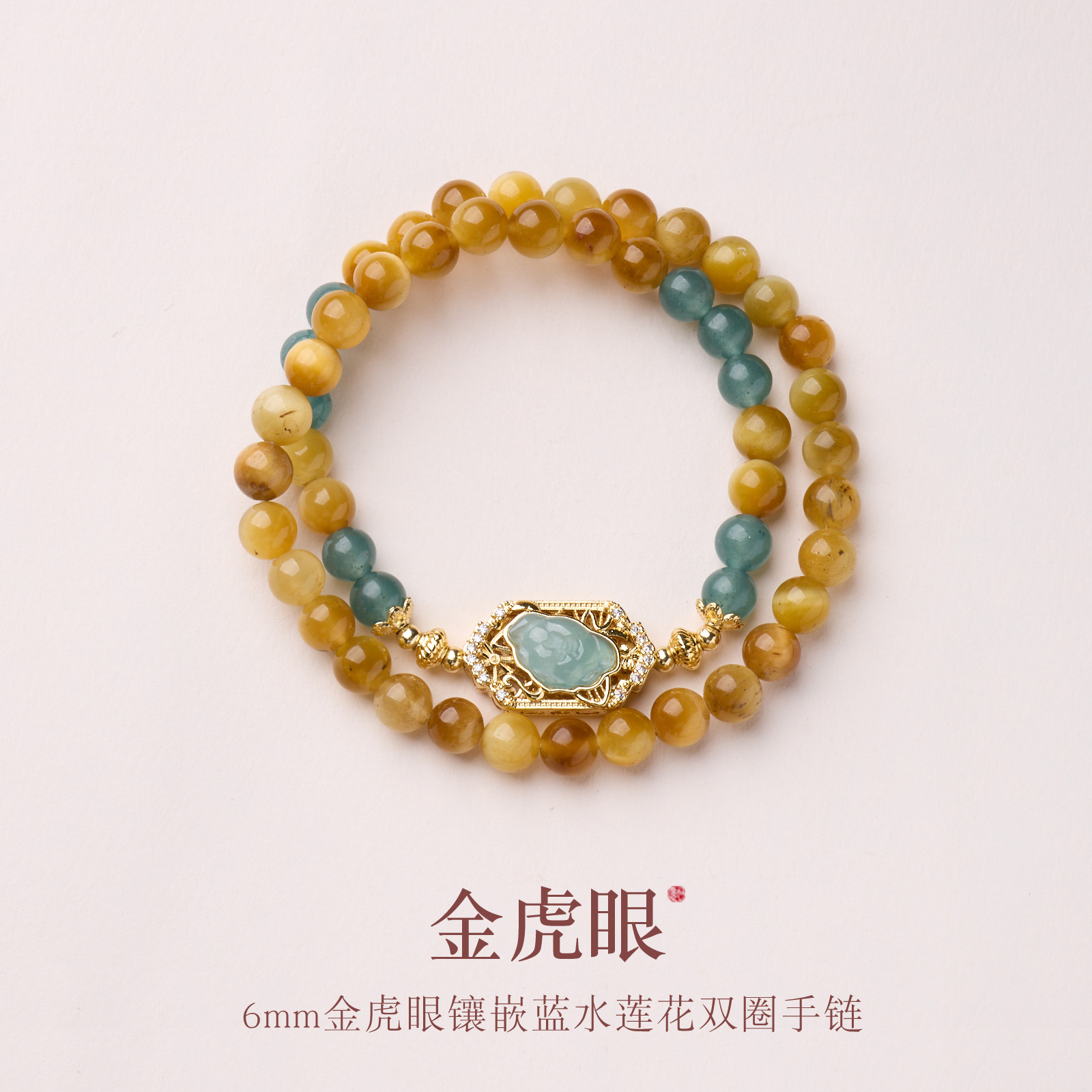 【品名】清辉·金虎眼莲花蓝水翡翠双圈手串