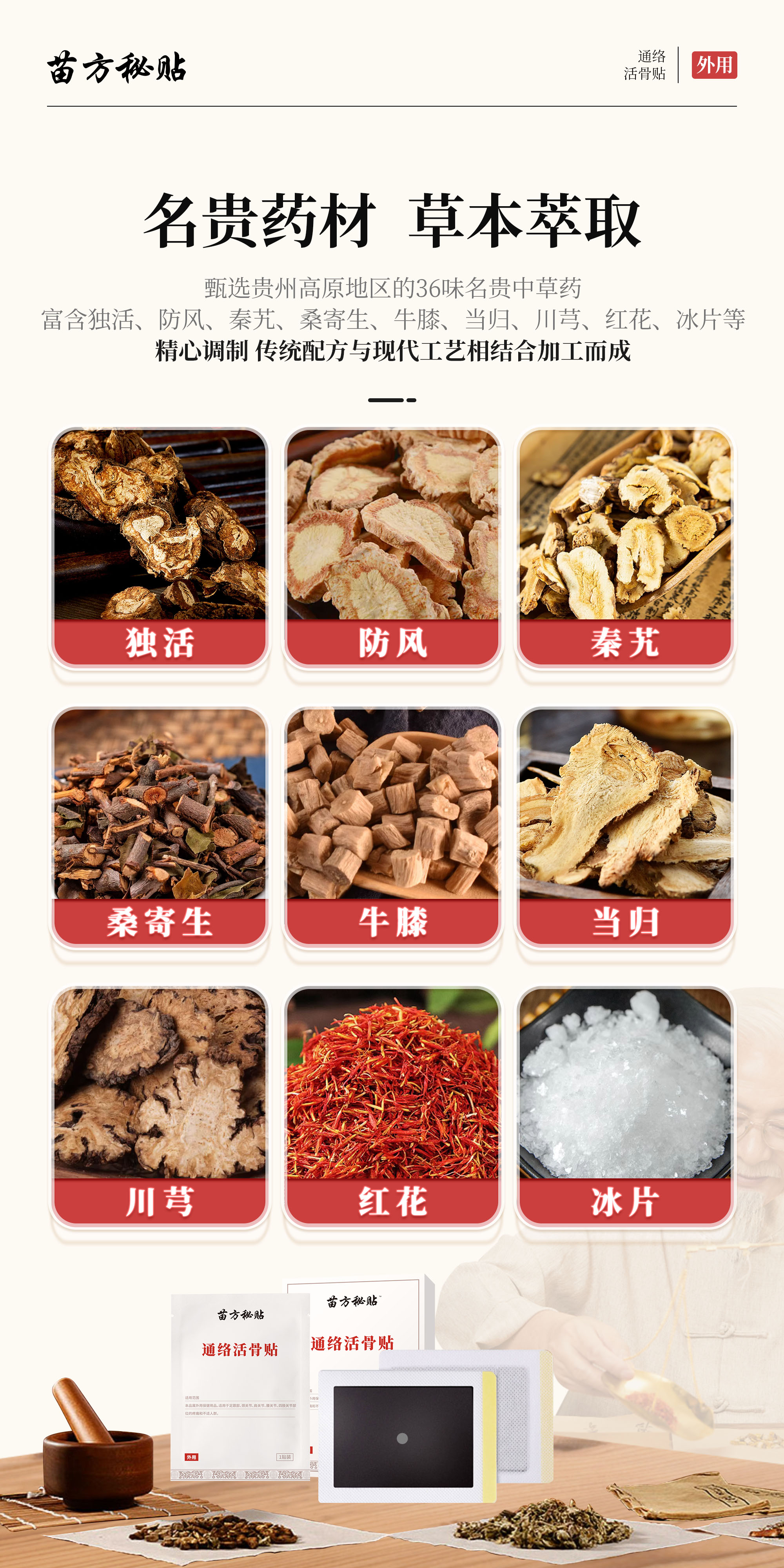 富含独活、防风、秦艽、桑寄生、牛膝、当归、川芎、红花、精心调制传统配方与现代工艺相结合加工而成!