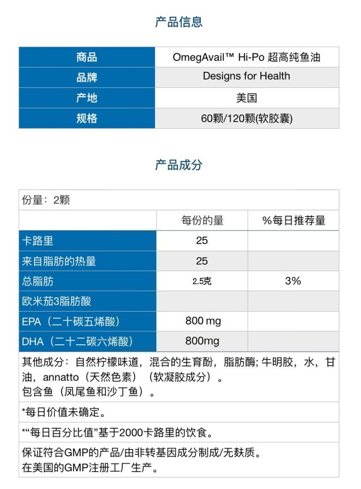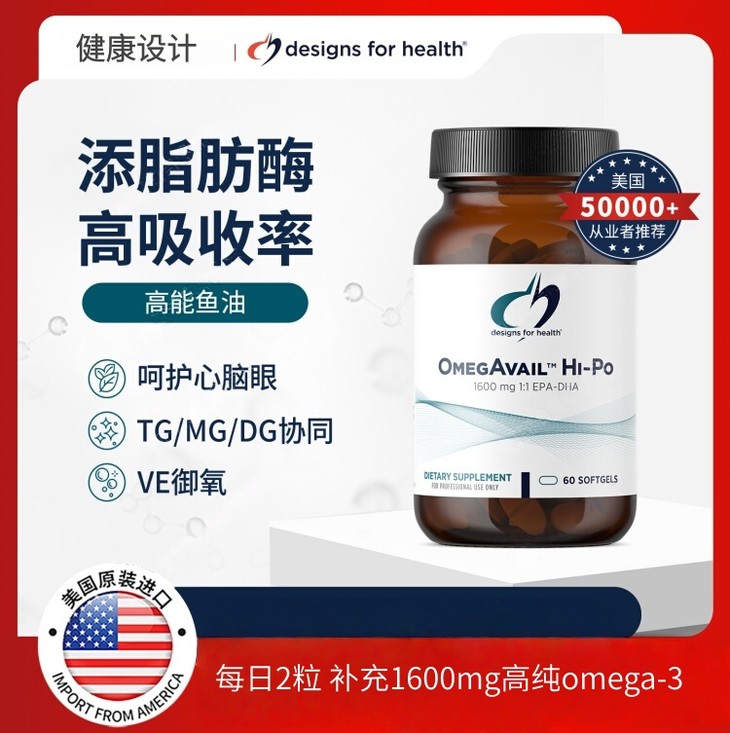 【27年3月效期- 高纯度无重金属深海鱼油 】OmegAvail Hi-Po 60粒 富含EPA鱼油 甘油三酸酯(TG) 两粒含1500mg OMEGA-3 健康设计 DFH