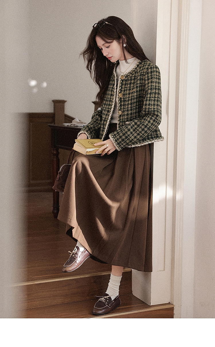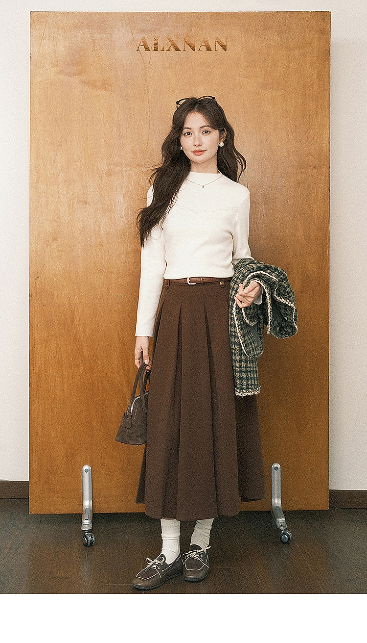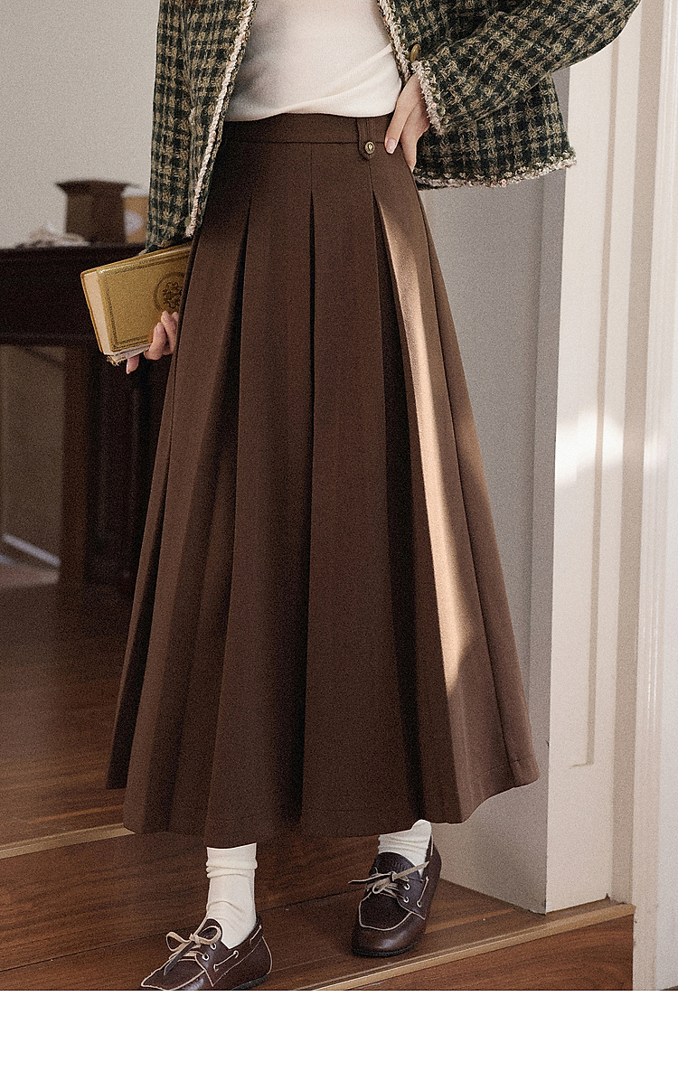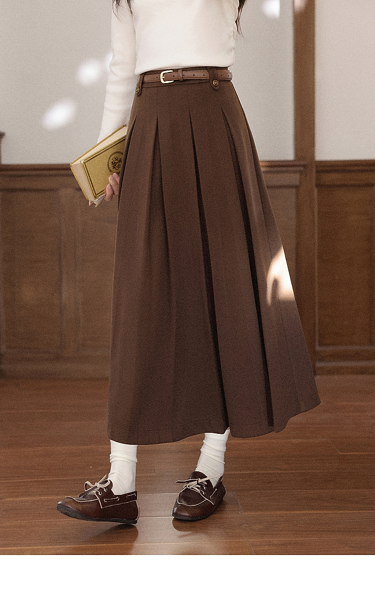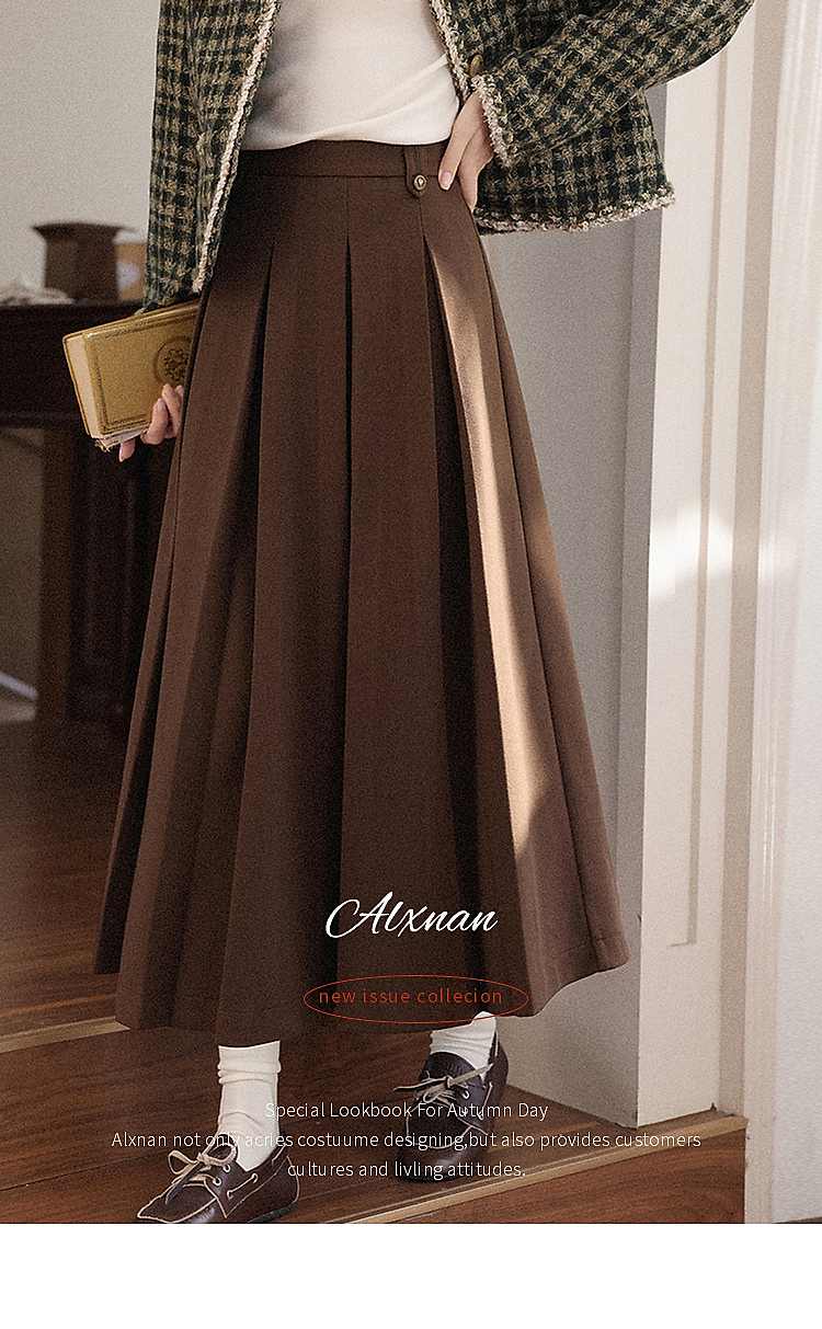 鹿向南「布拉格书店」高腰咖色半身裙女秋新款垂感显瘦长款百褶裙