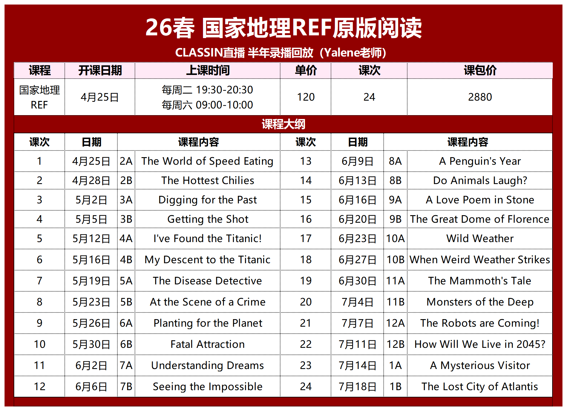 一共24讲,120元/60分钟/讲,课包2880
