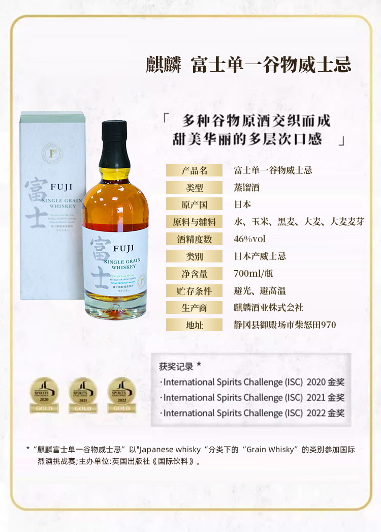 【新品】麒麟富士单一谷物日本威士忌700ml原装进口洋酒烈酒