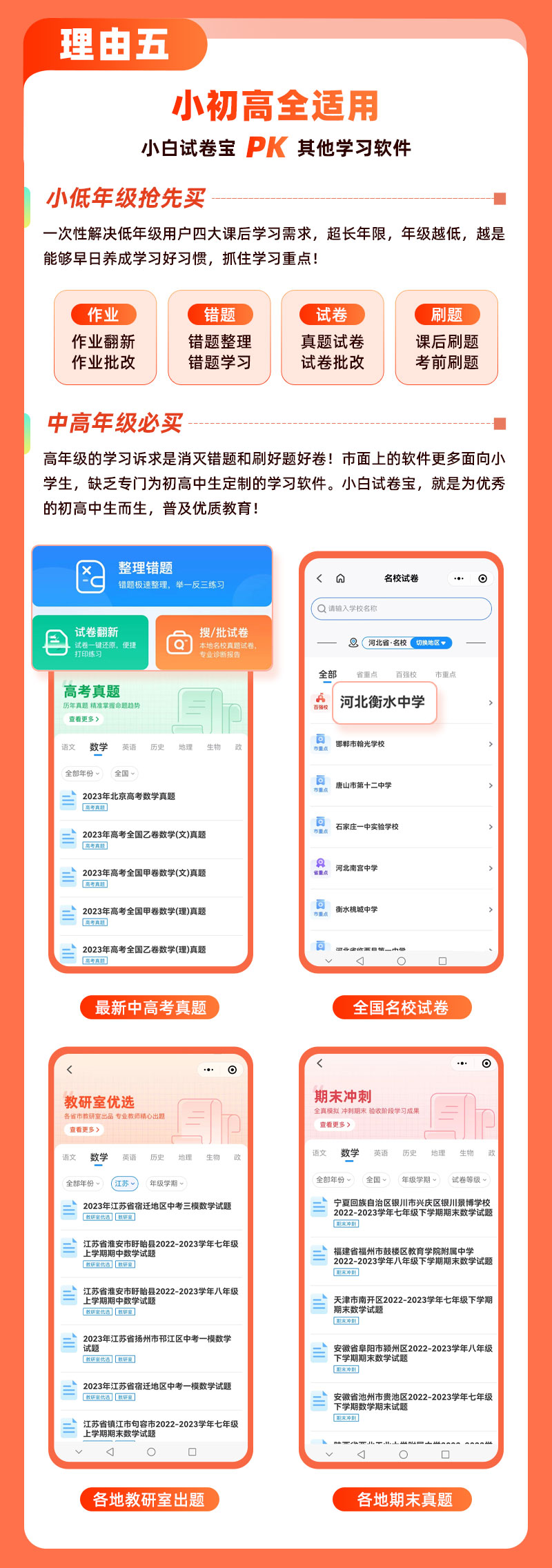 特别适合阶段性复习和假期有大把时间刷题的时候拿出来用一用,500万+试卷库每天更新,覆盖31个省,还有5W+的中高考的真题!可以从小学一直用到高中!