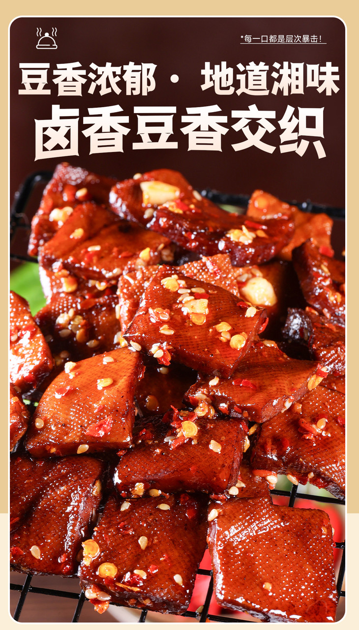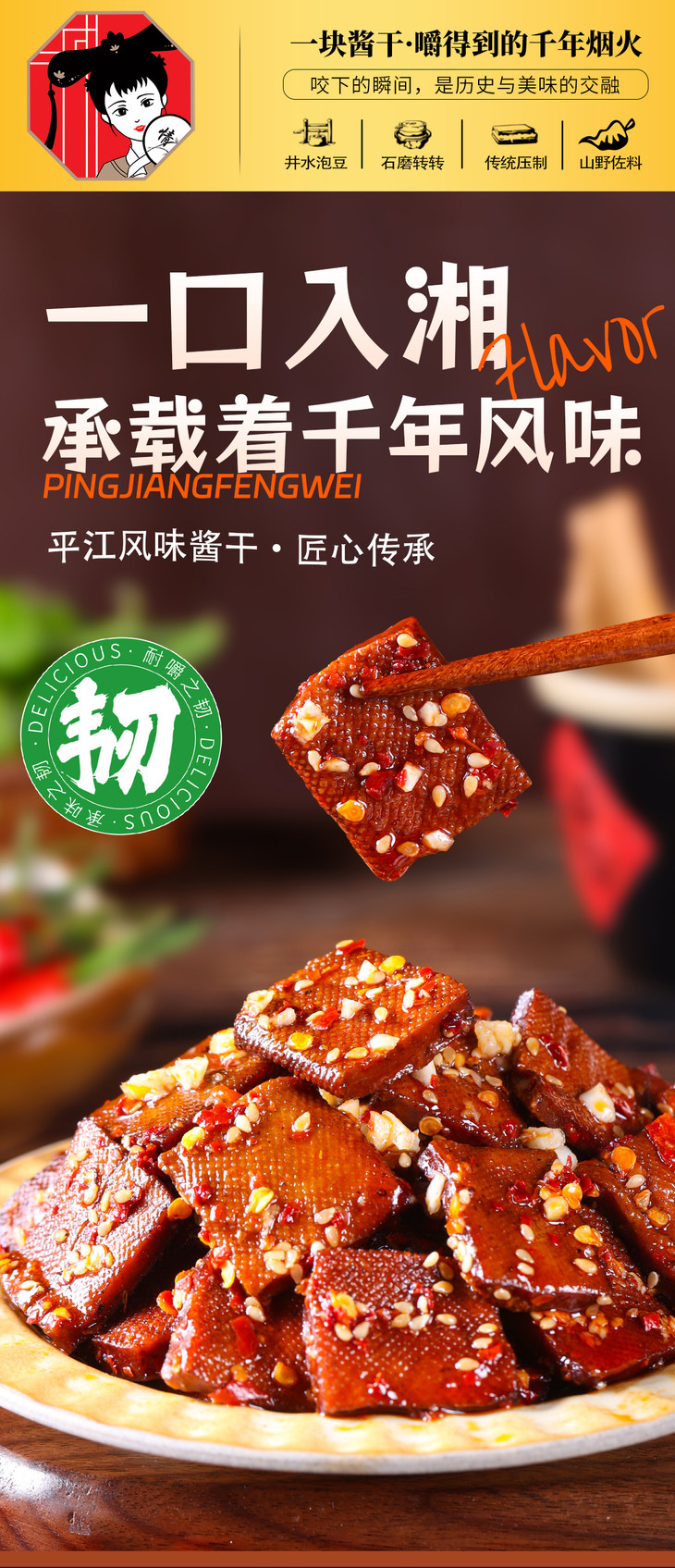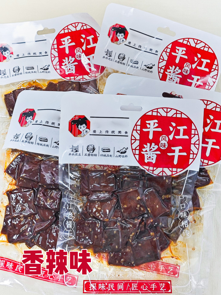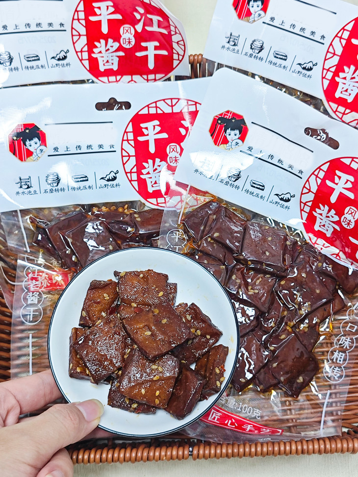 🔥🔥平江风味酱干推荐理由🔥🔥 ✅ 香辣风味辣而不燥,薄切酱干浸润浓郁卤汁,入口鲜香,过瘾得很 ✅ 植物蛋白低碳饮食先锋,100g豆干蛋白质高达43%,胜过牛奶鸡蛋! ✅独立包装,随身好携带,随时随地高效补充蛋白质! 回味悠长,入口一瞬也不怠慢! 刚入舌尖,不是佐料的猛麻 而是瞬间就能透过浅浅佐料 探究到其背后的豆腐滋味.... 可以尝到忙碌人们磨豆腐的样子 这是食物的美,更是豆干的匠心 一口就能吃到酱干滋味... 甚是满足!!🥰