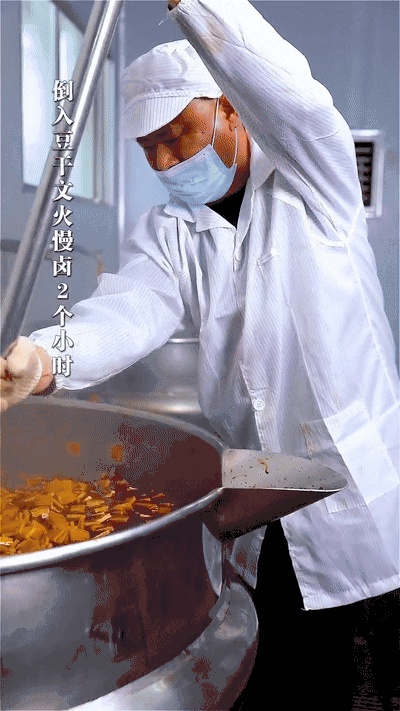 调制卤料,数十种香辛料熬制的卤汁,鲜香扑鼻 将豆干倒入卤汁中卤制 将香辛料的各种滋味一一收纳 熬煮时需要人在旁不停搅拌 保证卤汁不烧开、只能挨边焖 若是烧开,豆干就会起蜂窝眼、吃起来就是渣絮絮 最后,要把卤好的豆干均匀地平铺在竹篾里 经过炙热的高温烘烤,除去最后的水分 豆干颜色由浅变深,醇香浓郁 再撒上辣椒粉和芝麻 一块块口感劲道的平江风味酱干便制作完成啦~