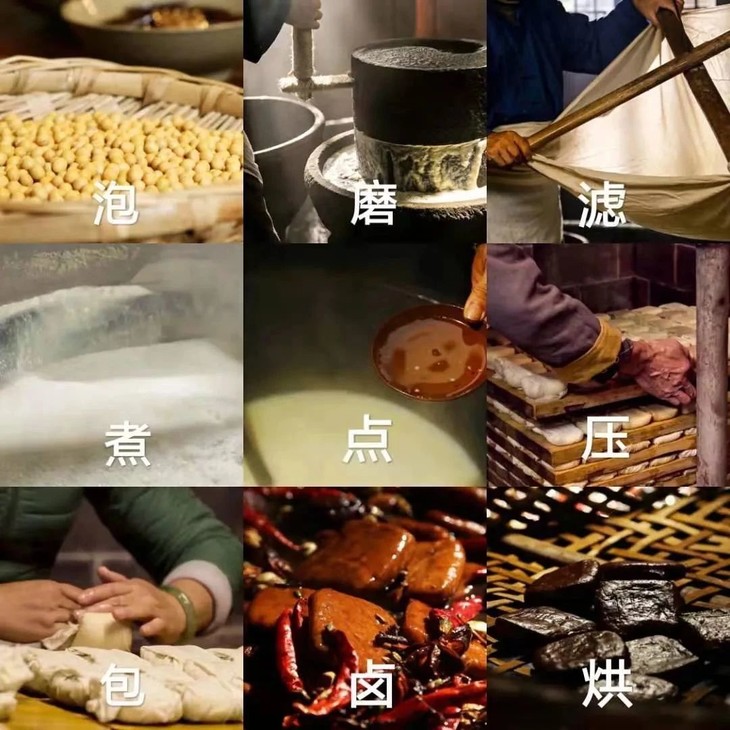 一枚黄豆,在手艺人手中经过“泡、磨、滤、煮、点、包、压、卤、烘”等多道工序后, 才能成为一块质地密实、味道鲜美的平江风味酱干