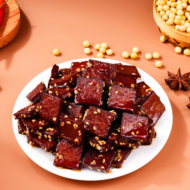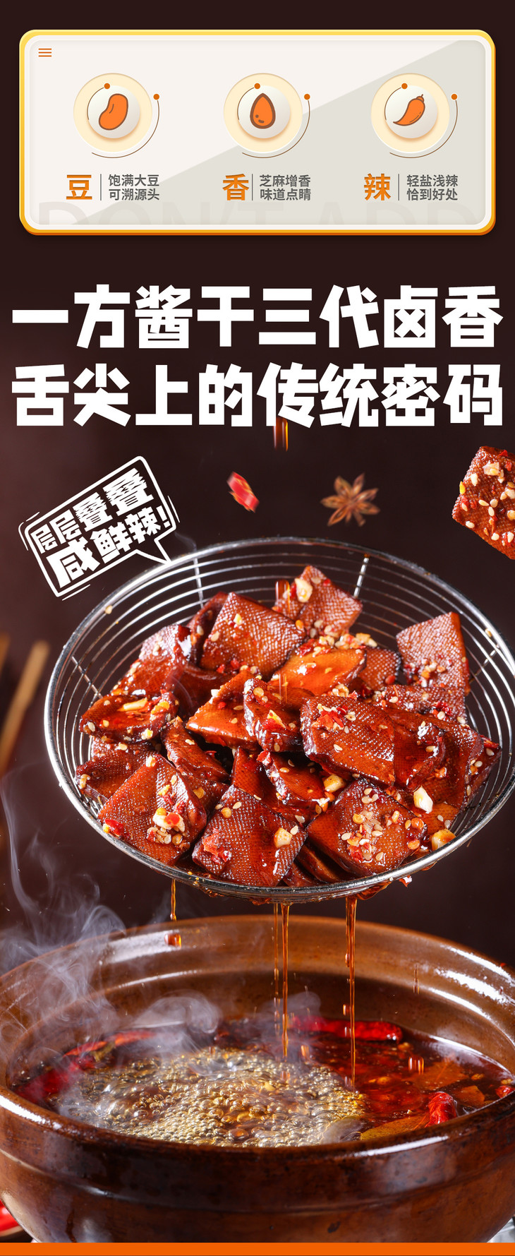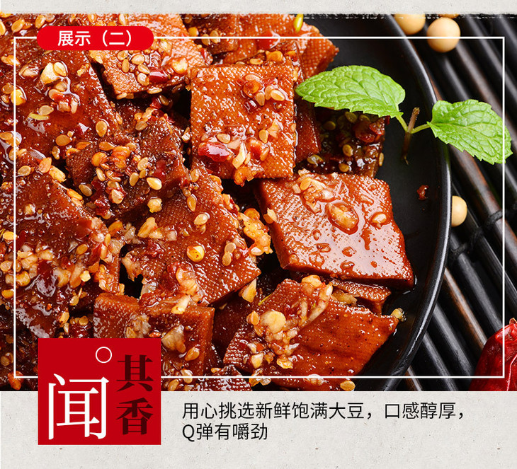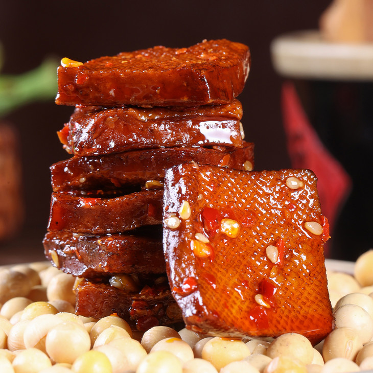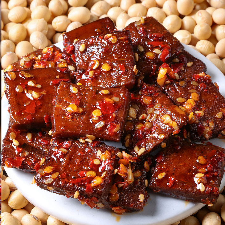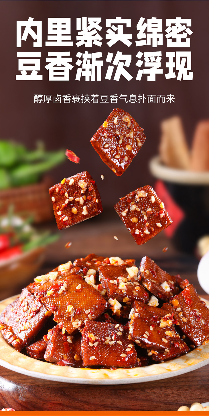 怕是祖先抠破耳根也想不到 当今不吃肉都爱吃豆干❗ 🔥🔥豆干的热度这些年实在是相当猛 低碳饮食的先锋潮流 让大家对植物蛋白充满喜欢! 其中最优的自然是大豆制品! 豆腐、豆干、酱干、豆浆... 其中豆干、酱干最为便捷,随身好携带,吃多不撑肚子 以秘制酱汁慢火卤制成的香辣风味酱干 入口鲜香四溢,回味悠长