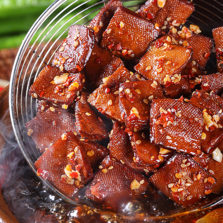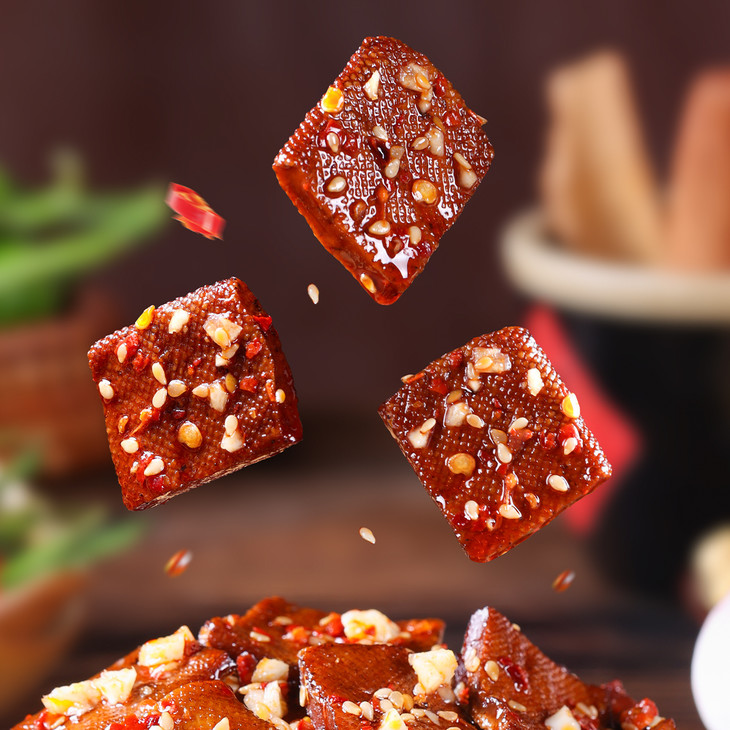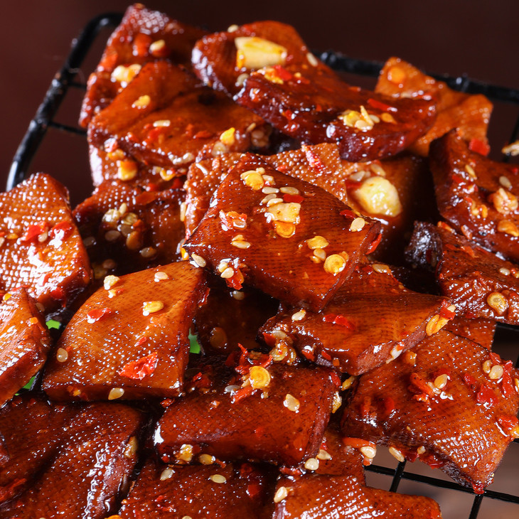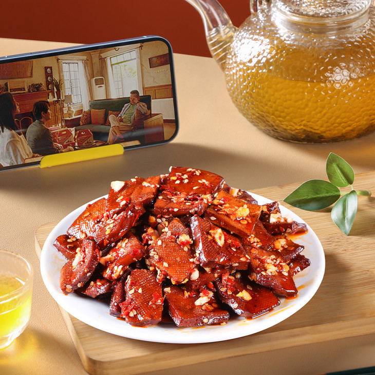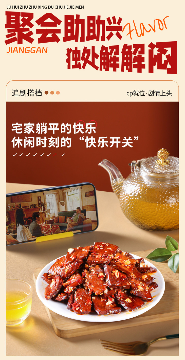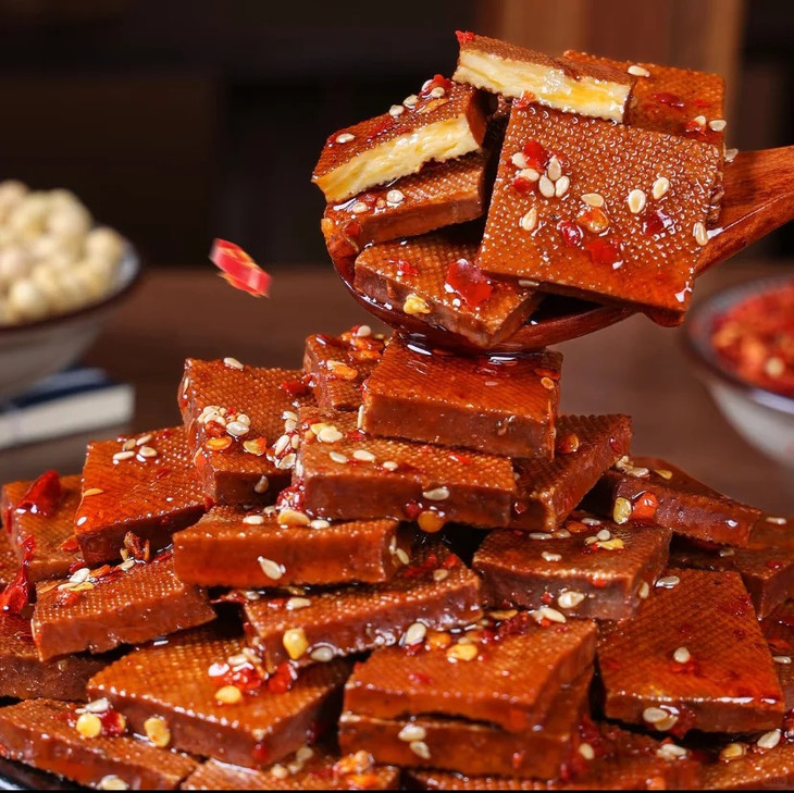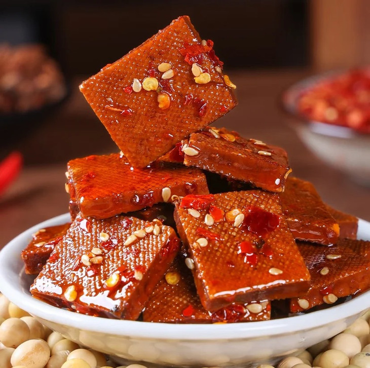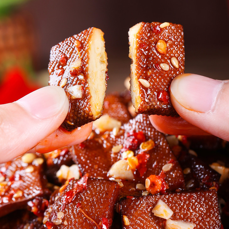 怕是祖先抠破耳根也想不到 当今不吃肉都爱吃豆干❗ 🔥🔥豆干的热度这些年实在是相当猛 低碳饮食的先锋潮流 让大家对植物蛋白充满喜欢! 其中最优的自然是大豆制品! 豆腐、豆干、酱干、豆浆... 其中豆干、酱干最为便捷,随身好携带,吃多不撑肚子 以秘制酱汁慢火卤制成的香辣风味酱干 入口鲜香四溢,回味悠长