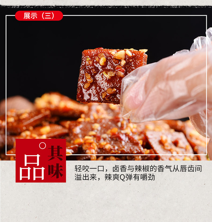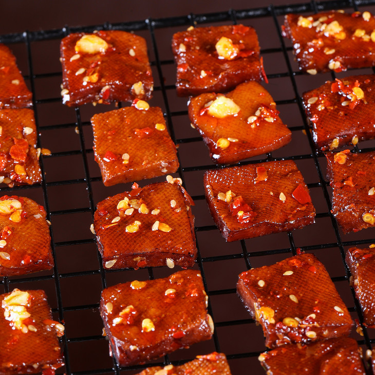 市面上大部分豆腐干选择的是大豆分离蛋白等添加剂合成 而平江风味酱干用的是豆香浓郁的新鲜优质大豆 平江风味酱干的其余配料都是酿造酱油、芝麻、辣椒等传统调味料 卤汁的香浓滋味 完全浸入到了酱干的丝丝肌理 十分入味,颜色也比一般豆腐干要深 历经三次烘干,韧劲儿也不是一般豆腐干能比的 用力弯都不易折断,非常有嚼劲儿、越嚼越香! 色泽红润诱人、豆香回味浓郁、质感细腻劲道 食之一口入魂