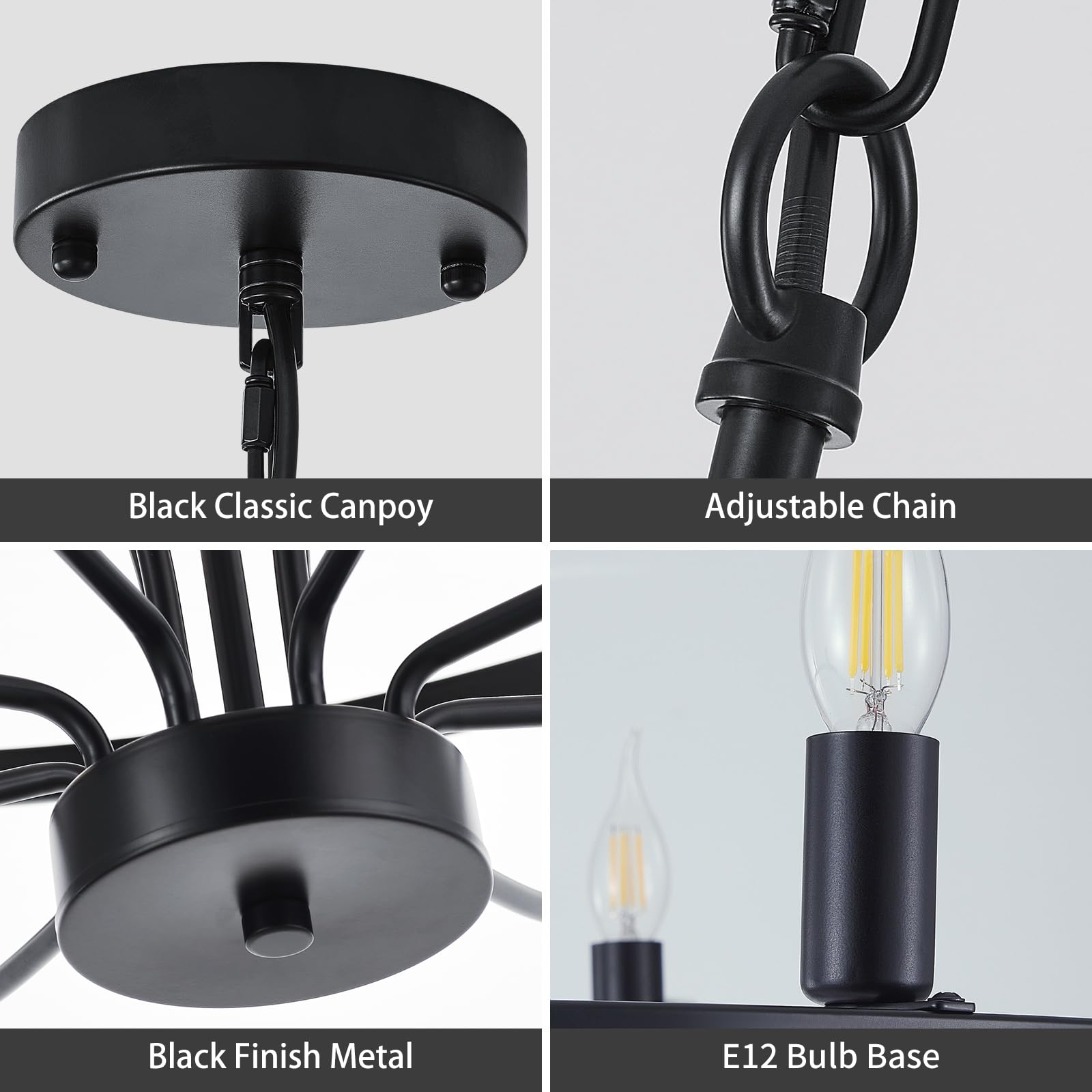 这款黑色餐厅吊灯使用12个E12灯口(最高60W),兼容白炽灯、节能灯和LED灯泡(灯泡需另购)。厨房岛台黑色吊灯支持调光器与可调光灯泡(需额外安装,不包含在内)。