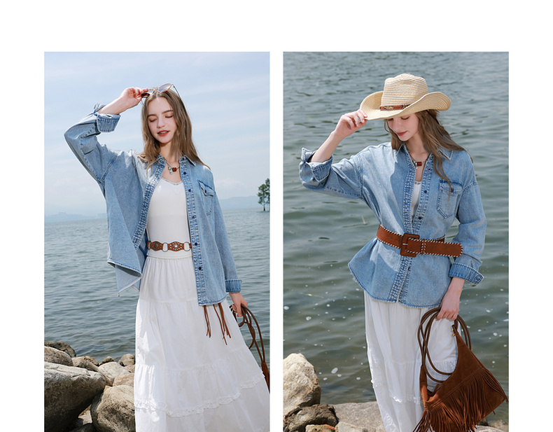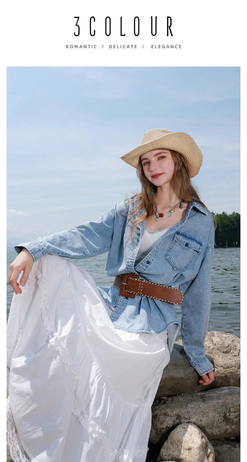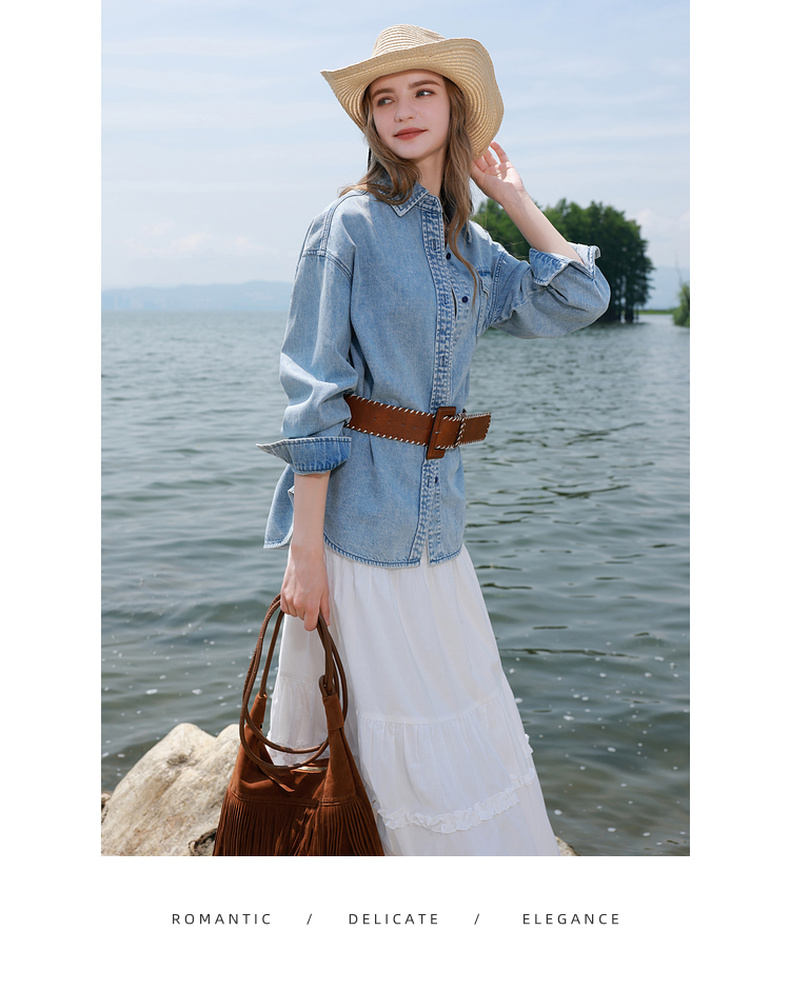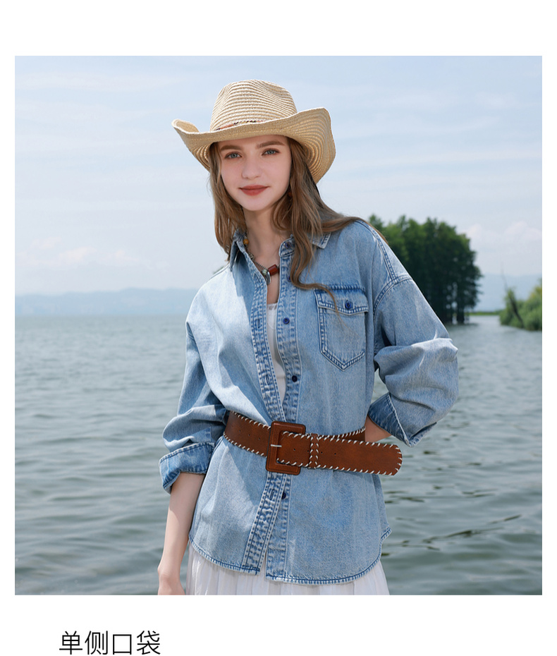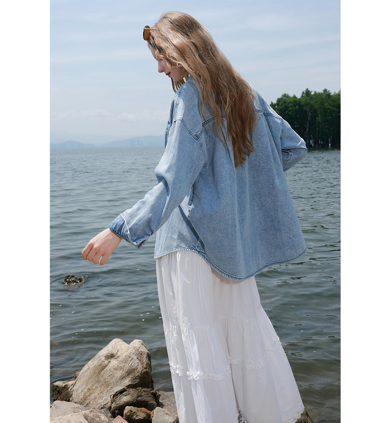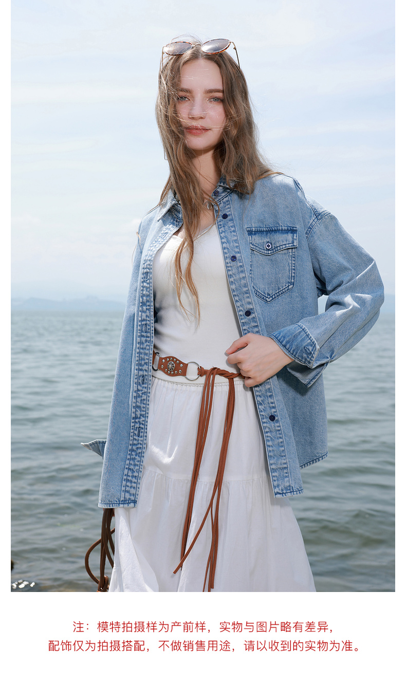三彩2025秋季新款复古水洗牛仔衬衫宽松中长长袖衬衣上衣M