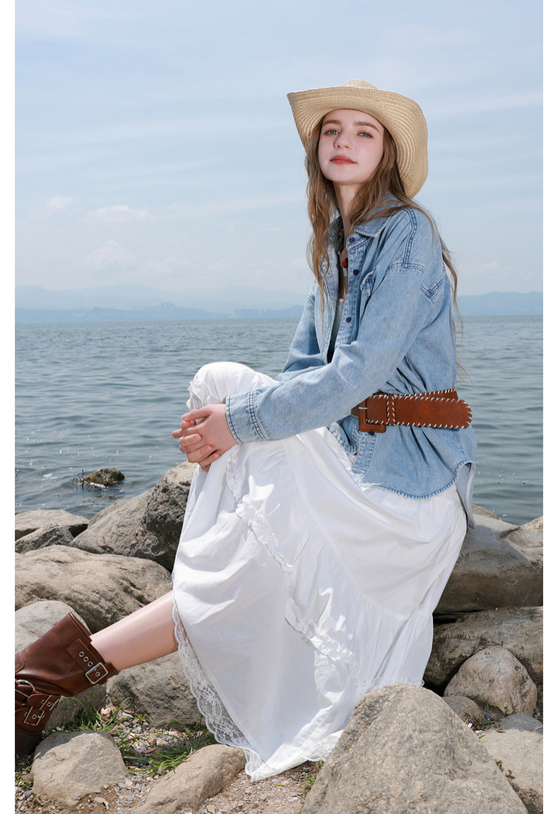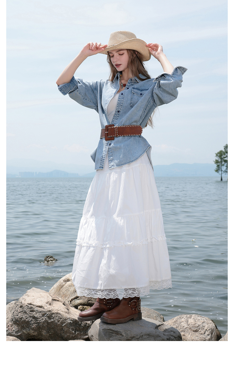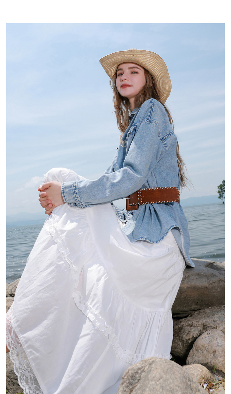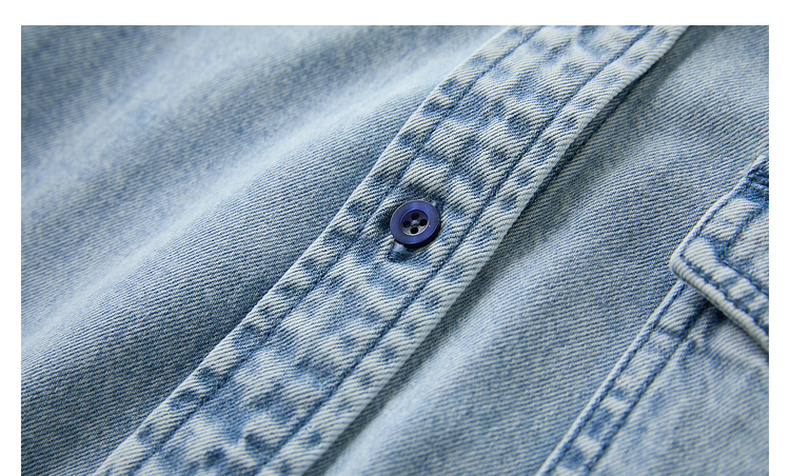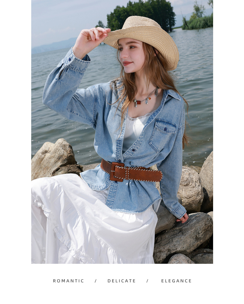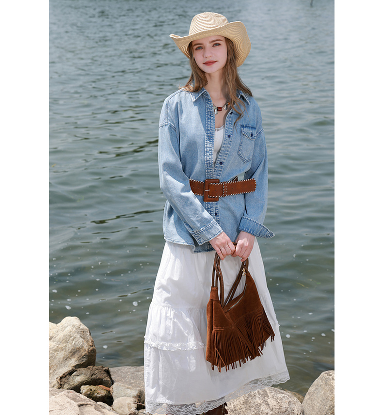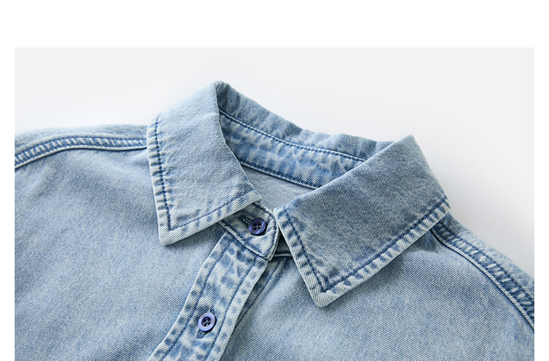 三彩2025秋季新款复古水洗牛仔衬衫宽松中长长袖衬衣上衣M