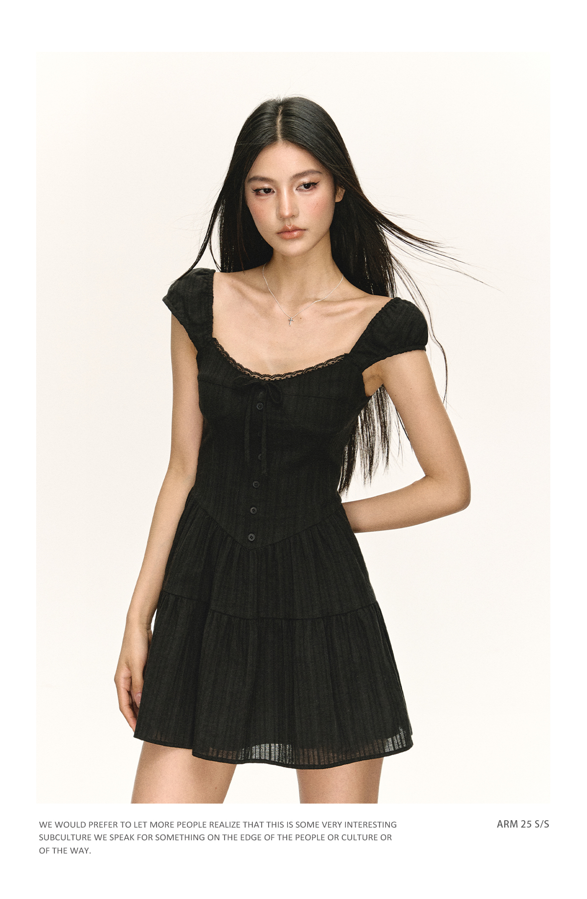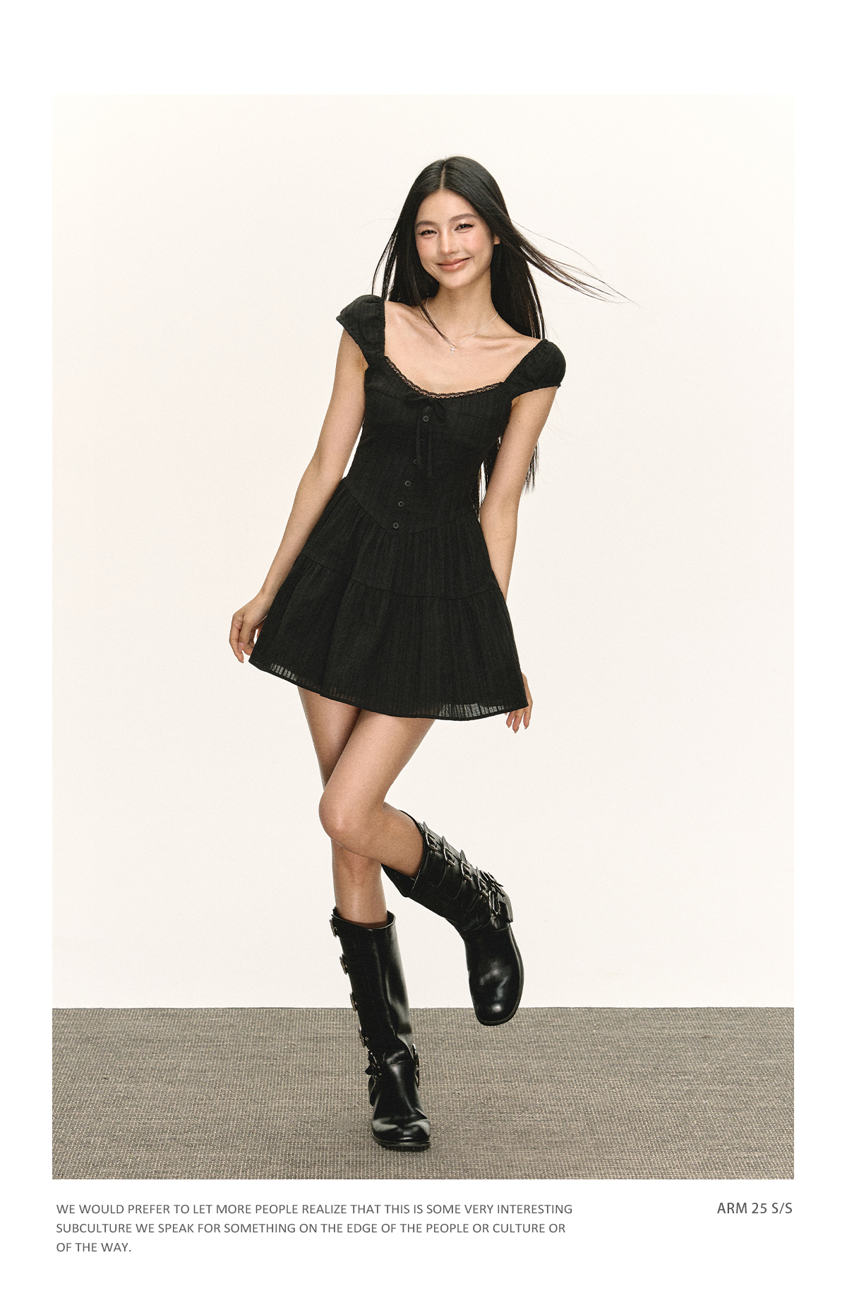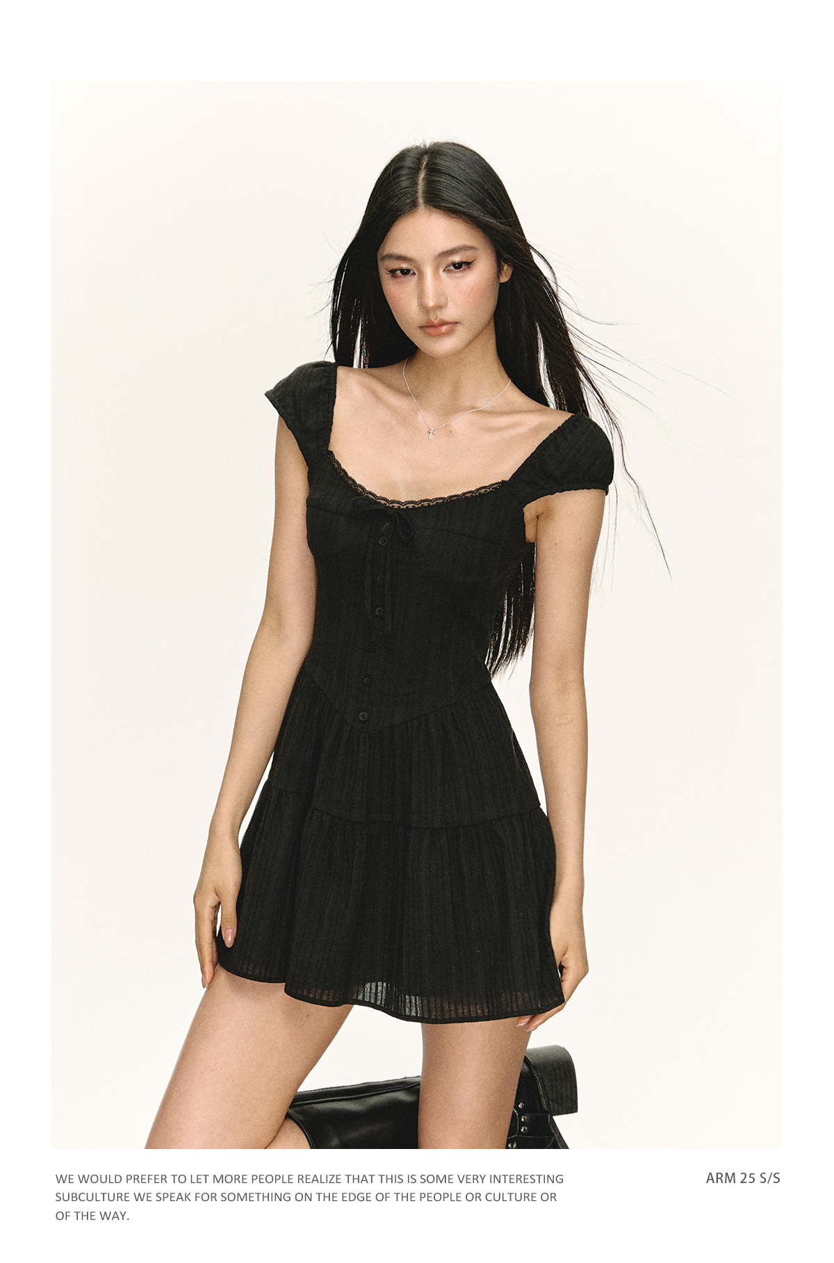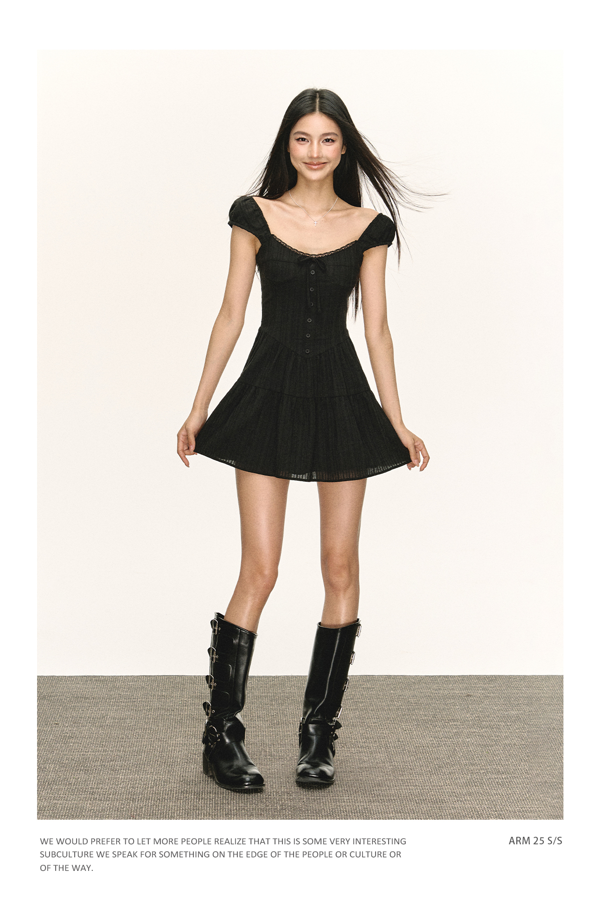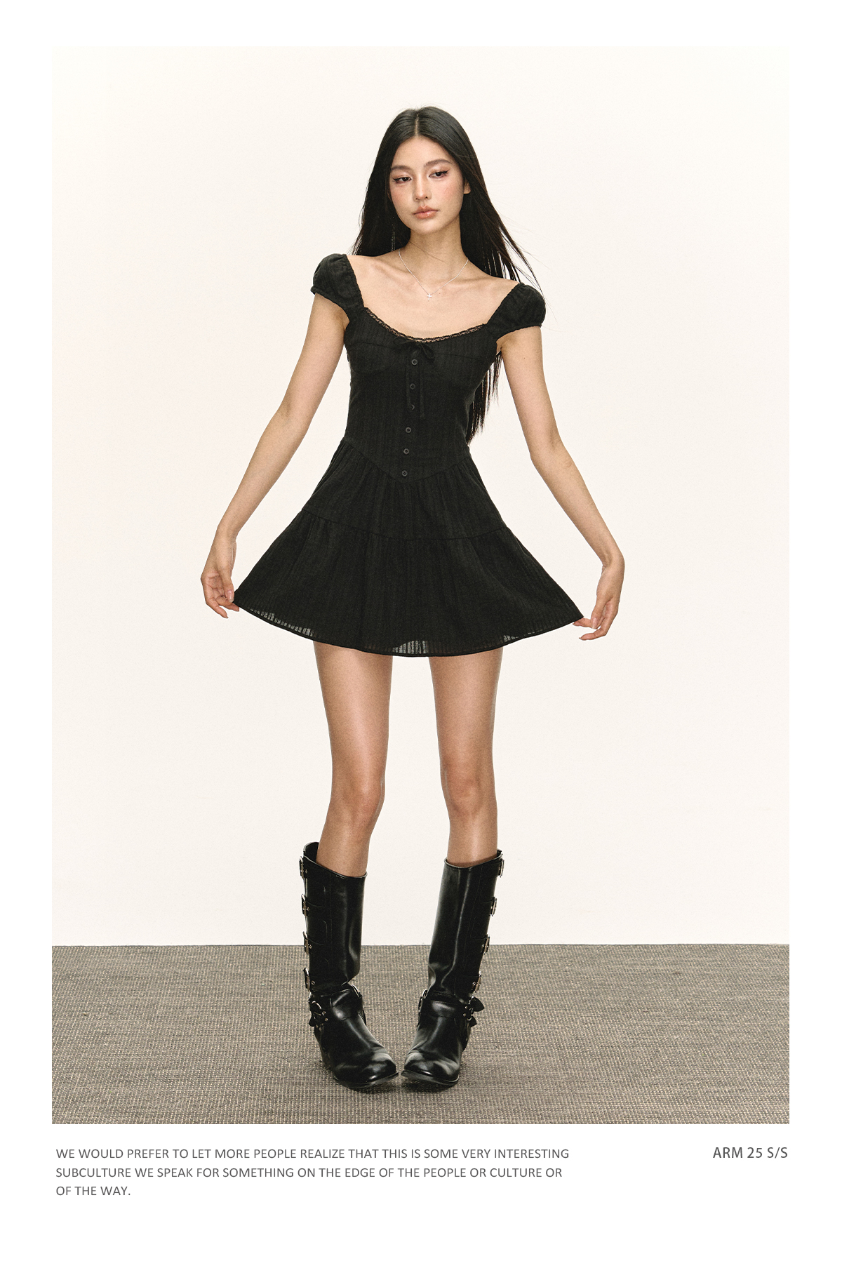 Ariseism 设计感法式方领短袖连衣裙女夏季新款收腰小黑裙蛋糕裙子