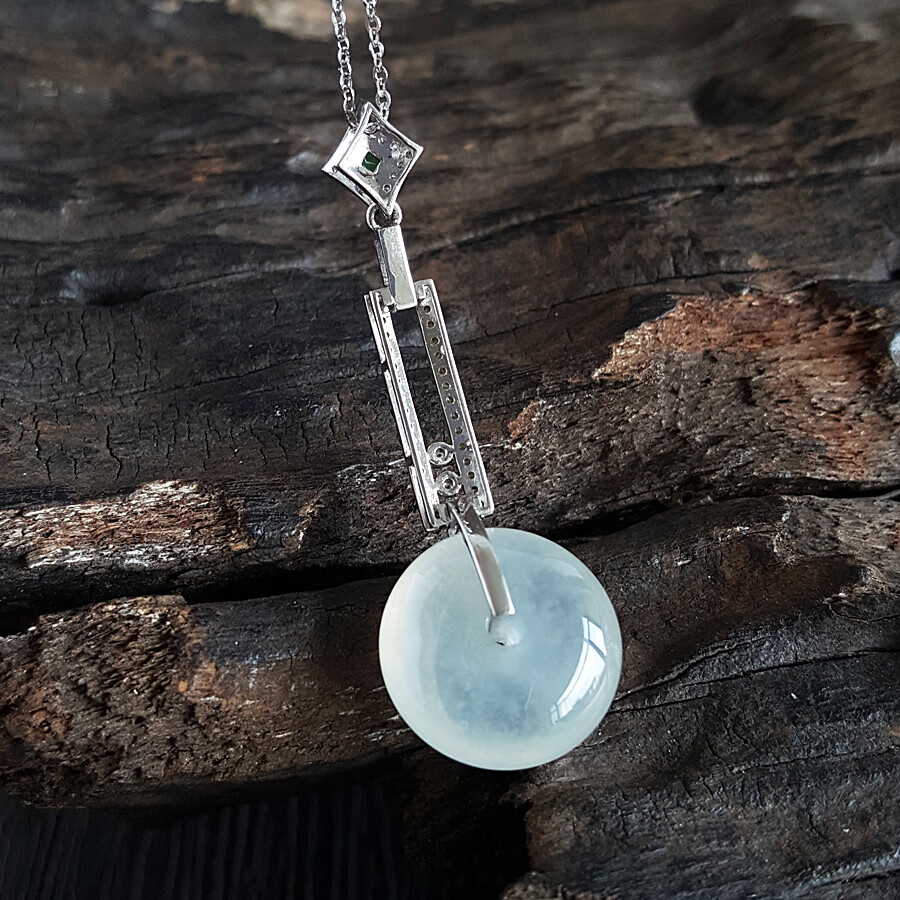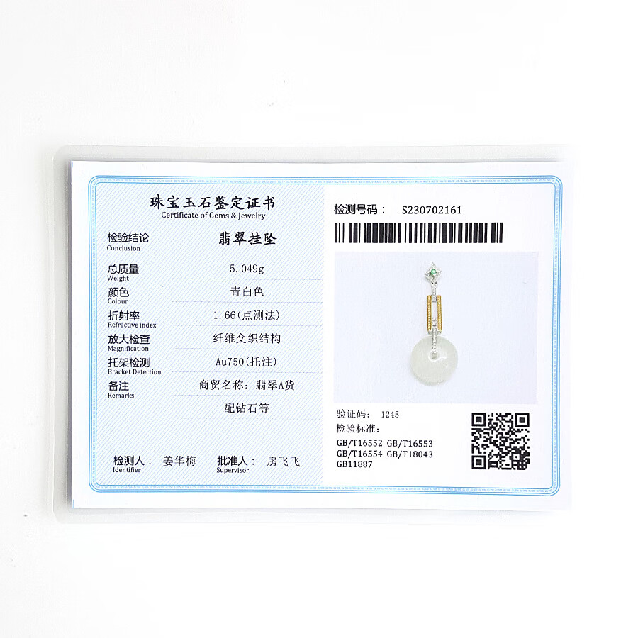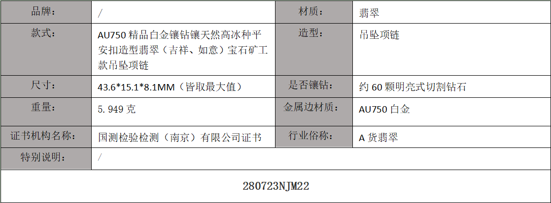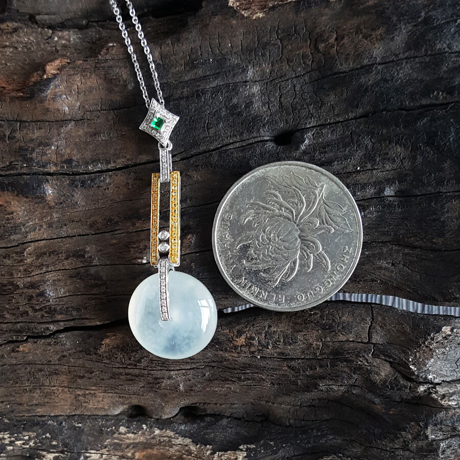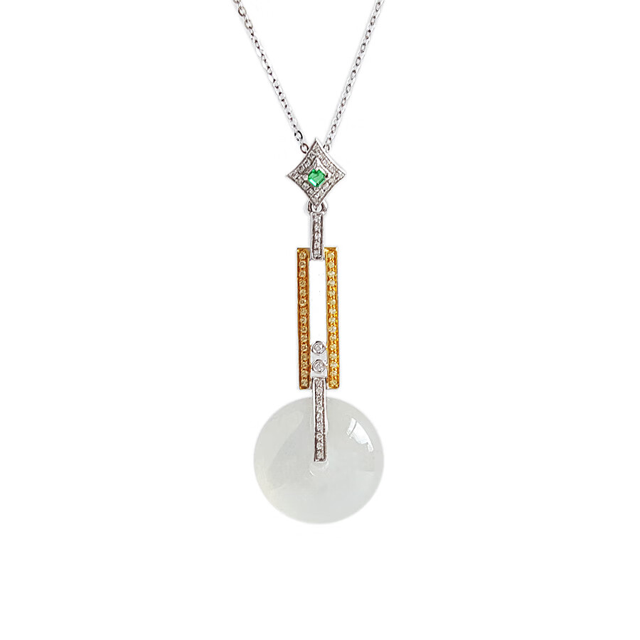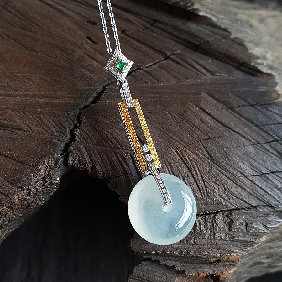 【天然正品】A货翡翠天然高冰种平安扣造型翡翠宝石矿工款AU750精品白金镶钻吊坠项链43.6*15.1*8.1MM 280723NJM22