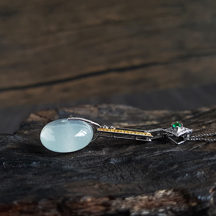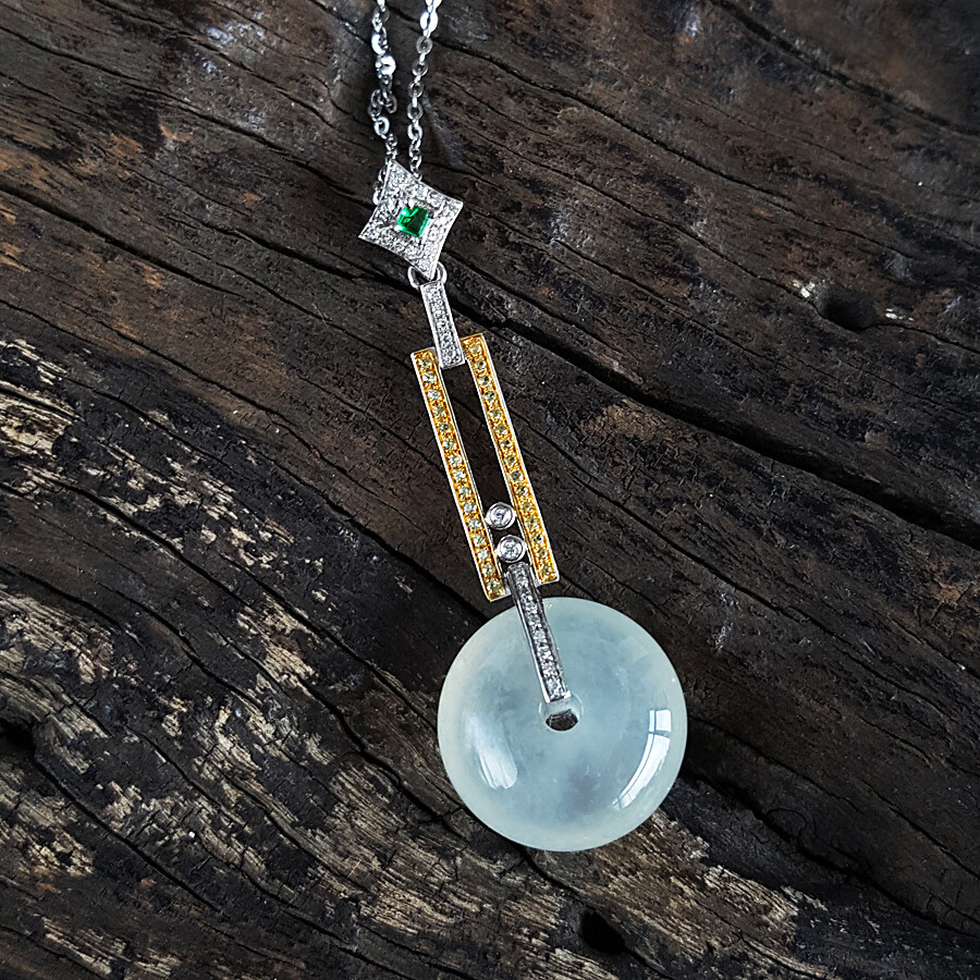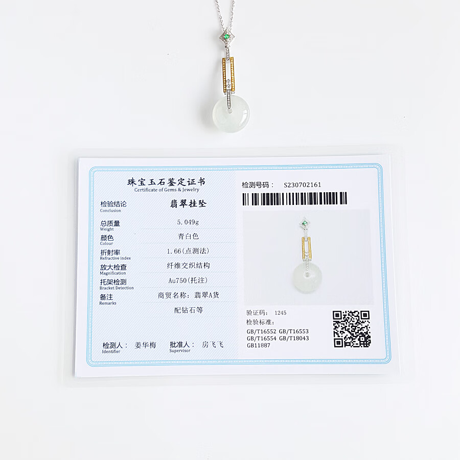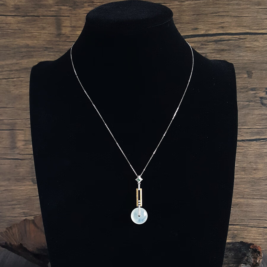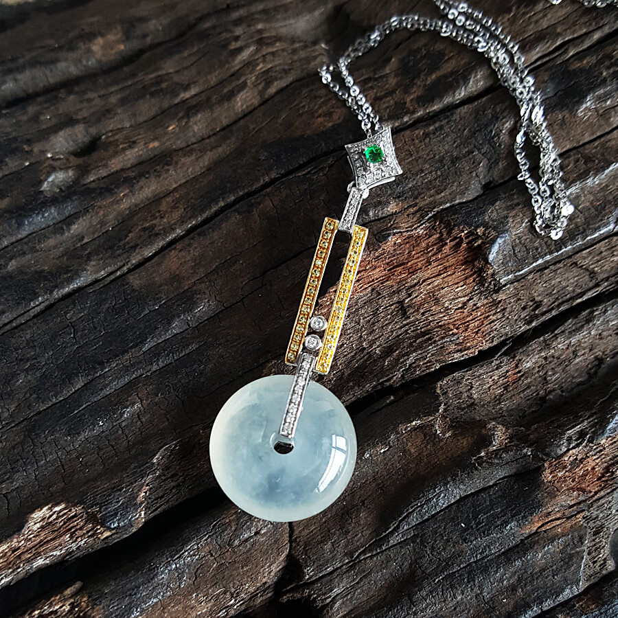 【天然正品】A货翡翠天然高冰种平安扣造型翡翠宝石矿工款AU750精品白金镶钻吊坠项链43.6*15.1*8.1MM 280723NJM22