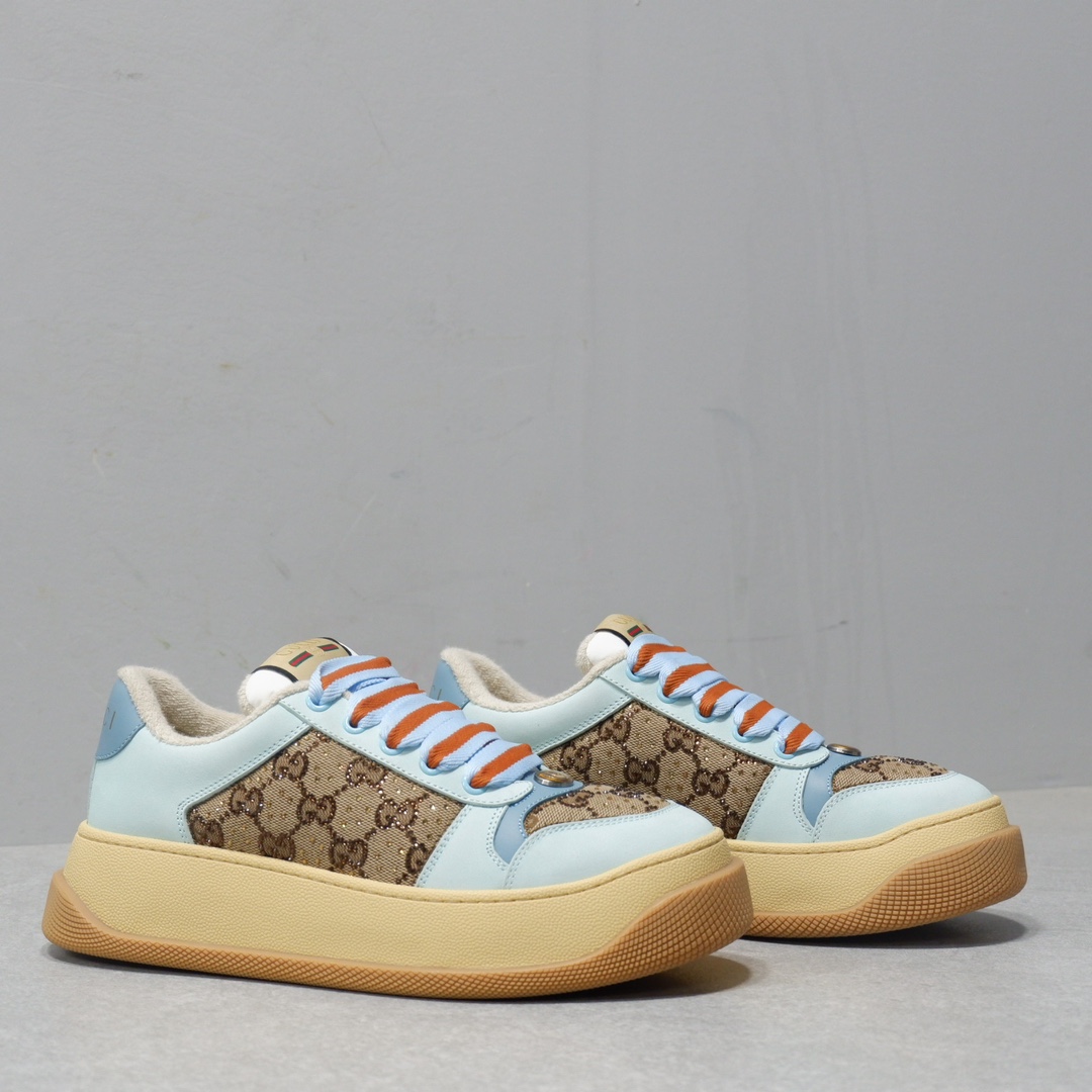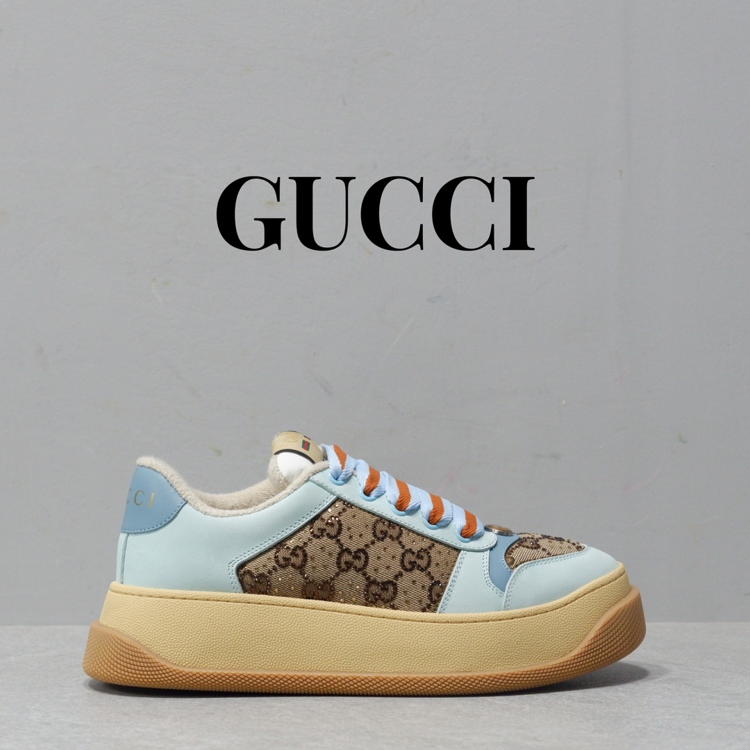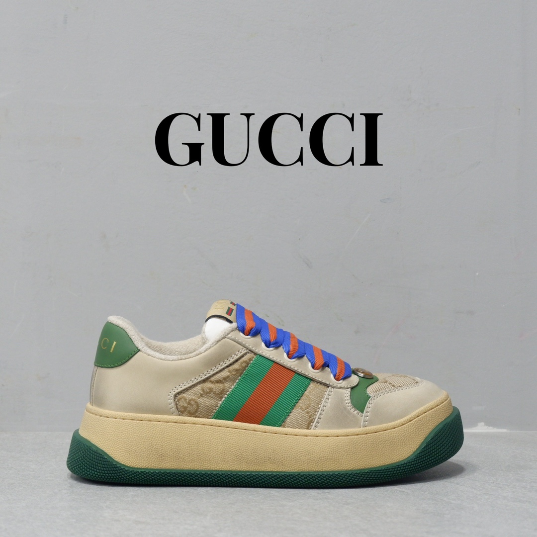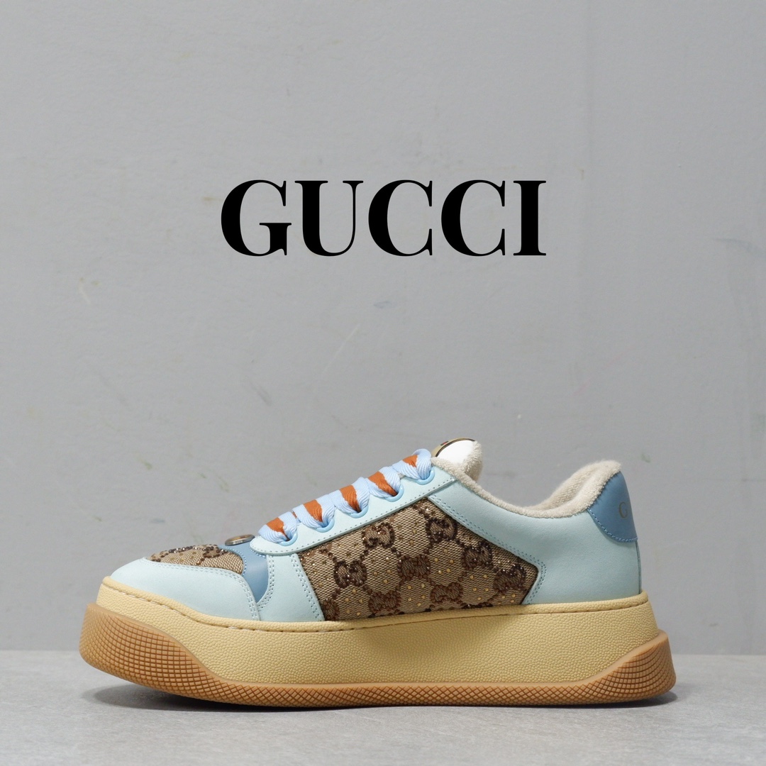 古驰最新款胖嘟嘟厚底脏脏鞋~~情侣款休闲鞋 鞋面擦色牛皮拼接经典双G布面料,毛巾布里细腻吸汗透气,垫脚乳胶注塑一体,私模6cm厚TPU双色底