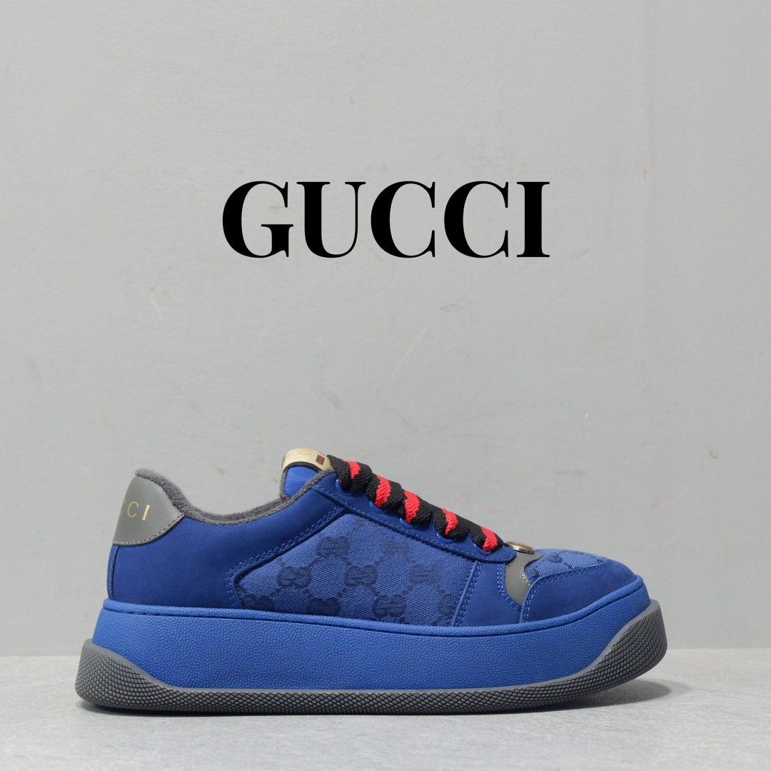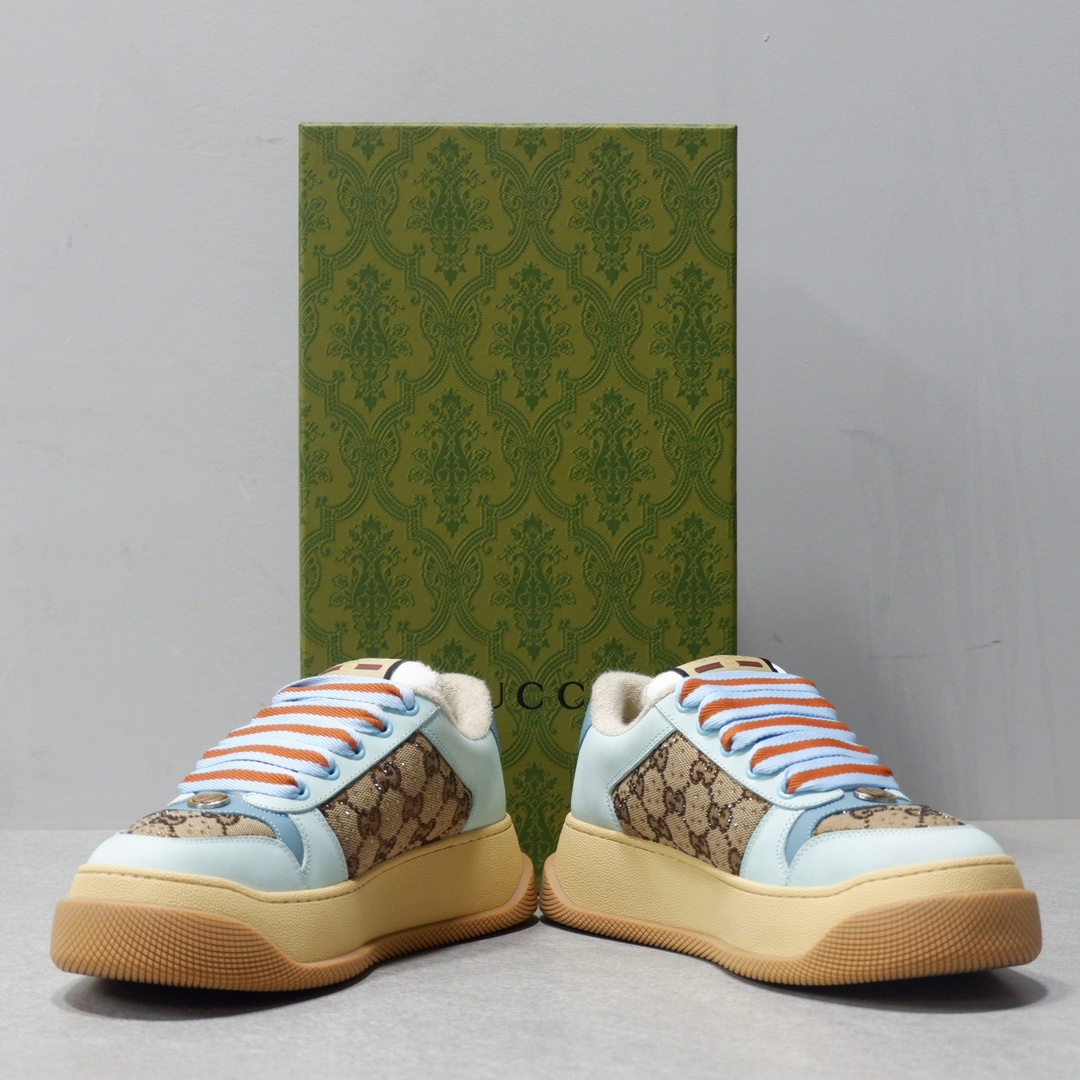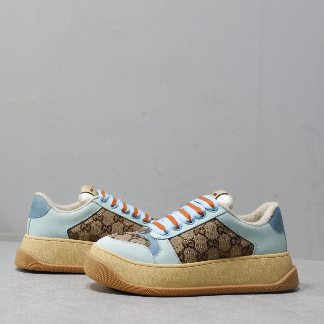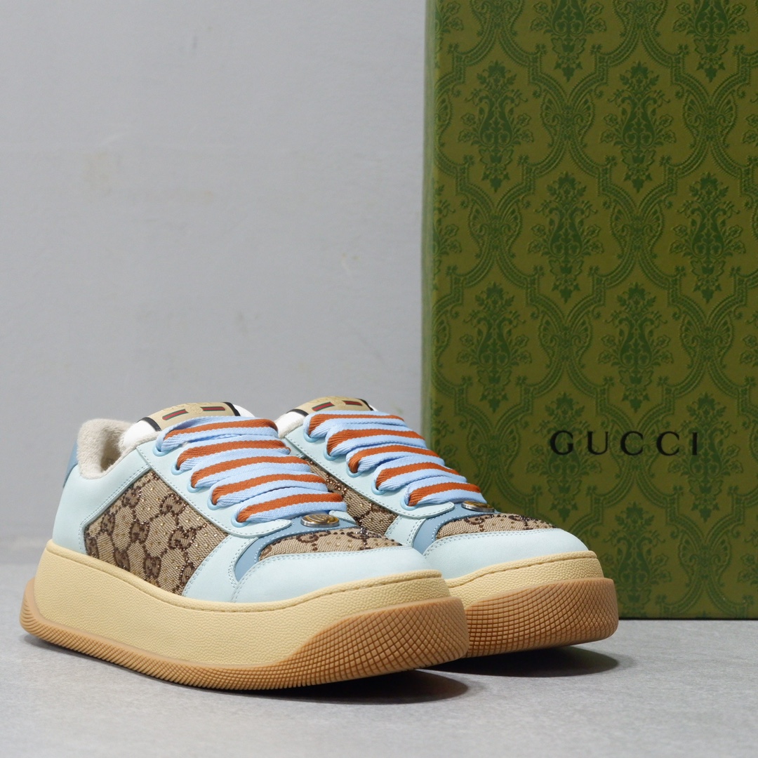 古驰最新款胖嘟嘟厚底脏脏鞋~~情侣款休闲鞋 鞋面擦色牛皮拼接经典双G布面料,毛巾布里细腻吸汗透气,垫脚乳胶注塑一体,私模6cm厚TPU双色底
