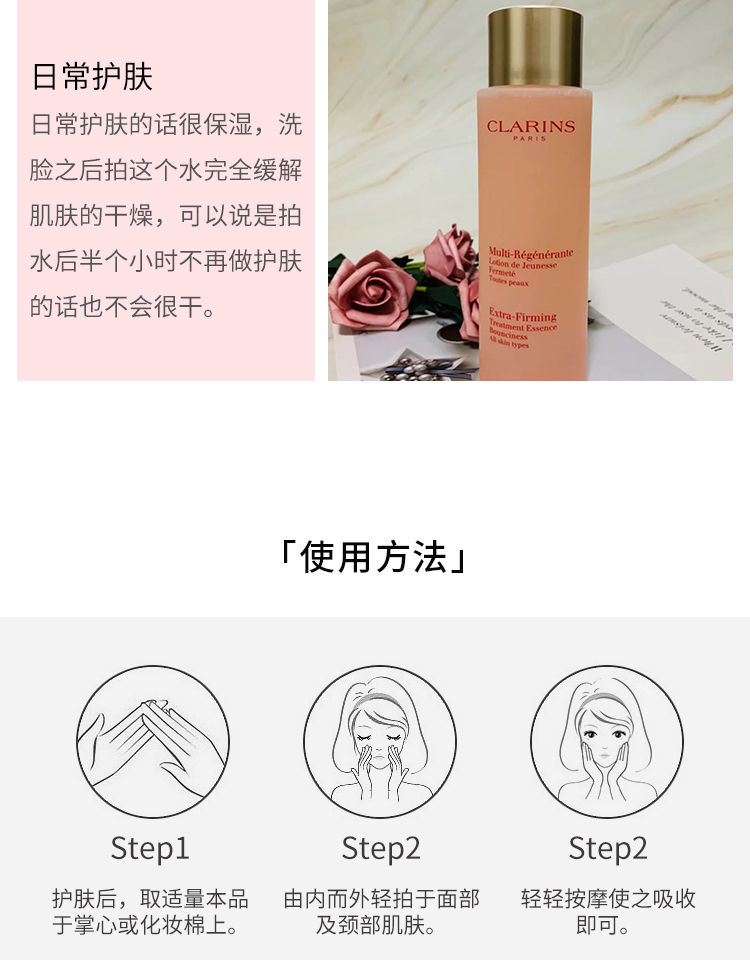 早上及晚上直接以手或以化妆棉沾取适量于清洁后的脸部和颈部,避开眼部。稍后片刻,可再擦上日霜和晚霜。