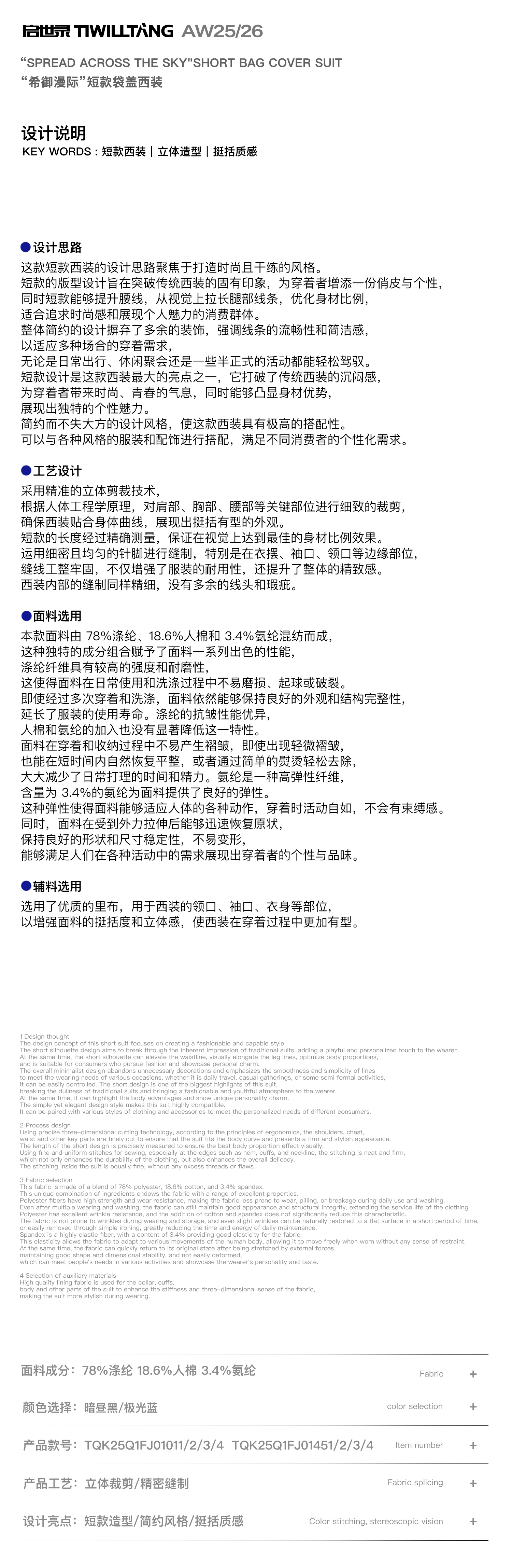 启世录TIWILLTANG“希御漫际”短款挺阔设计感慵懒袋盖西装套装