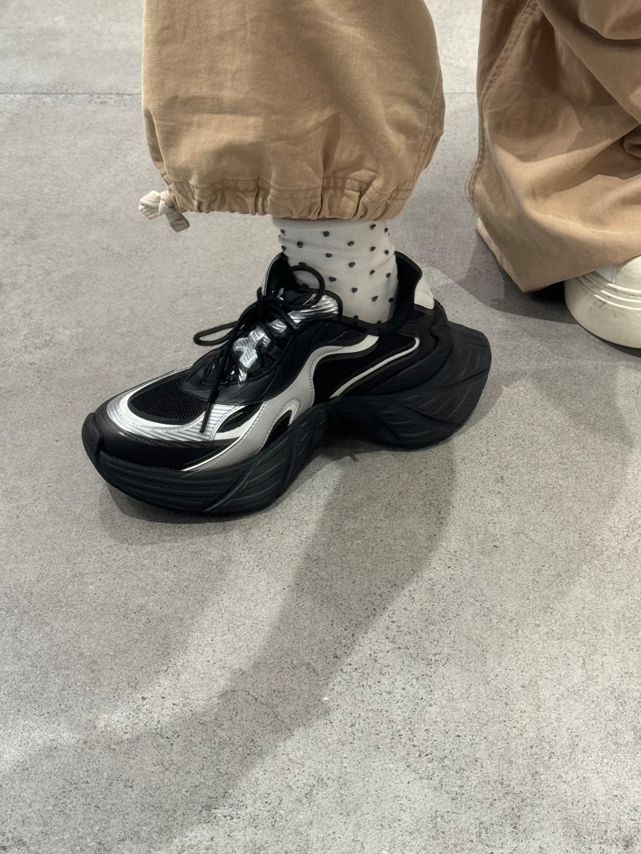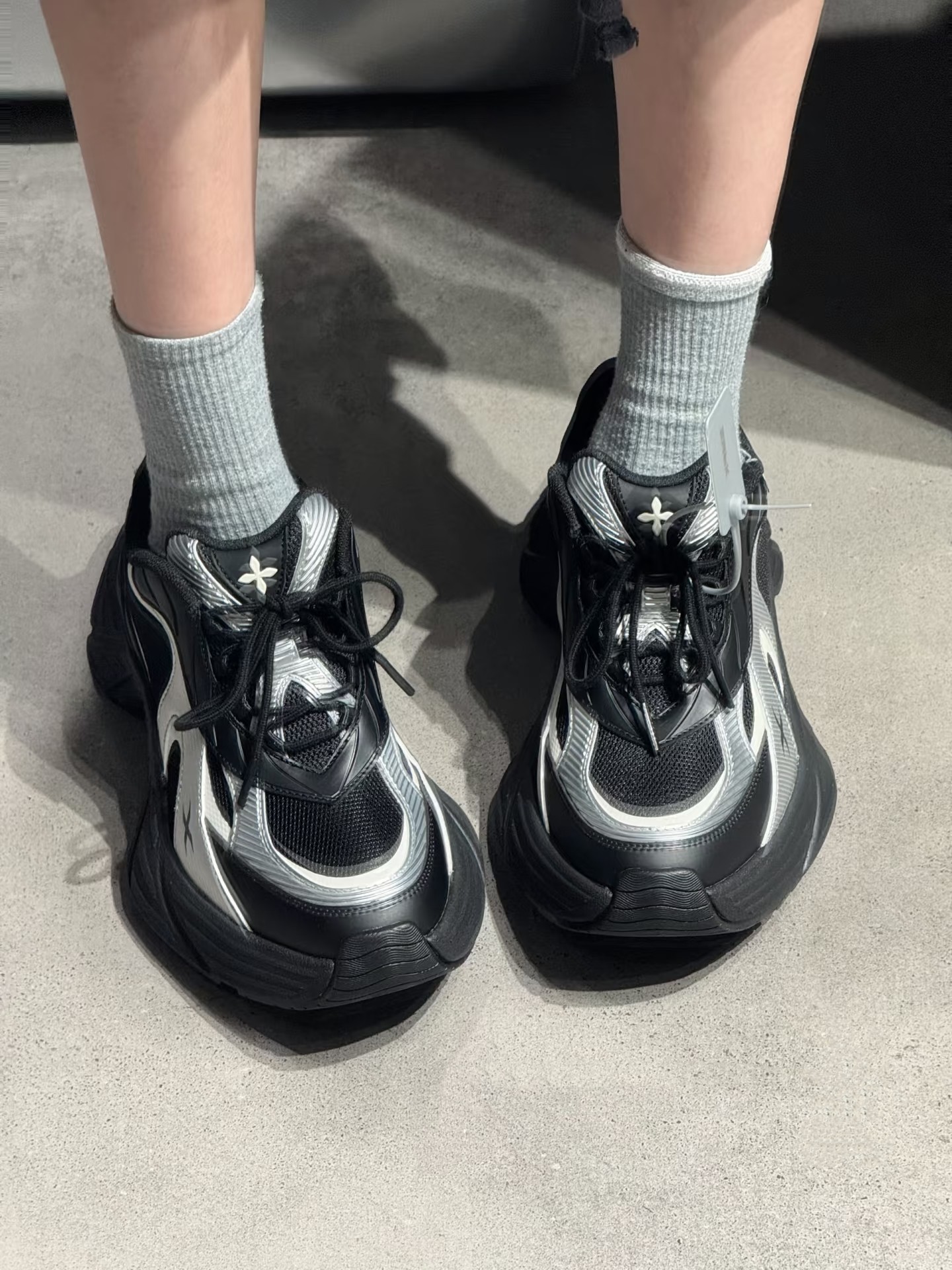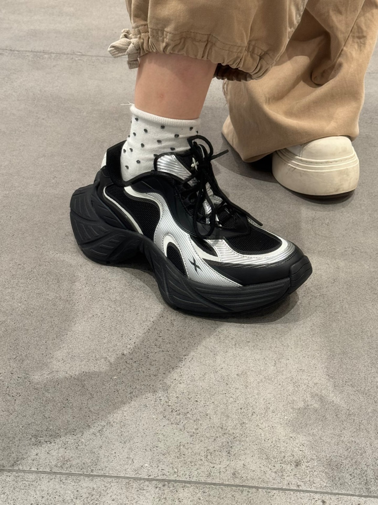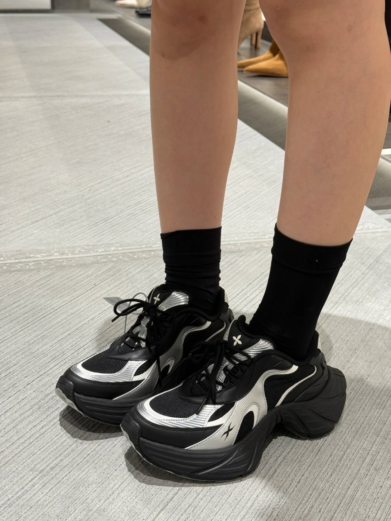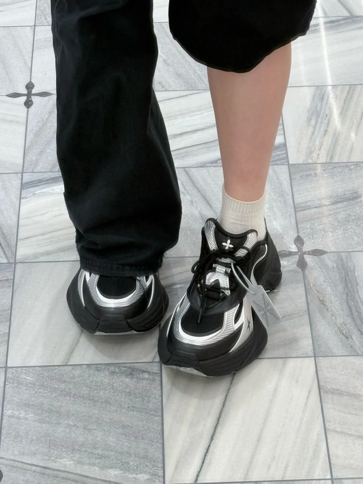 SMFK 25SS新款黑色厚底老爹鞋 采用网面与皮革拼接的材质,兼具透气性与质感。鞋身带有品牌标志性的十字花装饰,辨识度高,黑银配色酷感十足,充满未来科技感。 厚底老爹鞋款式,在提升时尚感的同时,还能起到显著的增高效果;系带设计贴合脚型,穿着舒适且便于调节松紧。融合了运动风与潮流感,既适合日常休闲,又能为造型增添个性与前卫感。 鞋面:网面/特殊工艺 内里:弹力网 大底:橡胶组合 Size:35-39(40定制不退换)