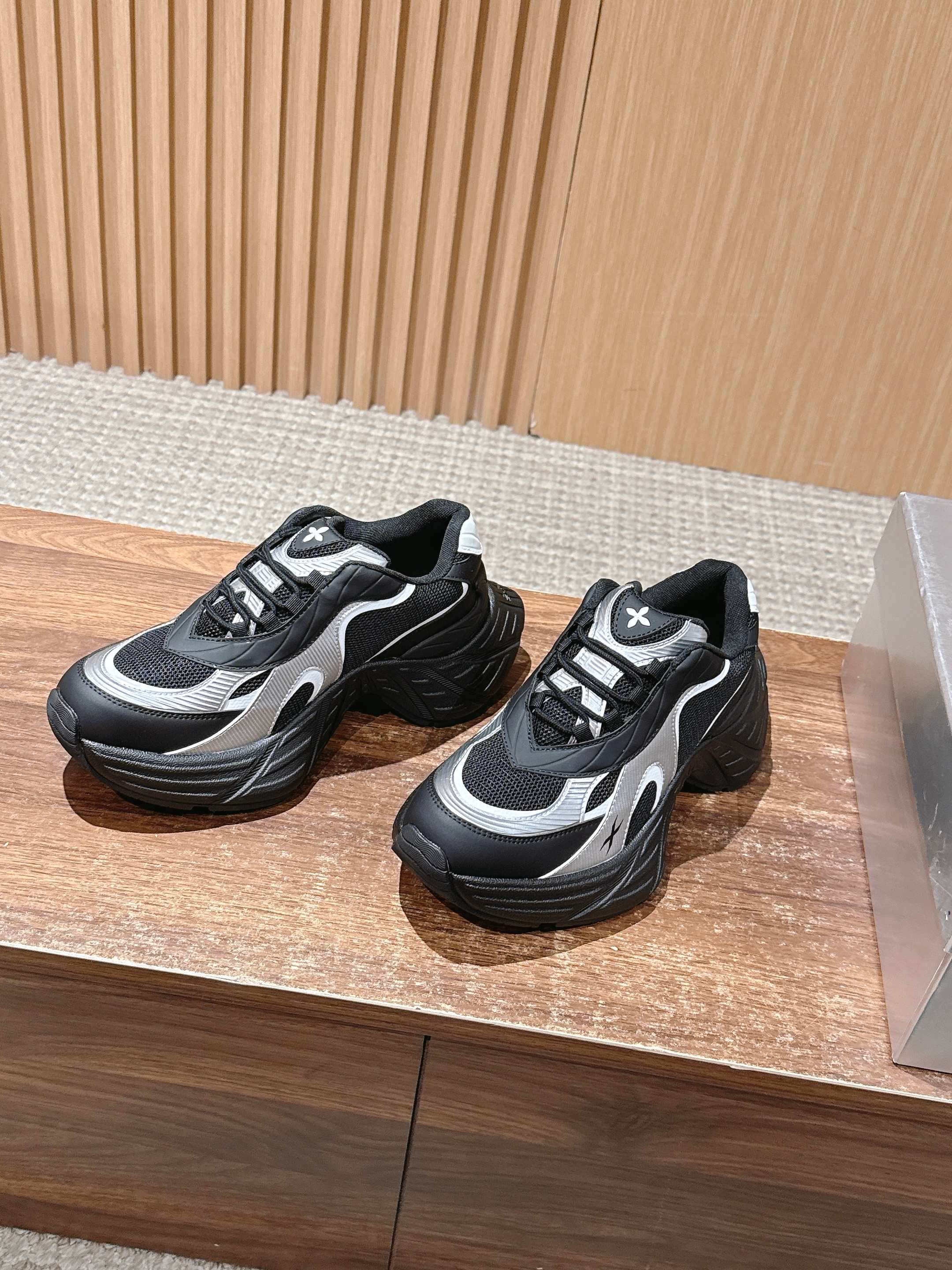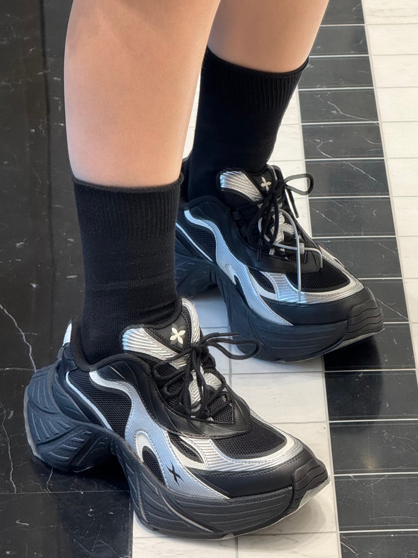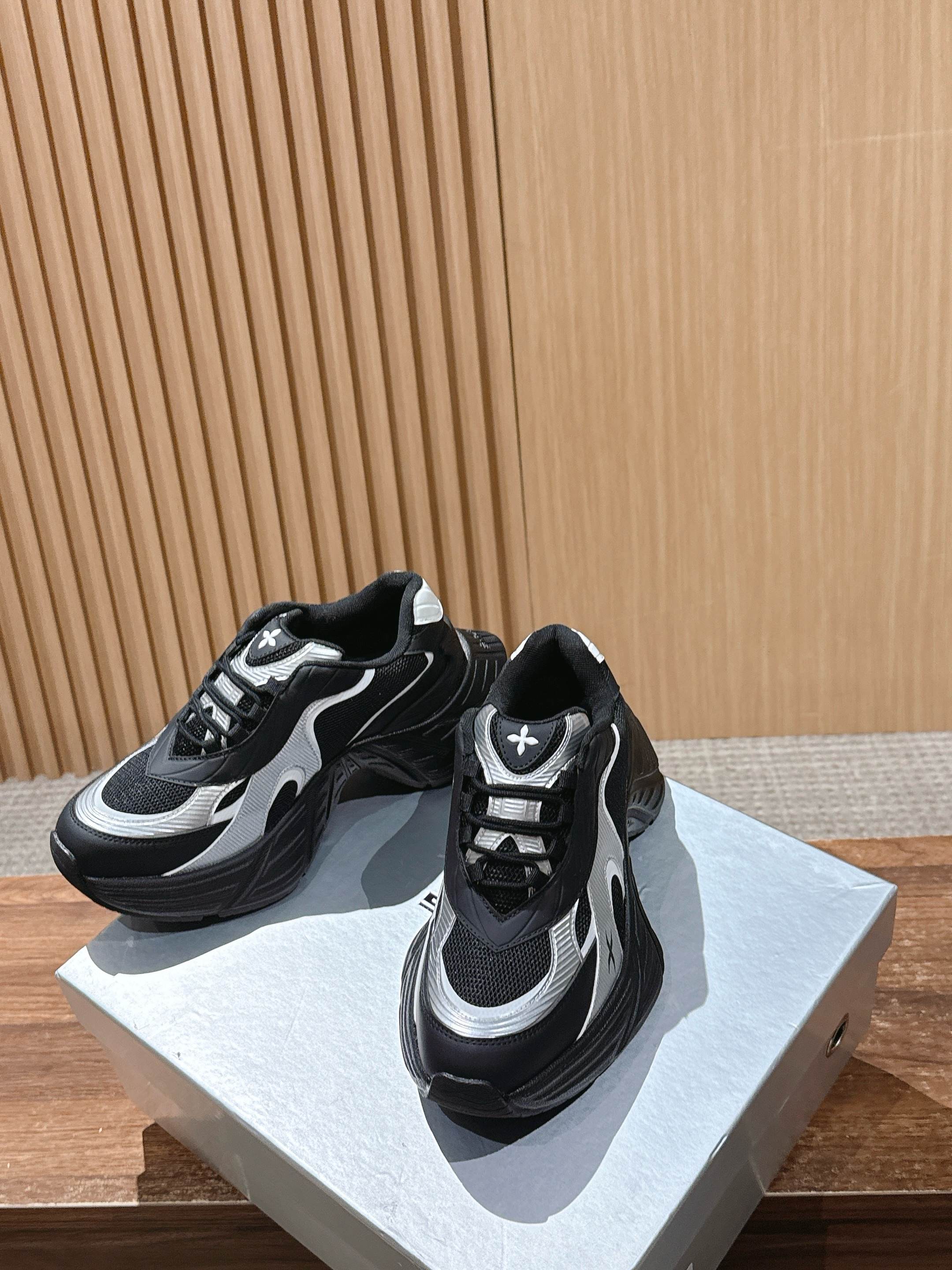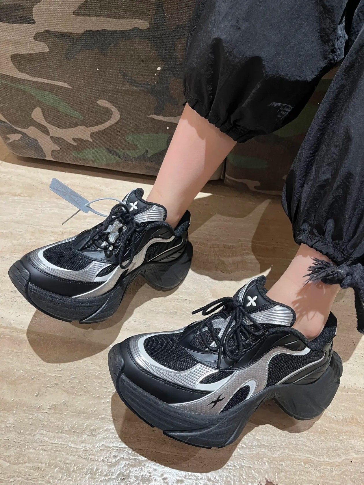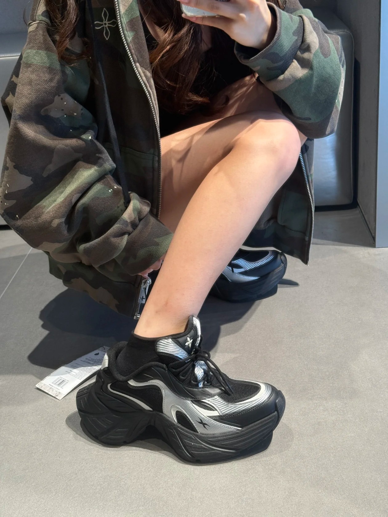SMFK 25SS新款黑色厚底老爹鞋 采用网面与皮革拼接的材质,兼具透气性与质感。鞋身带有品牌标志性的十字花装饰,辨识度高,黑银配色酷感十足,充满未来科技感。 厚底老爹鞋款式,在提升时尚感的同时,还能起到显著的增高效果;系带设计贴合脚型,穿着舒适且便于调节松紧。融合了运动风与潮流感,既适合日常休闲,又能为造型增添个性与前卫感。 鞋面:网面/特殊工艺 内里:弹力网 大底:橡胶组合 Size:35-39(40定制不退换)