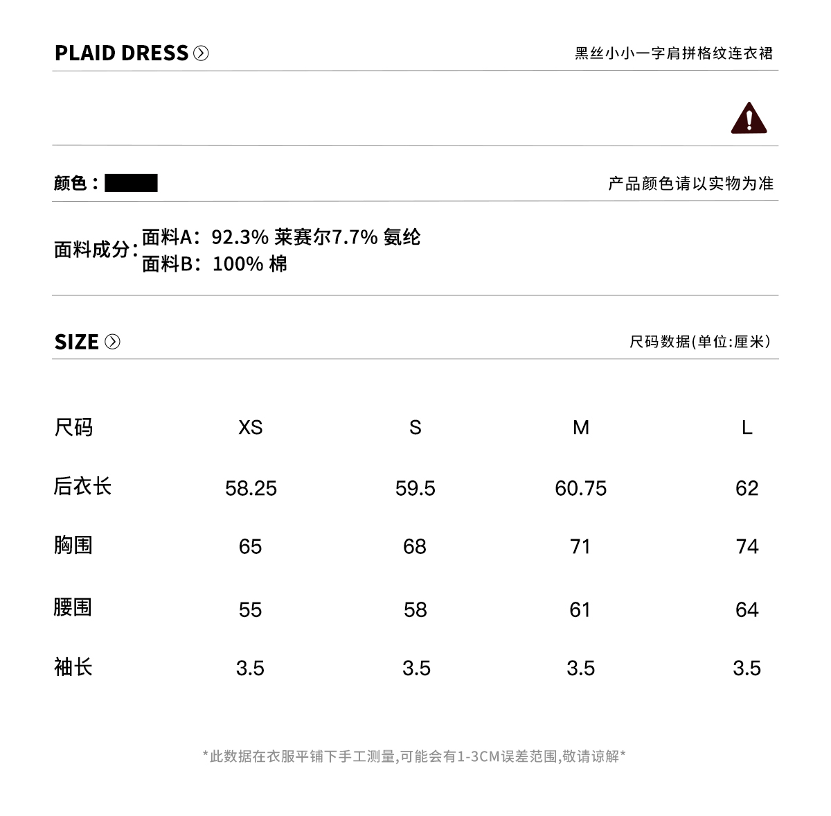 Ariseism 美式复古设计感黑色一字肩拼格纹连衣裙女夏季新款裙子