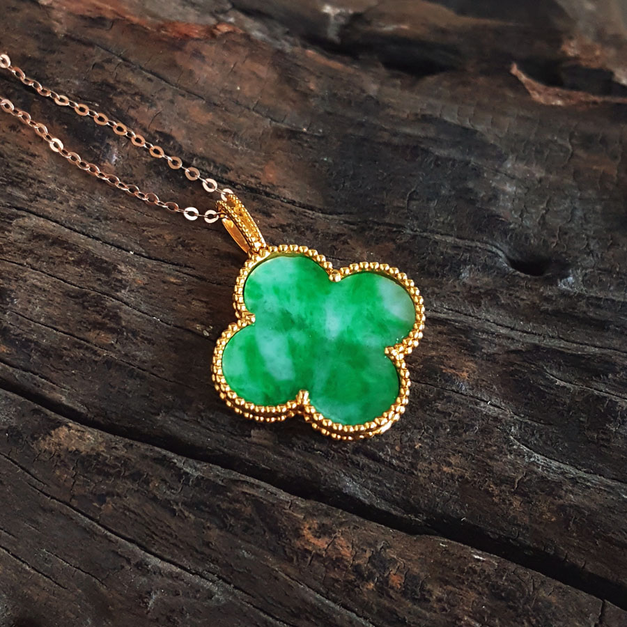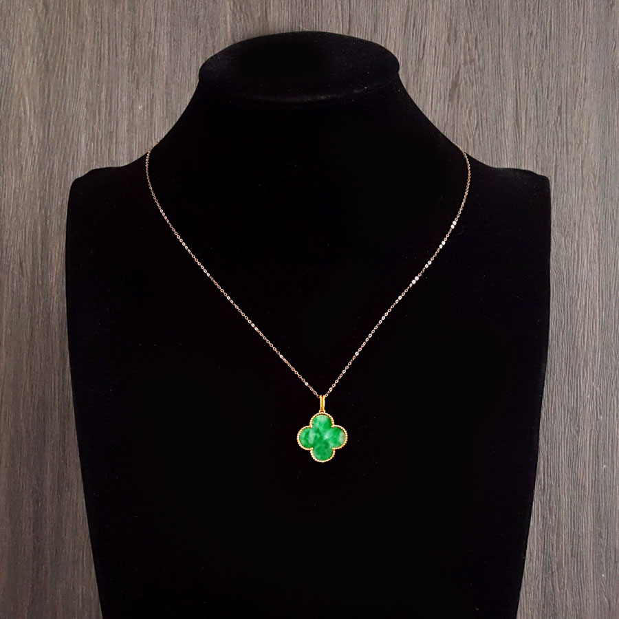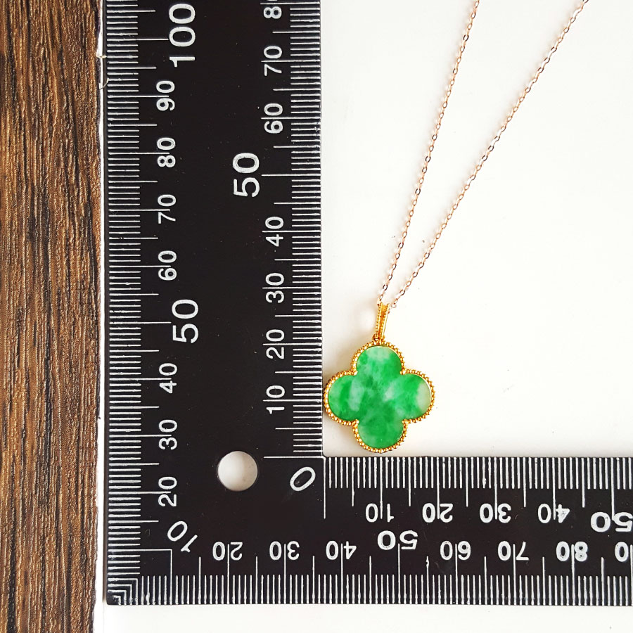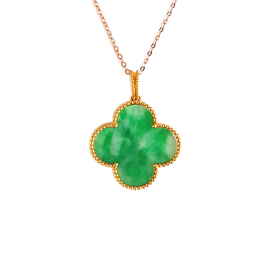 名称 | AU375黄金镶天然糯种绿色幸运四叶草造型翡翠吊坠项链 |