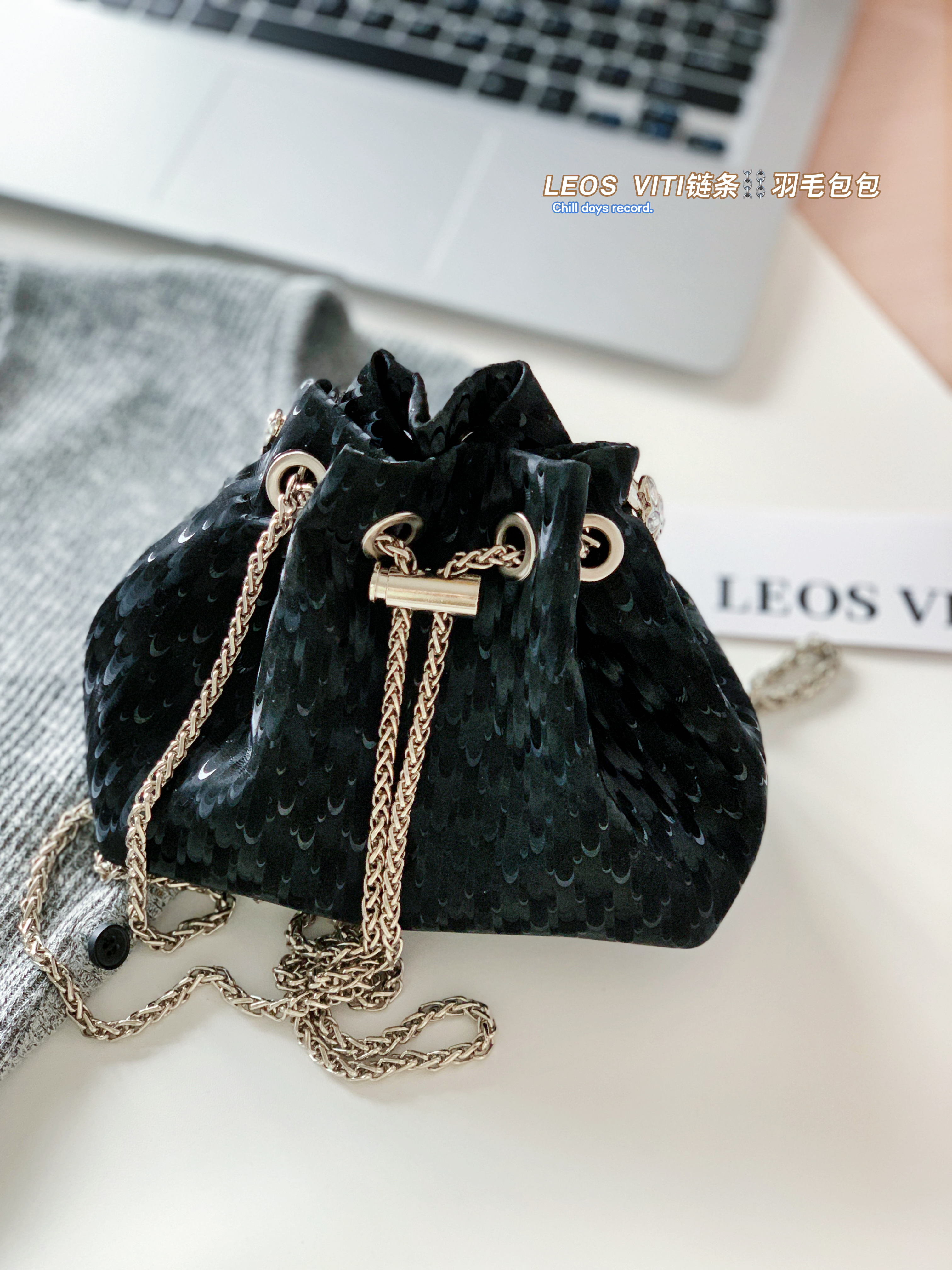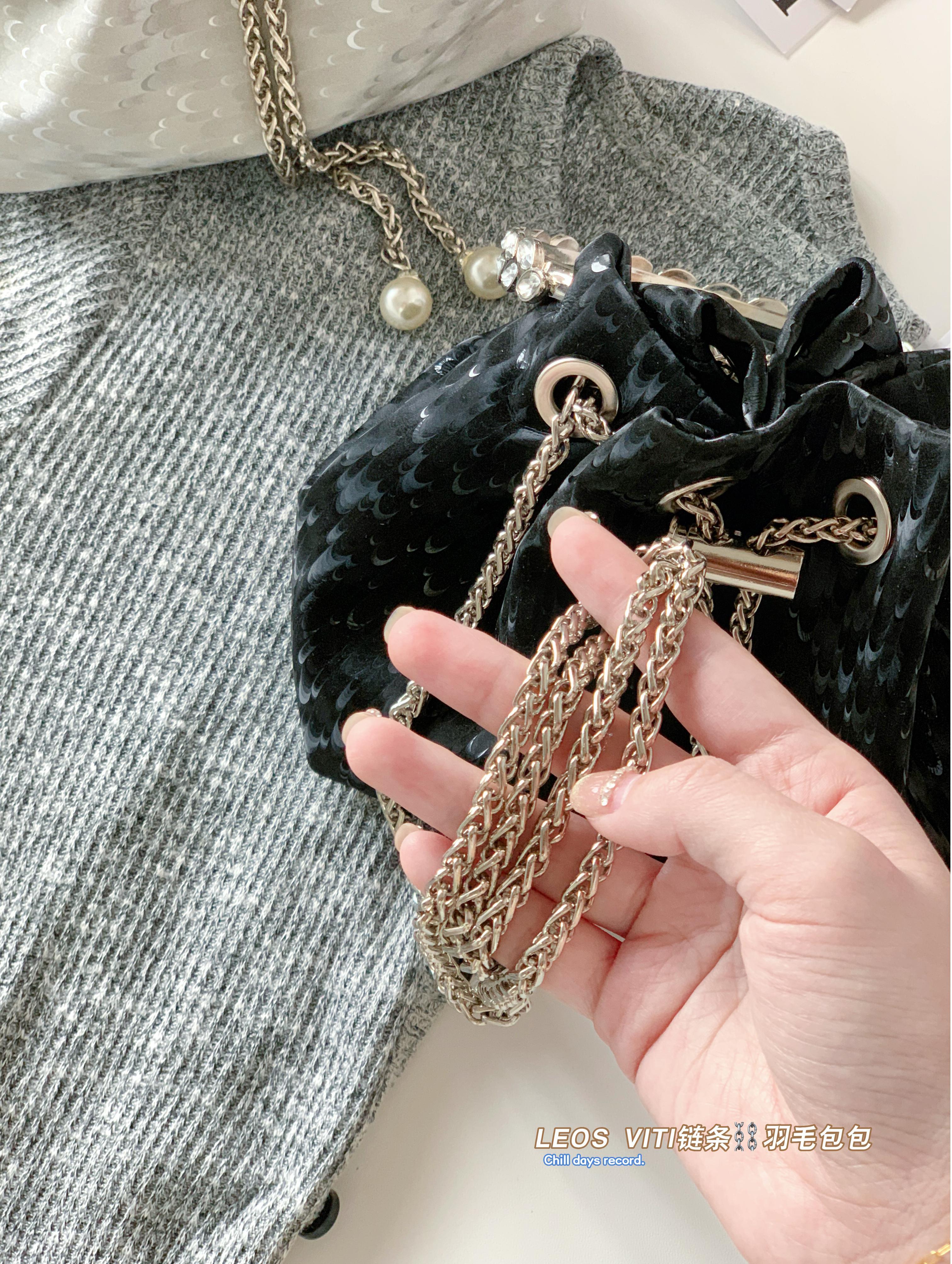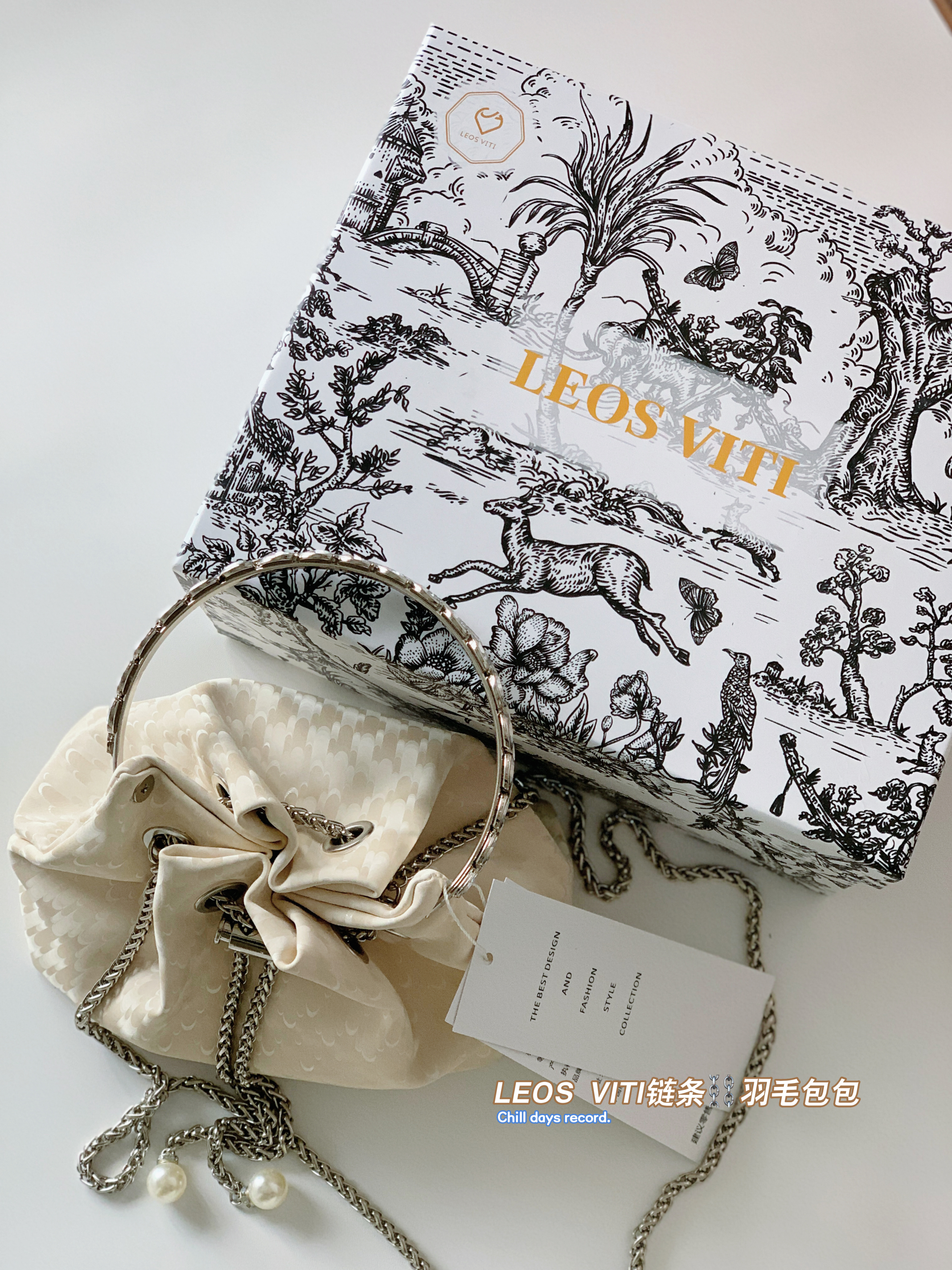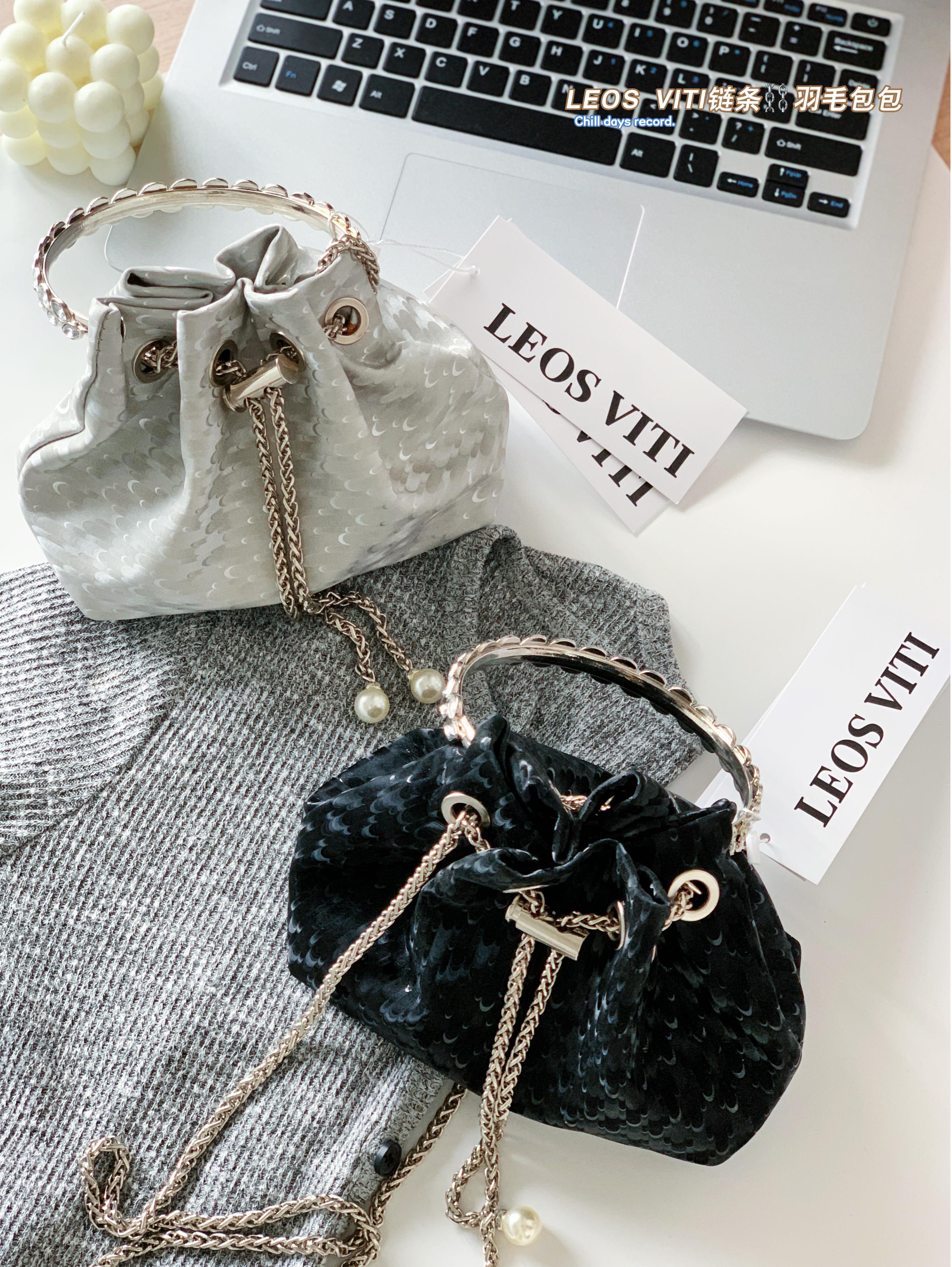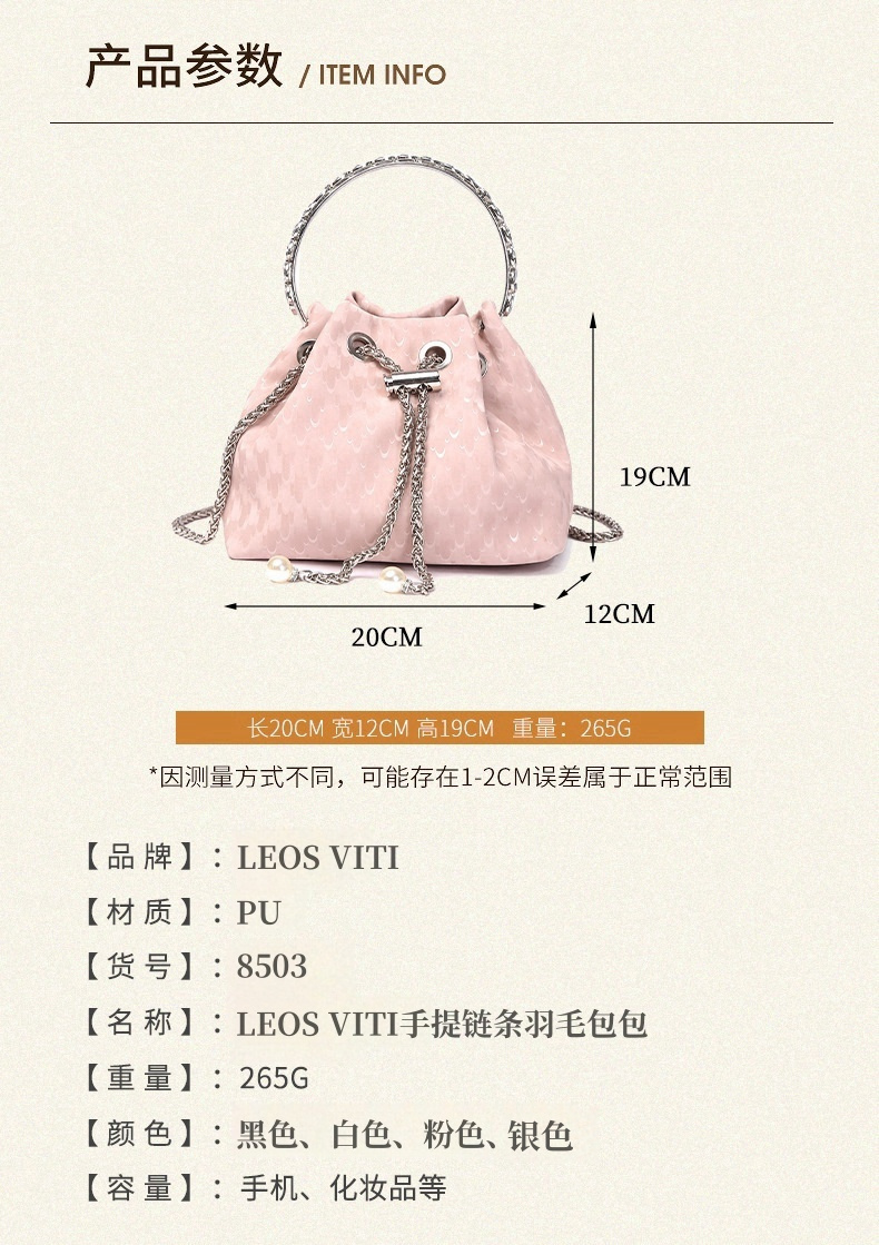 【品名】Leos Viti链条羽毛包包【颜色】黑色、白色、粉色、银色【材质】pu【尺寸】长20cm 厚度12cm 高度19cm【发货地】广州