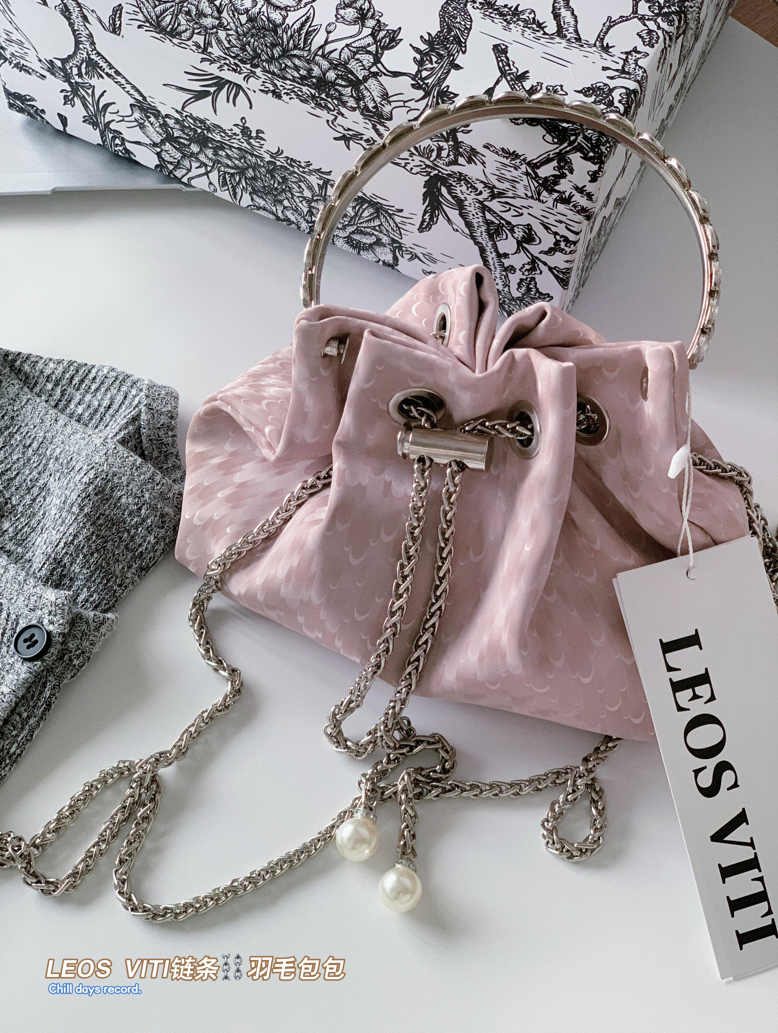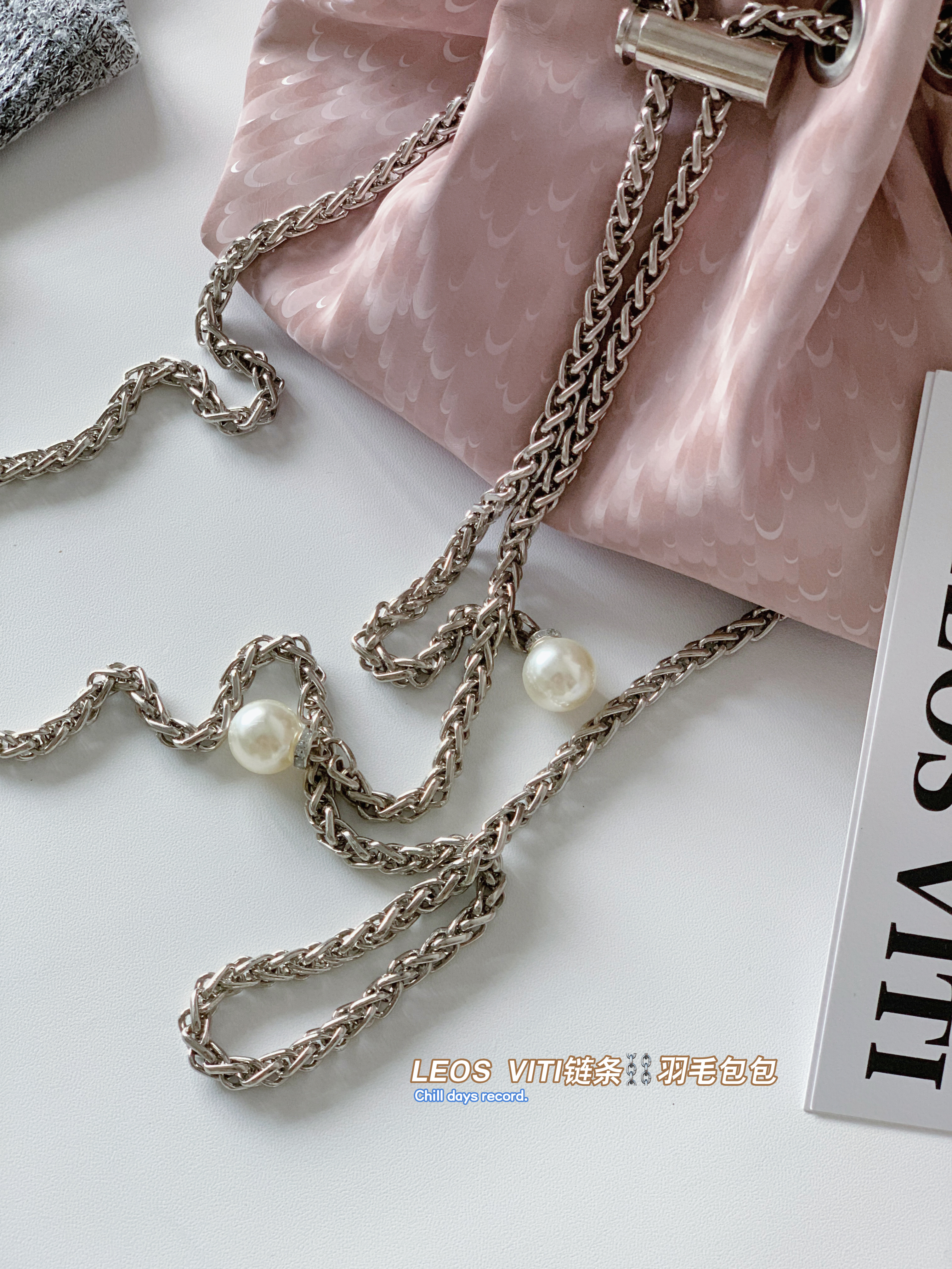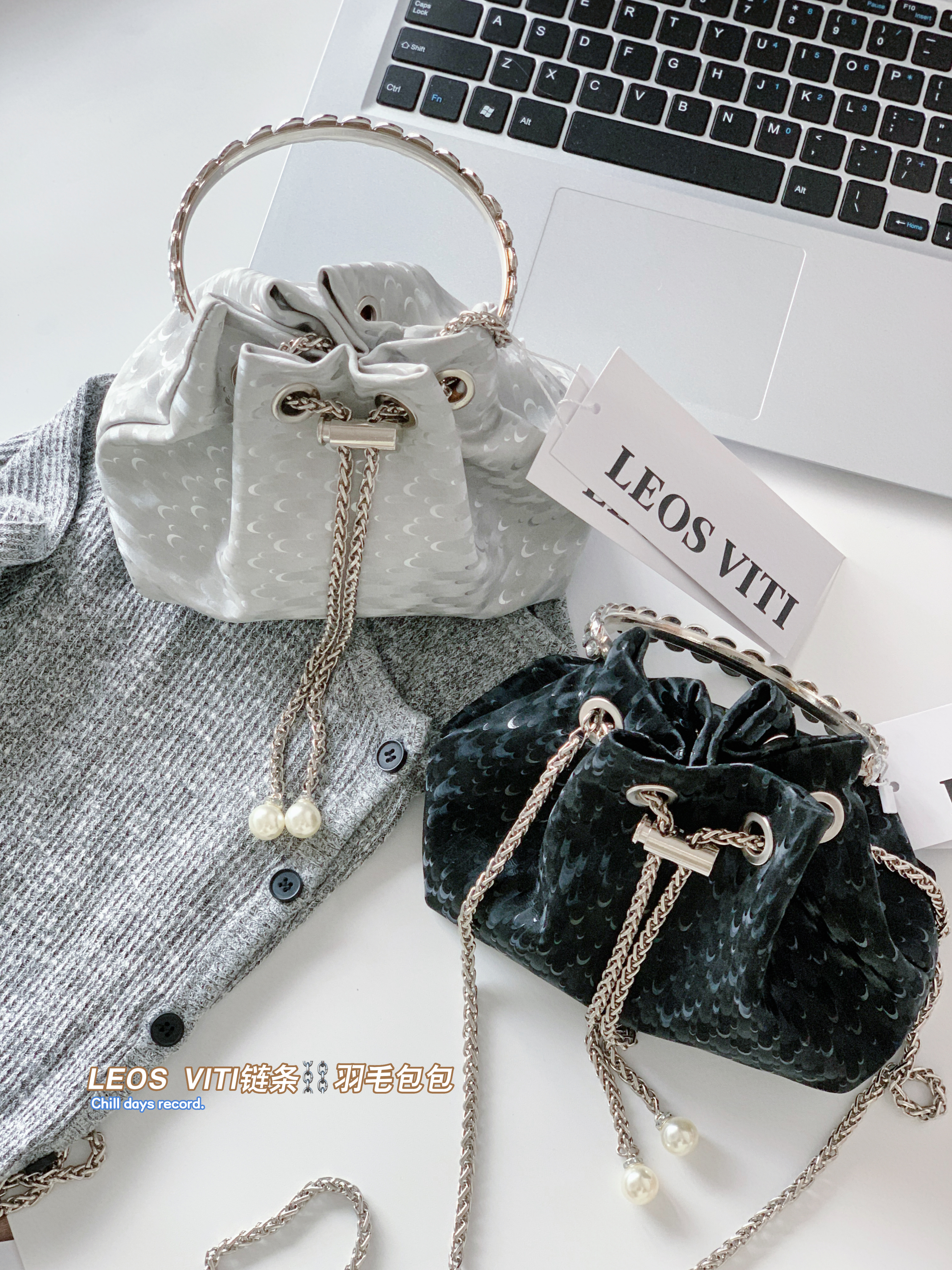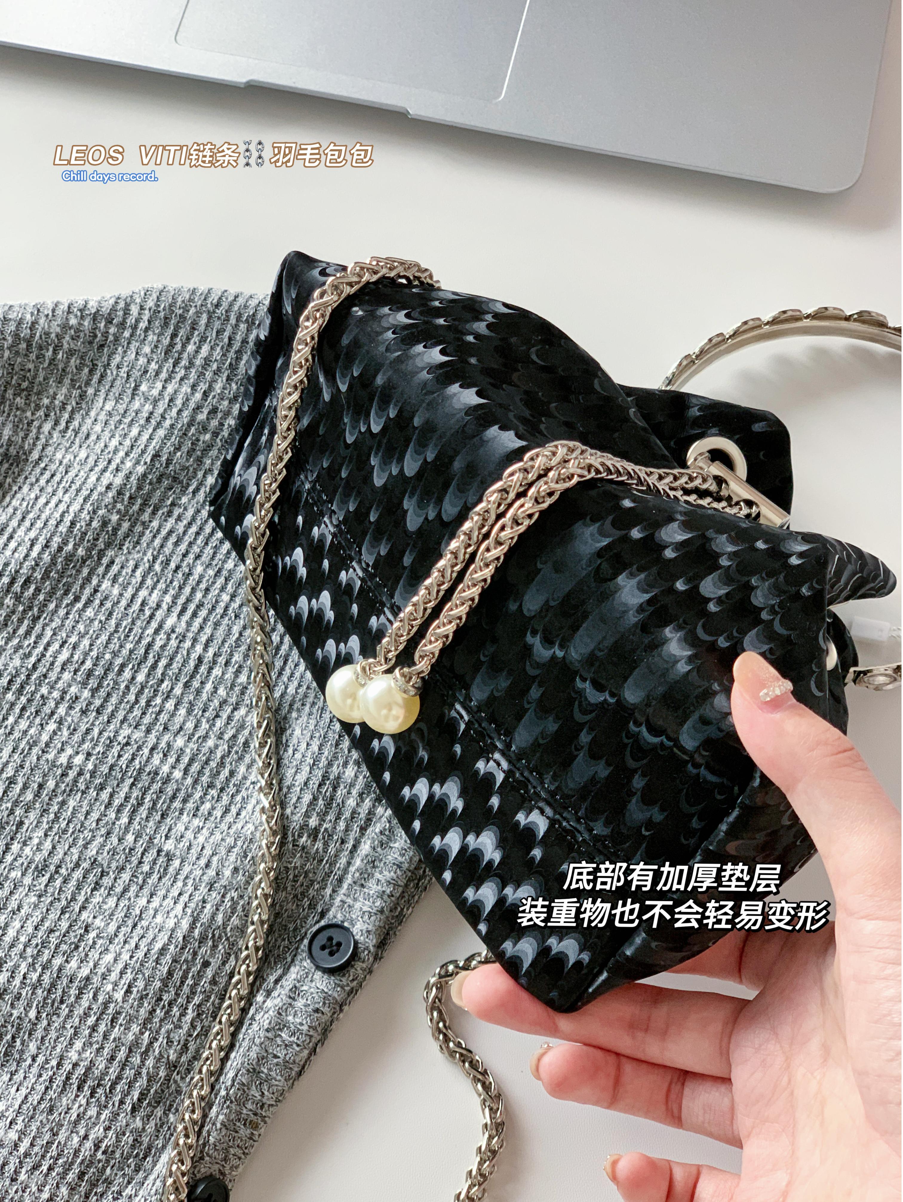 【品名】Leos Viti链条羽毛包包【颜色】黑色、白色、粉色、银色【材质】pu【尺寸】长20cm 厚度12cm 高度19cm【发货地】广州