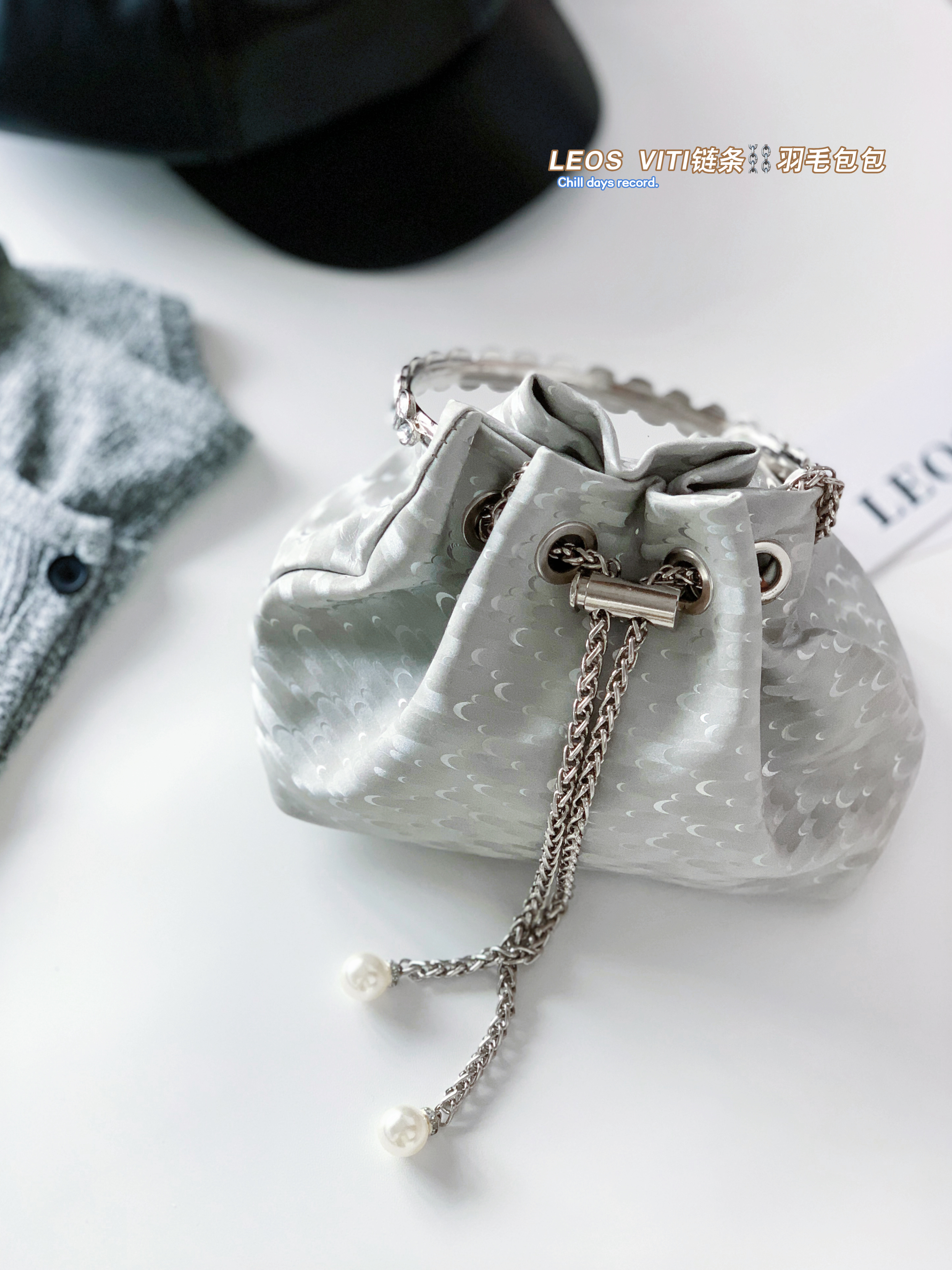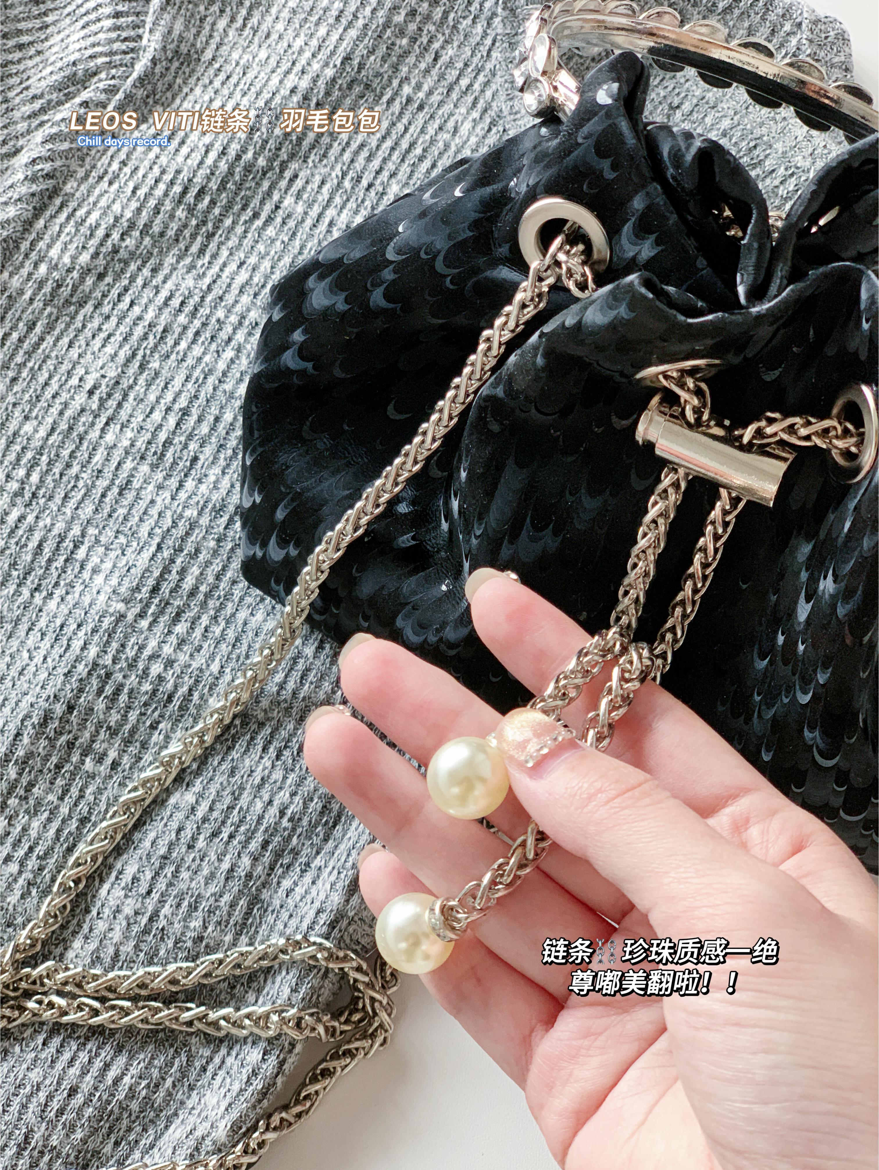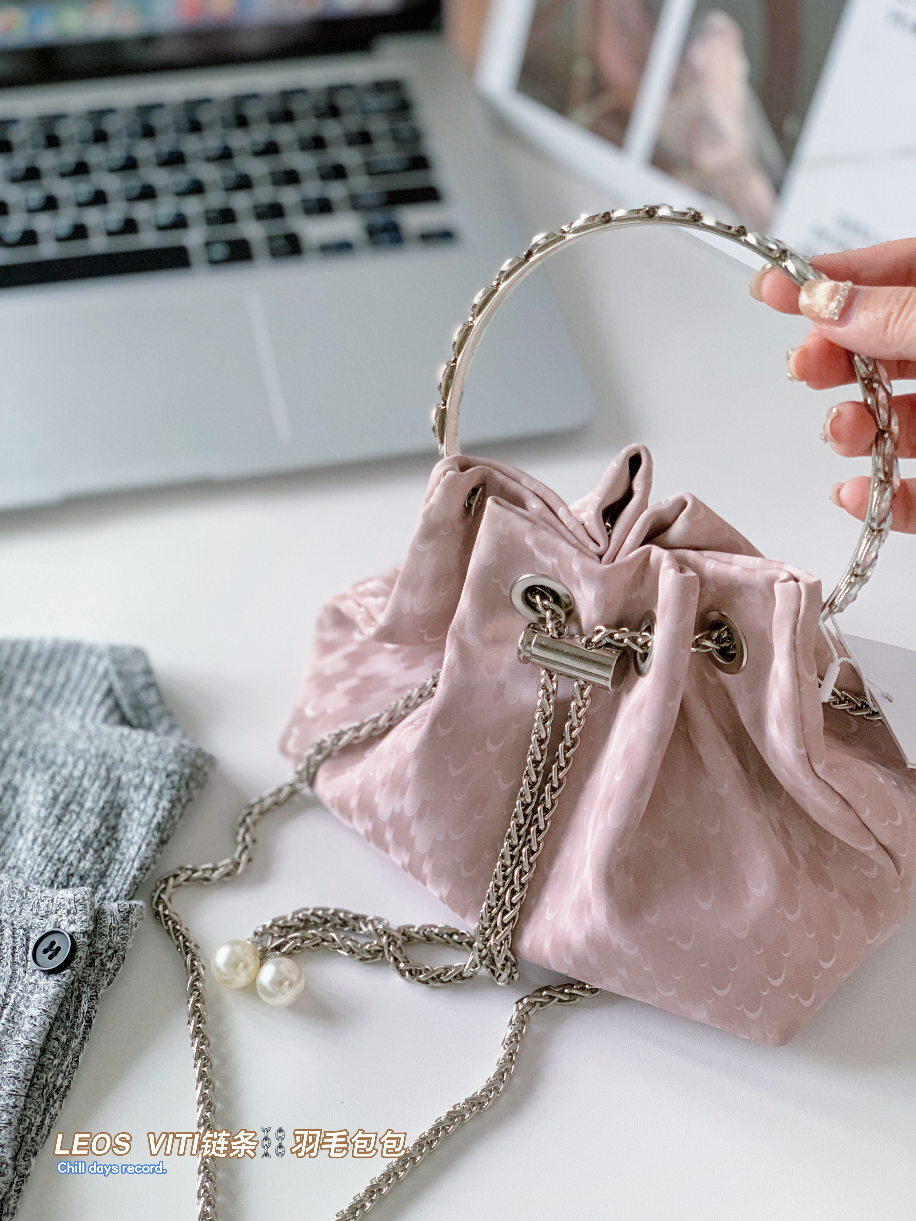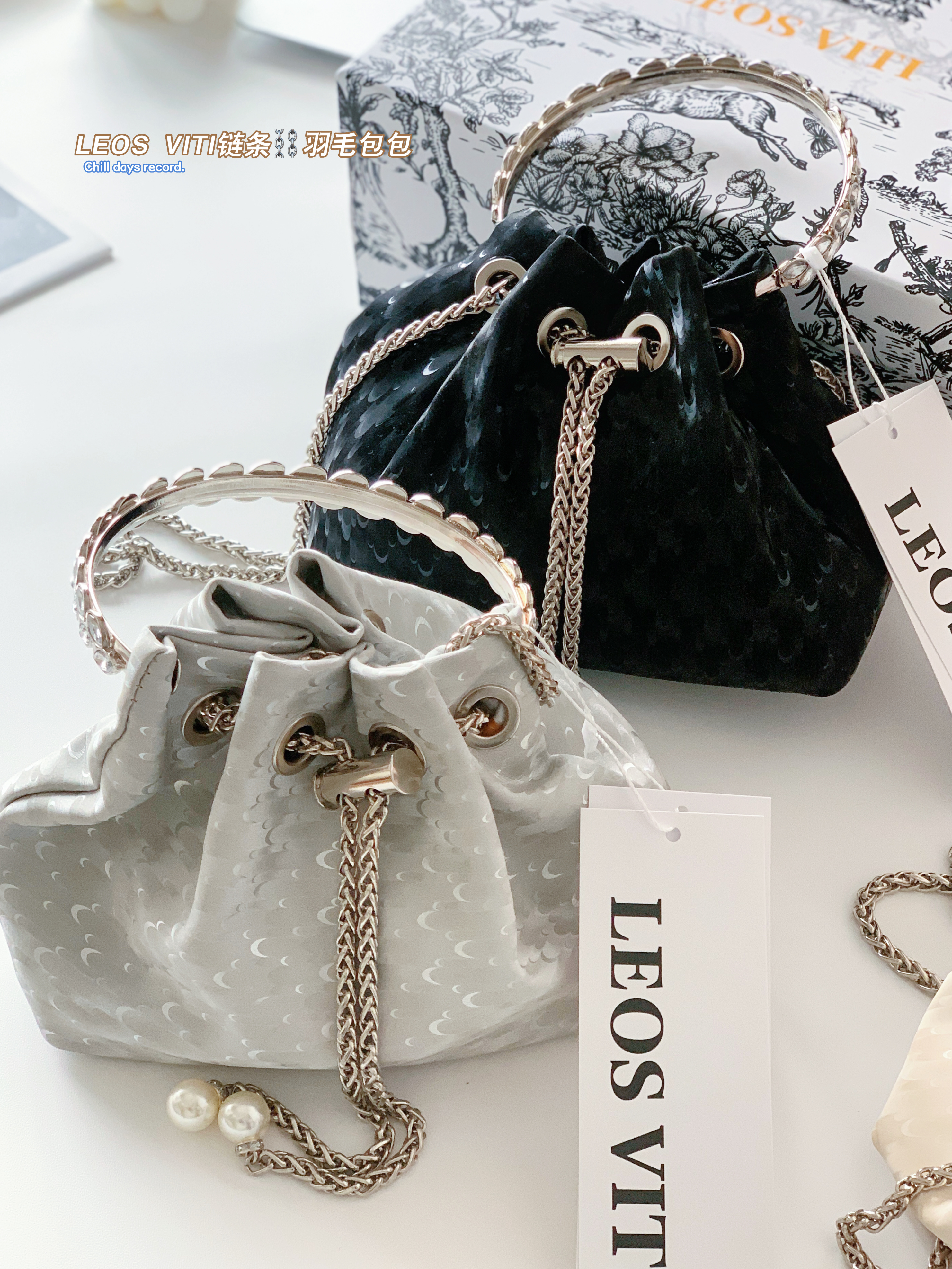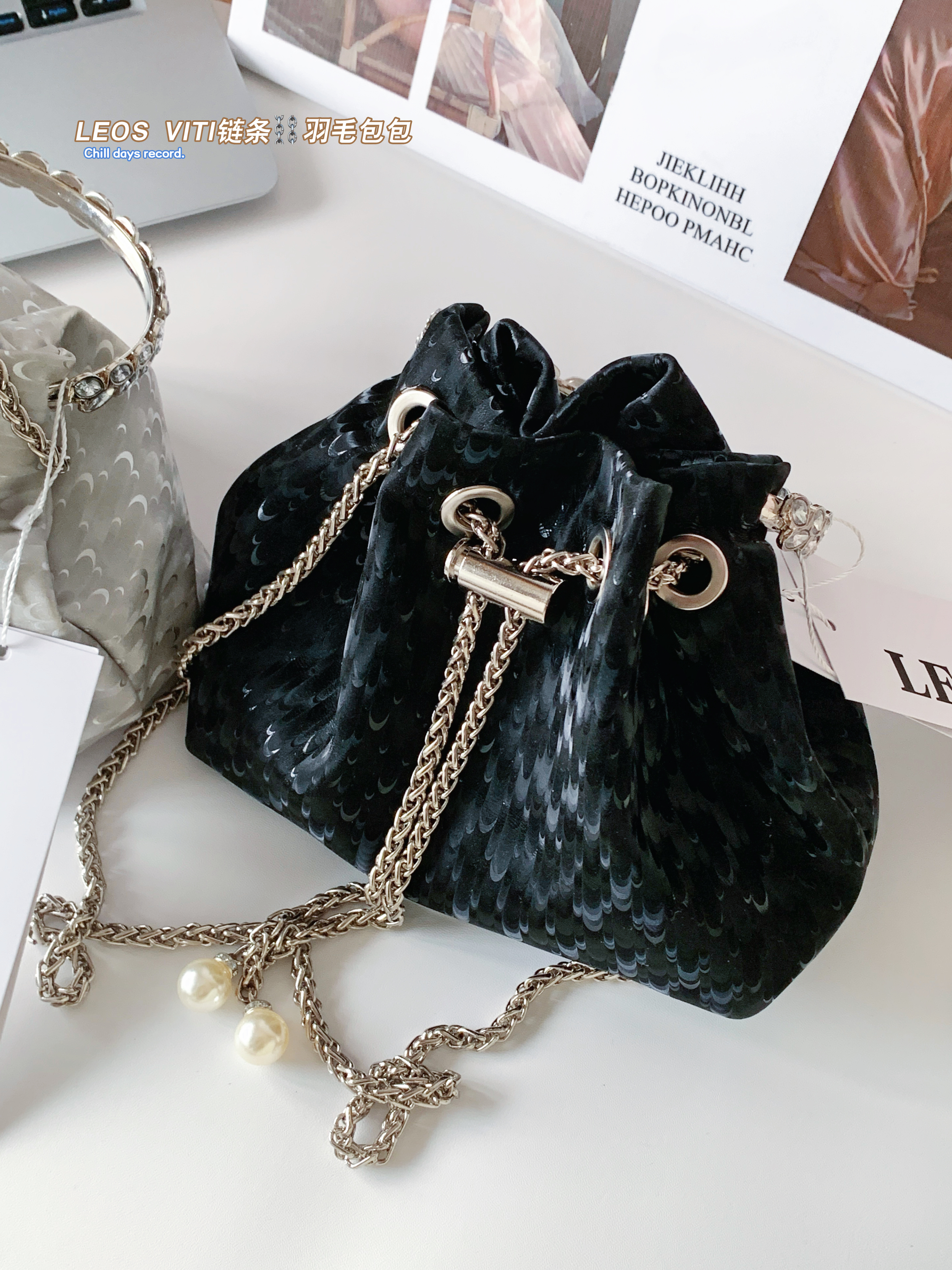【品名】Leos Viti链条羽毛包包【颜色】黑色、白色、粉色、银色【材质】pu【尺寸】长20cm 厚度12cm 高度19cm【发货地】广州