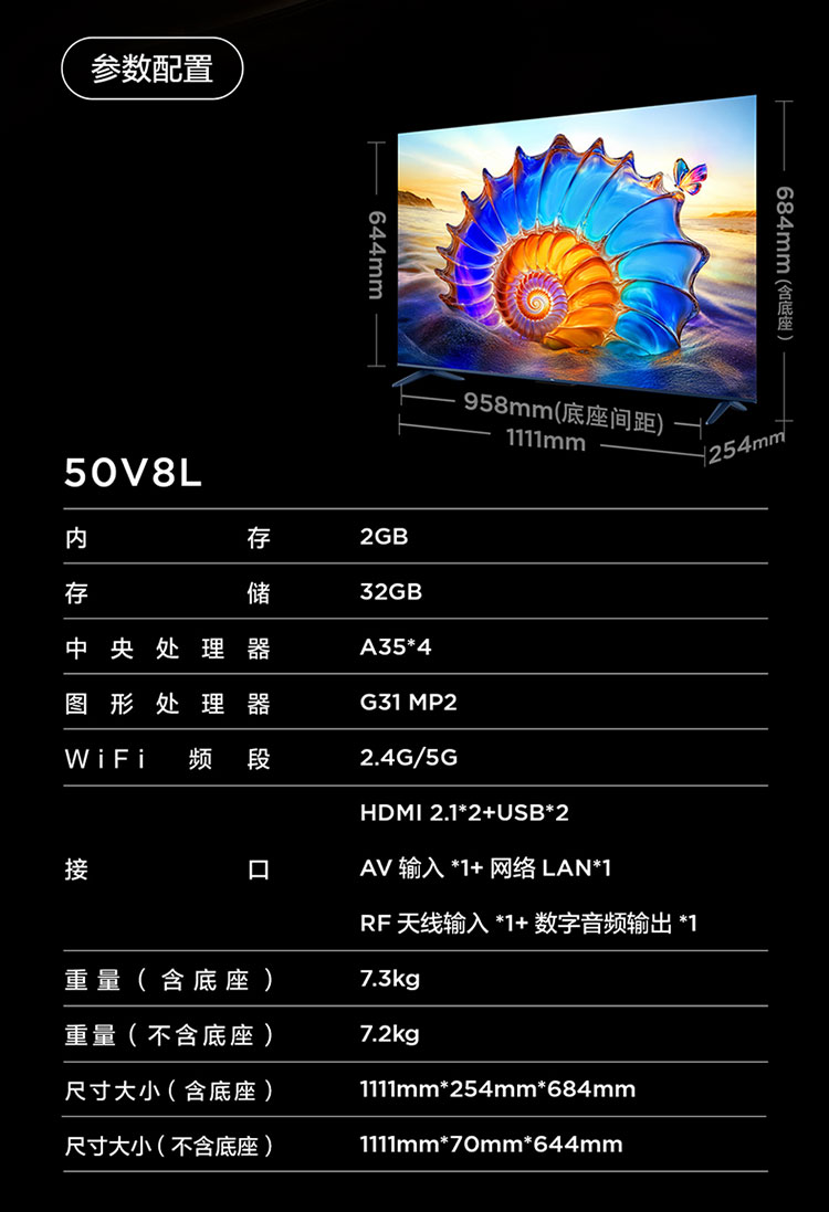 TCL电视 50V8L 50英寸 2GB+32GB大内存 护眼 AI语音 投屏电视
