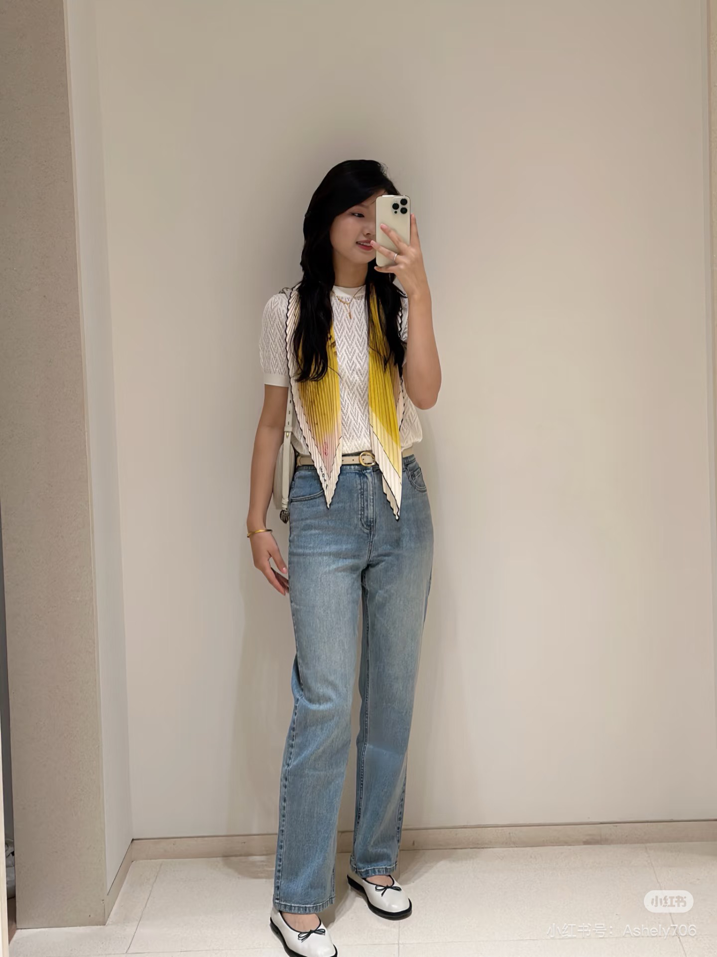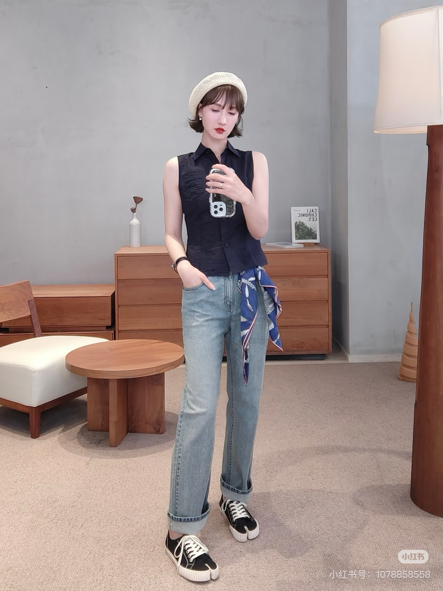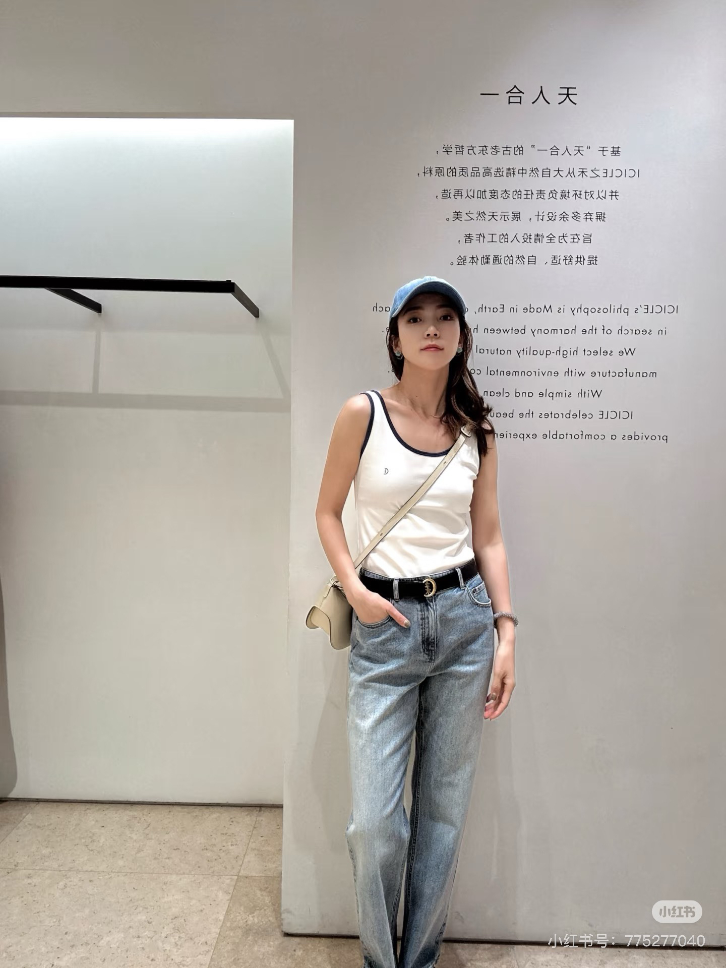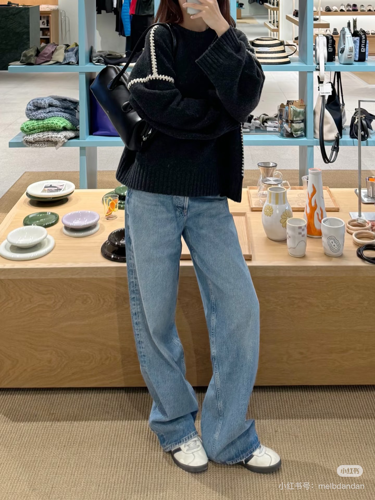 浅蓝水洗牛仔,做旧纹理自带复古滤镜,高腰直筒,悄悄拉长腿部线条,梨形身材也能穿出“腿精”既视感