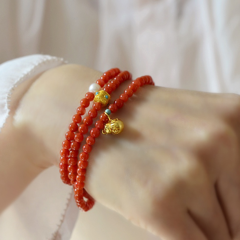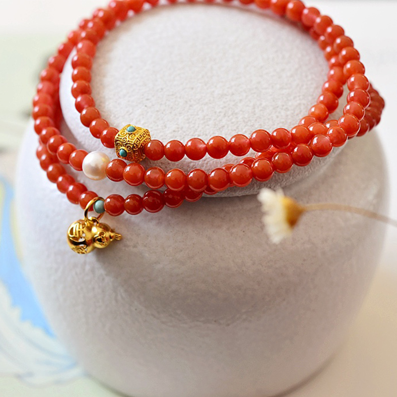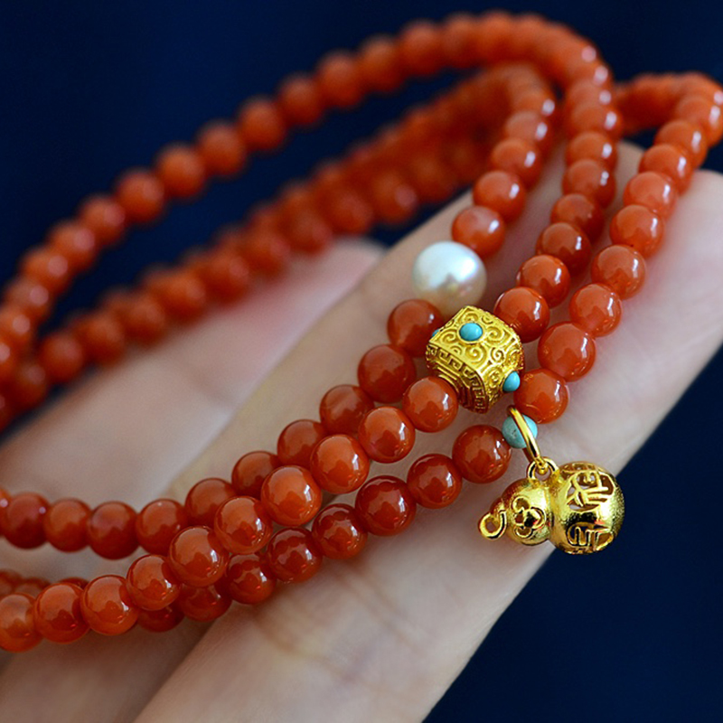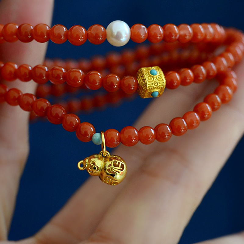 天然南红5+,天然淡水珍珠,天然绿松,天然蜜蜡,古法银鎏金配饰