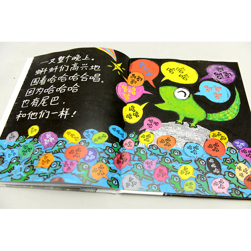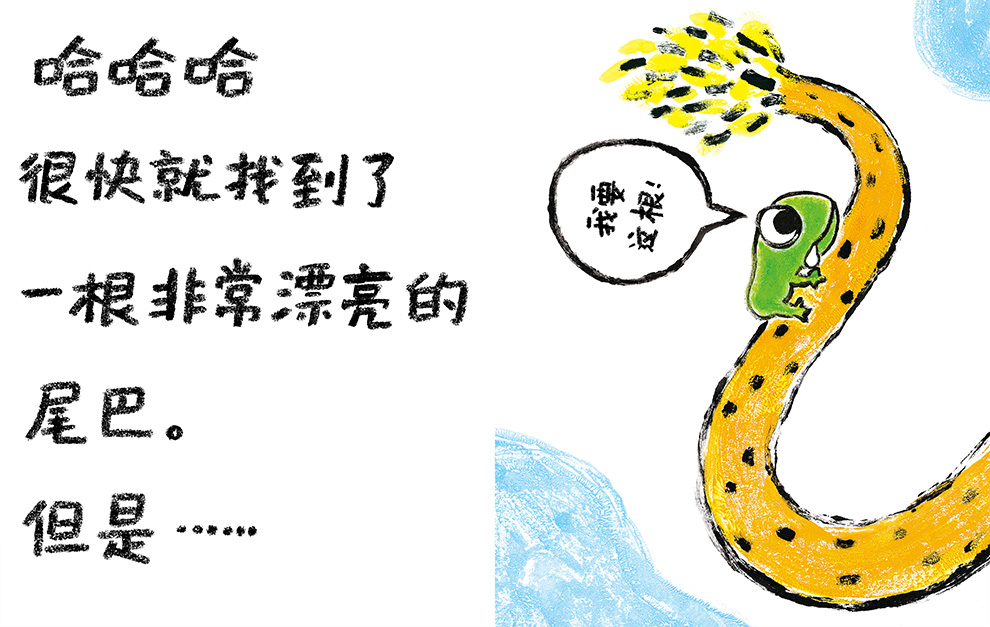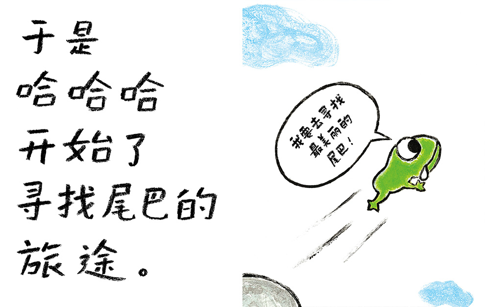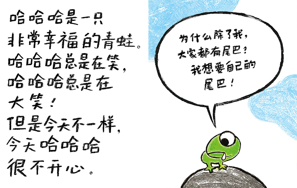 哈哈哈是一只非常幸福的青蛙,哈哈哈总是在笑,哈哈哈总是在大笑。但是今天,哈哈哈很不开心。“为什么除了我,大家都有尾巴?我想要自己的尾巴!!!”于是,哈哈哈开始了寻找尾
