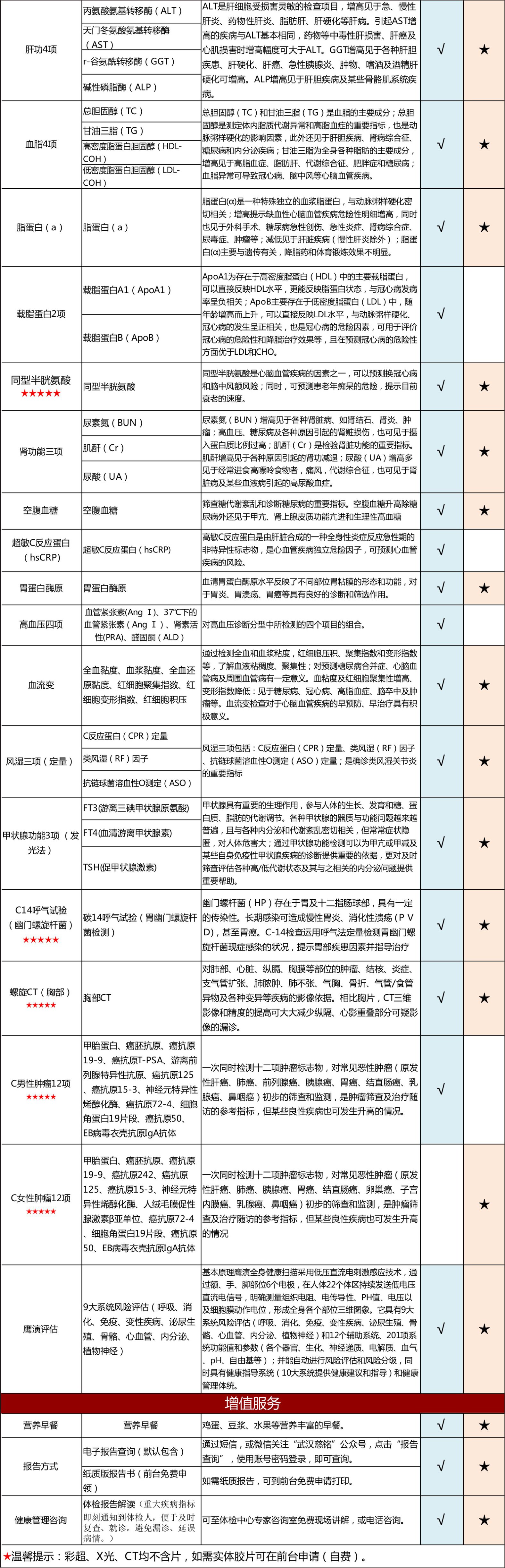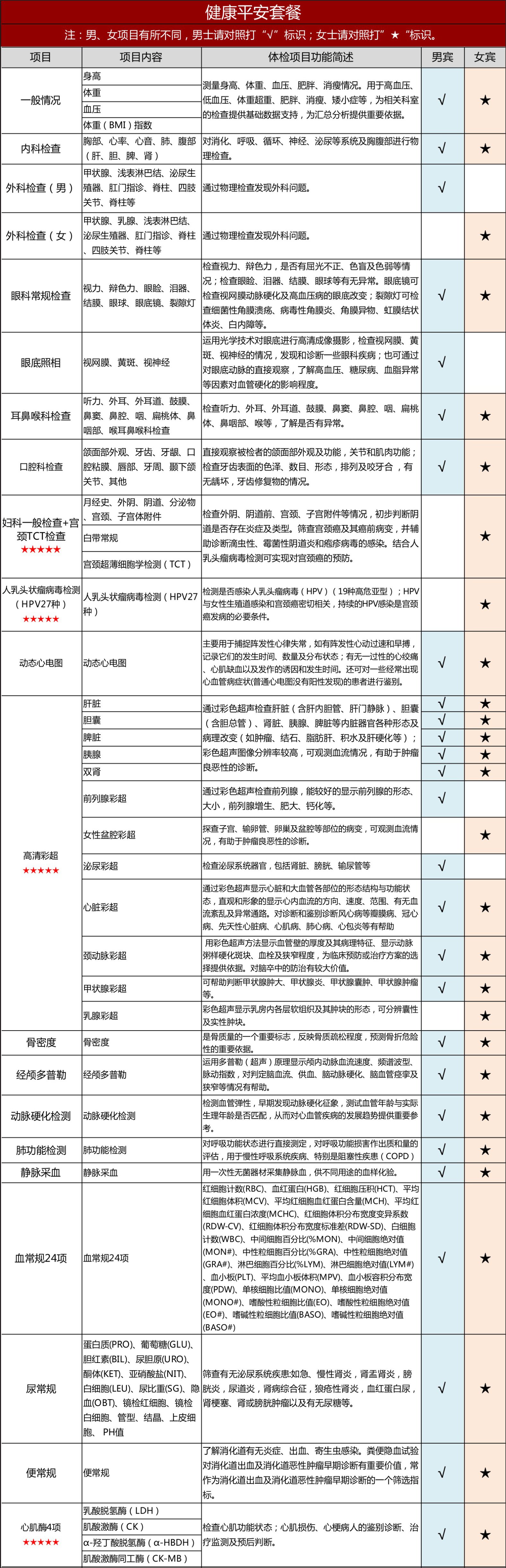 购买须知:以上体检项目表格即本套餐包含的详细内容,男、女士的项目略有不同,请对照对应标注的套餐分组。
