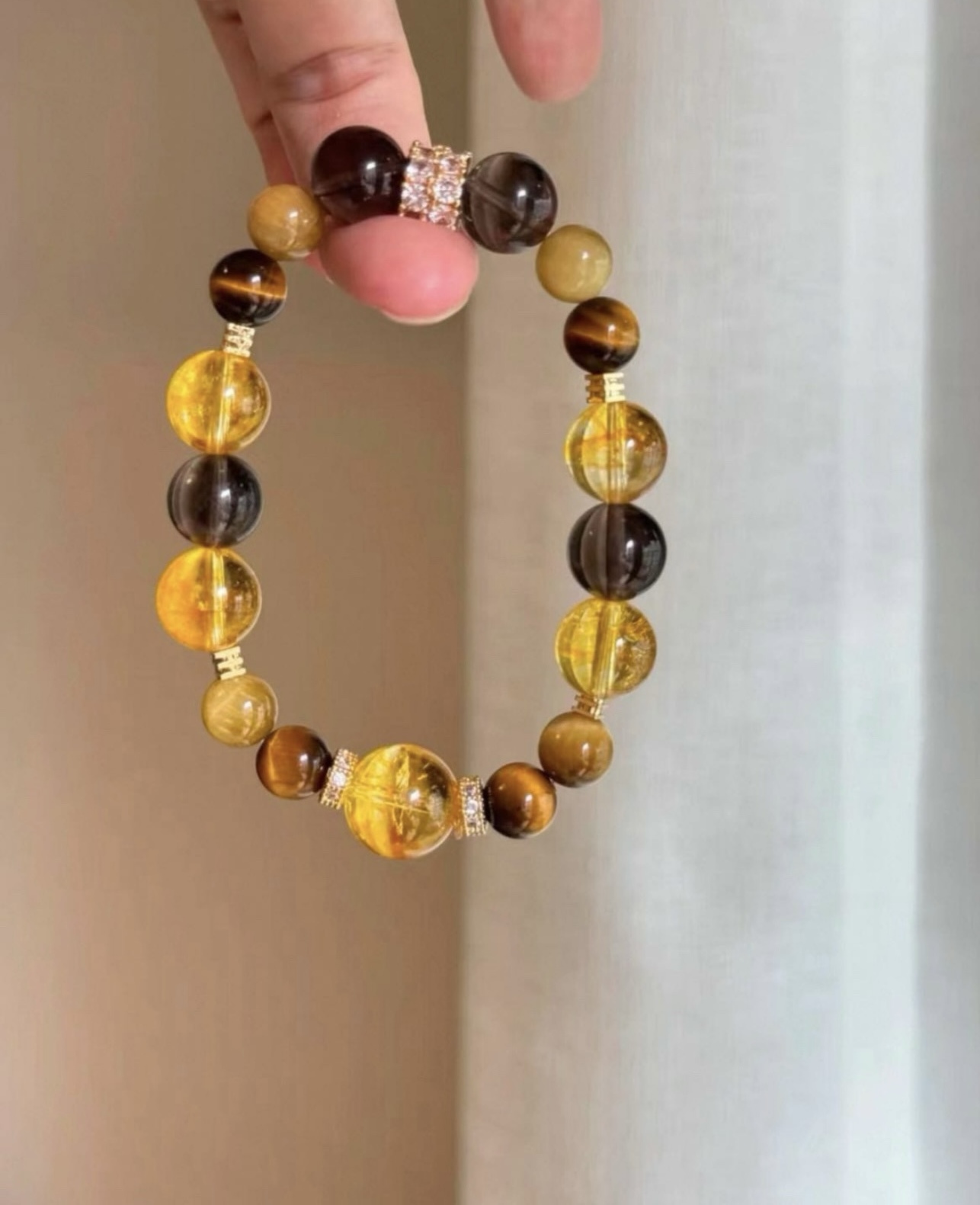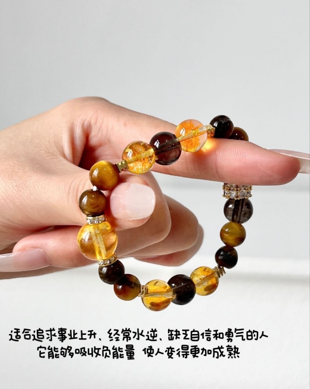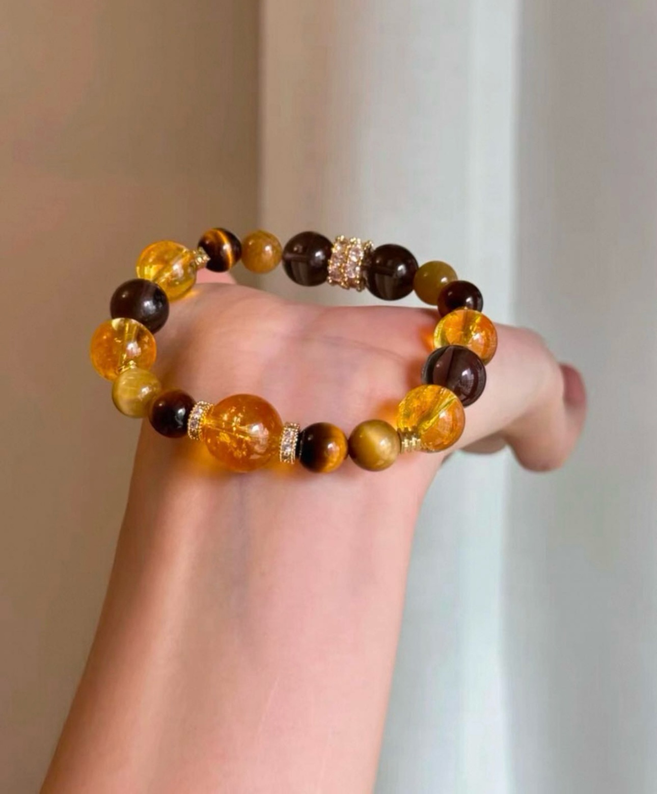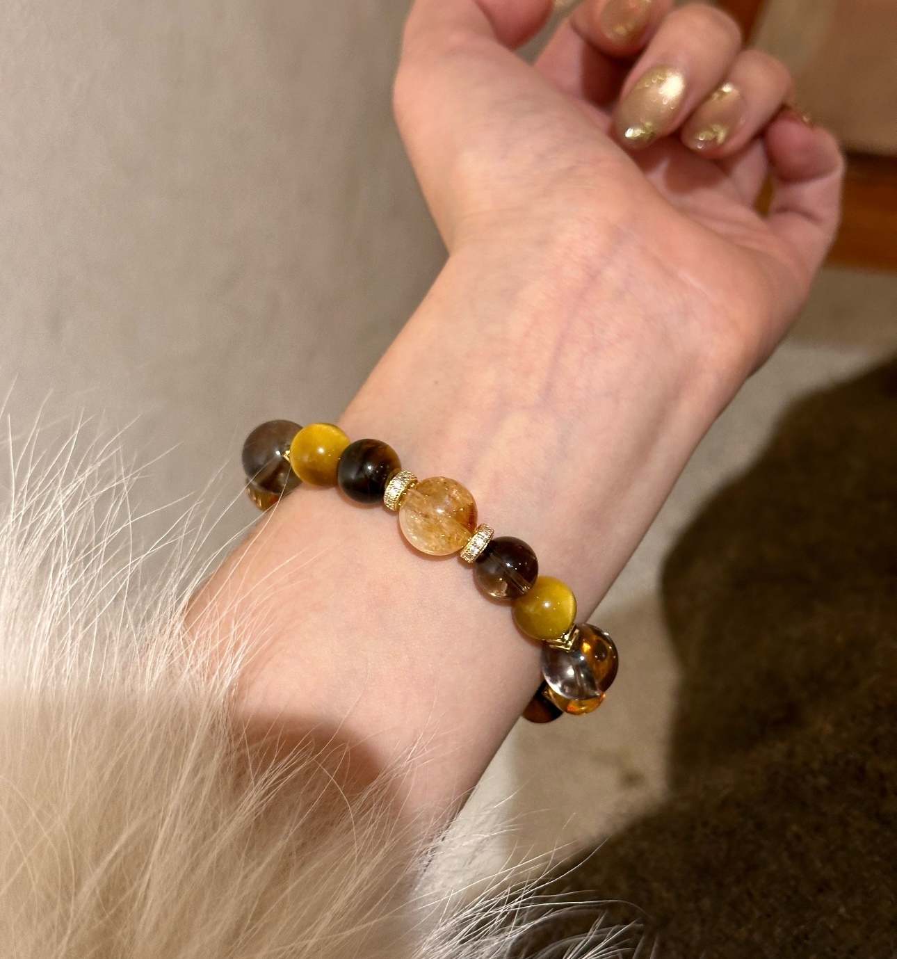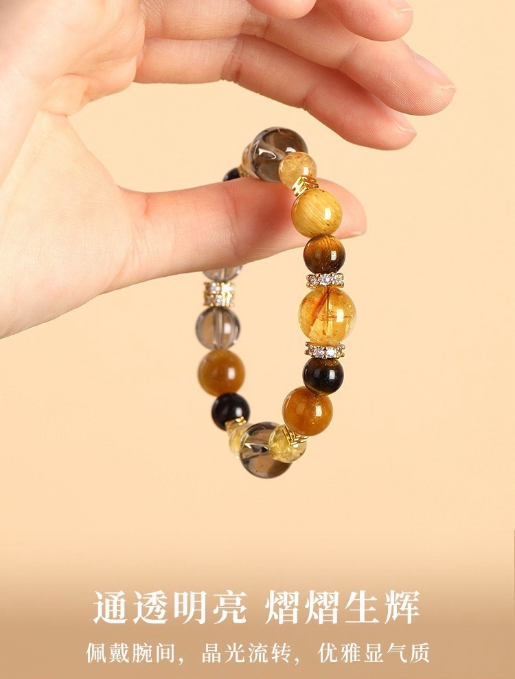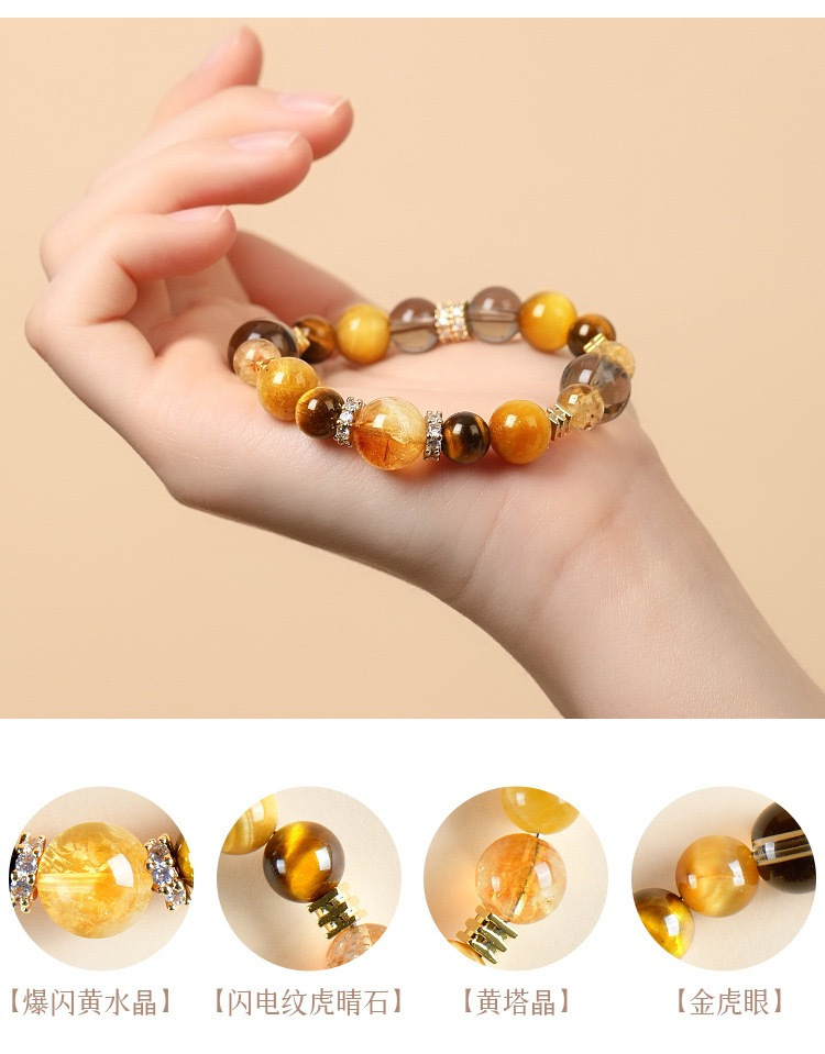 黄水晶手串总能以其独特的光芒,点亮整体造型。