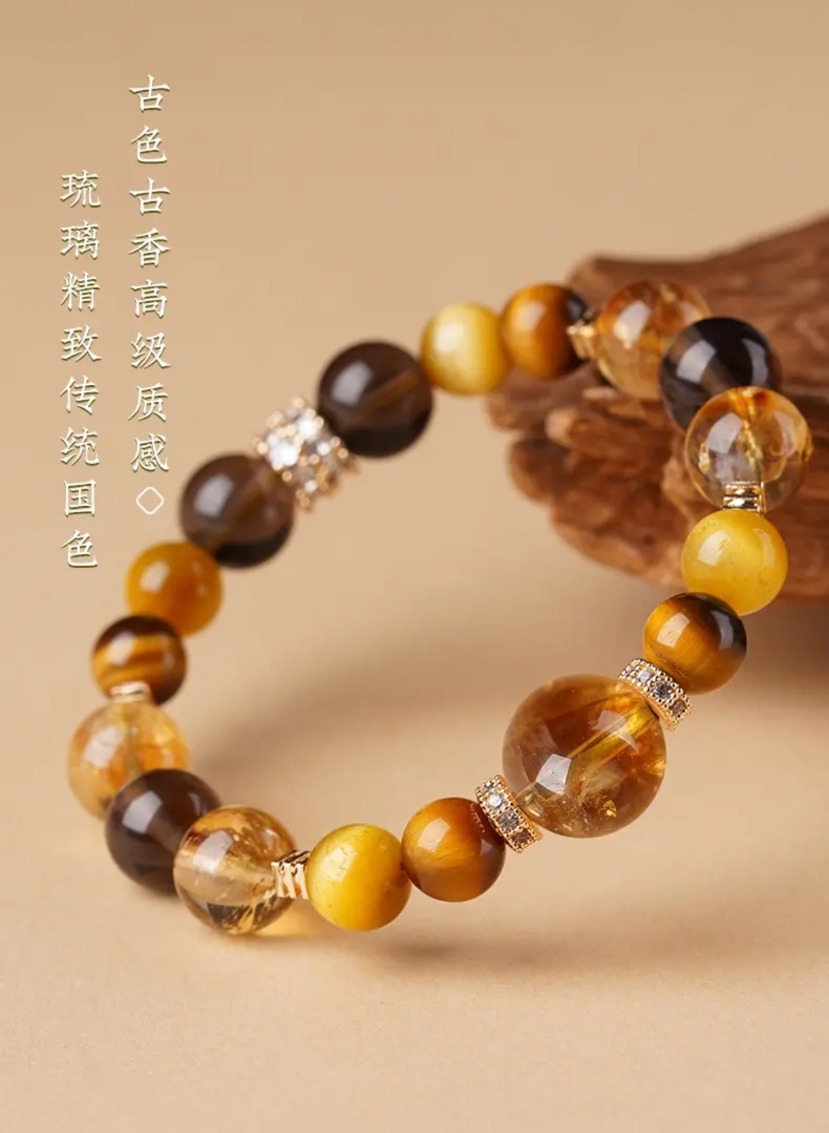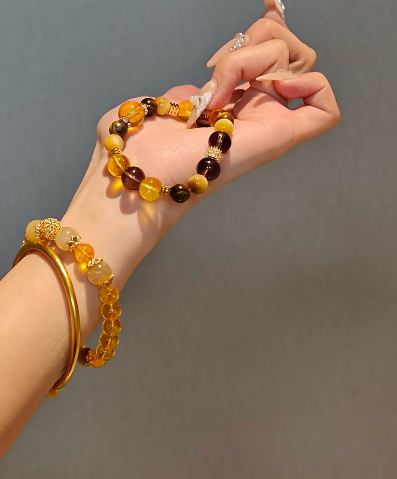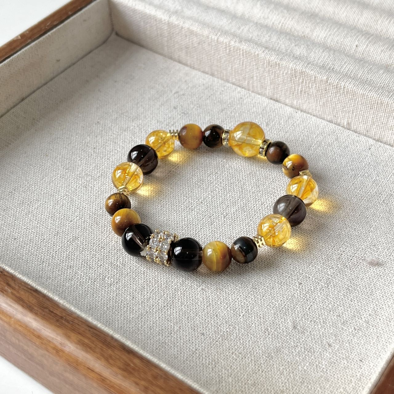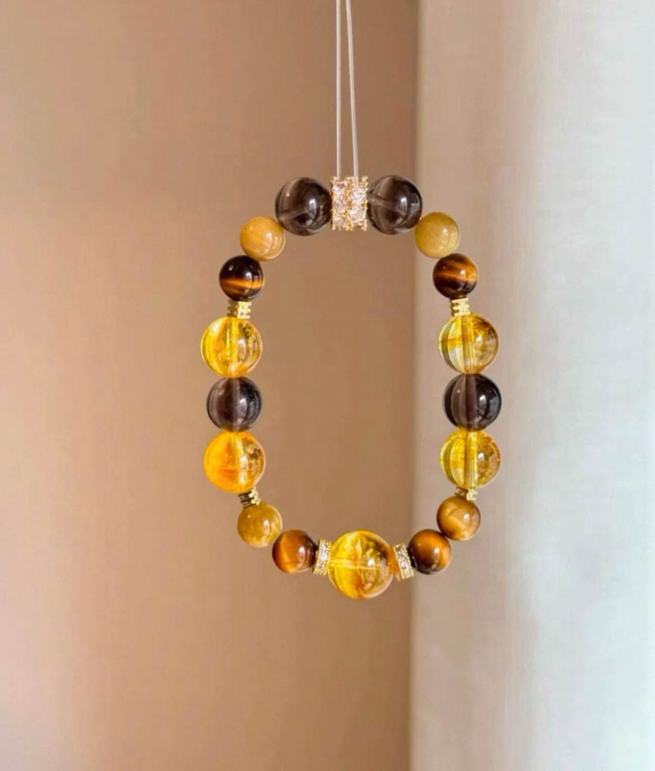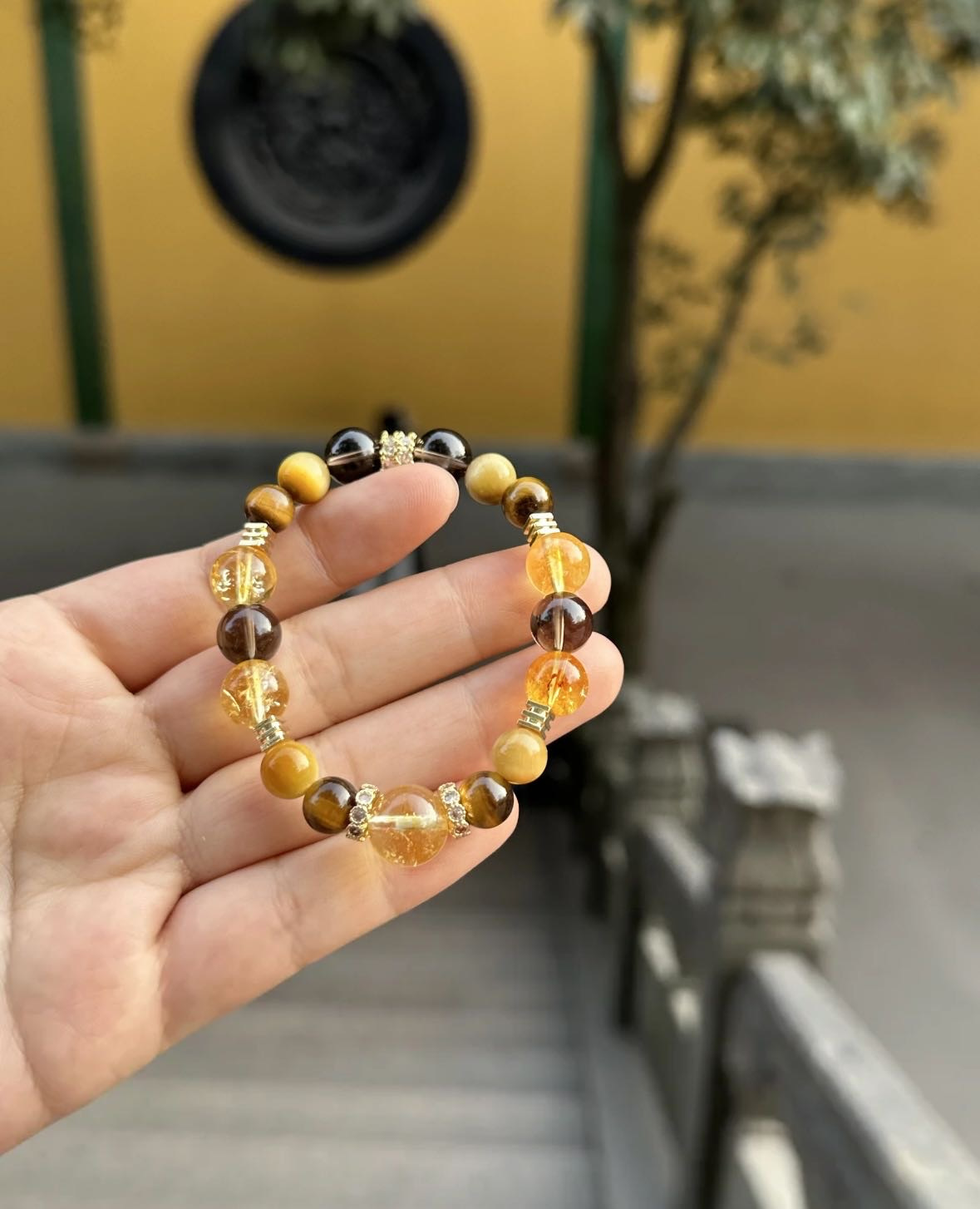 黄水晶手串总能以其独特的光芒,点亮整体造型。