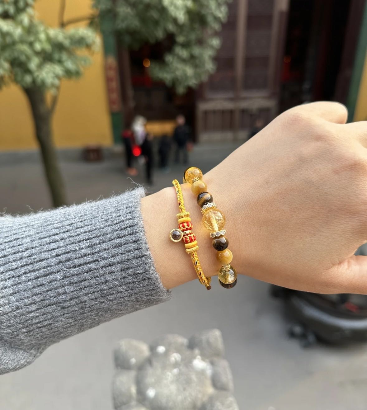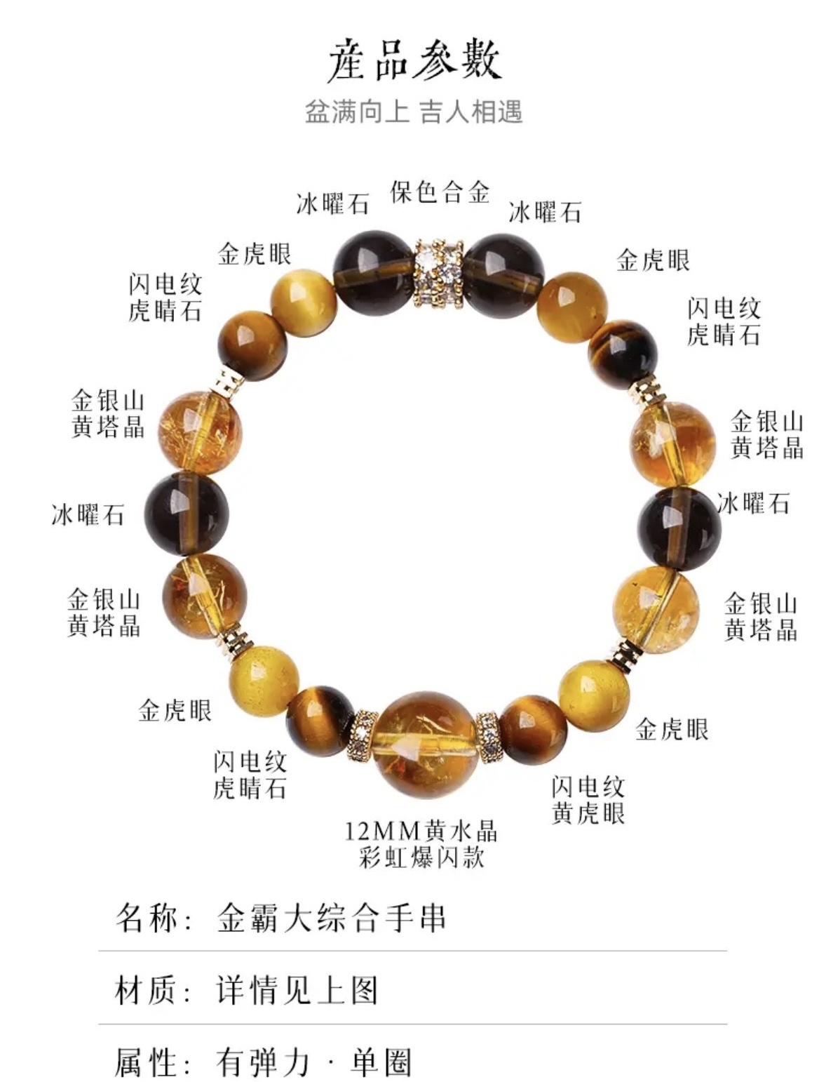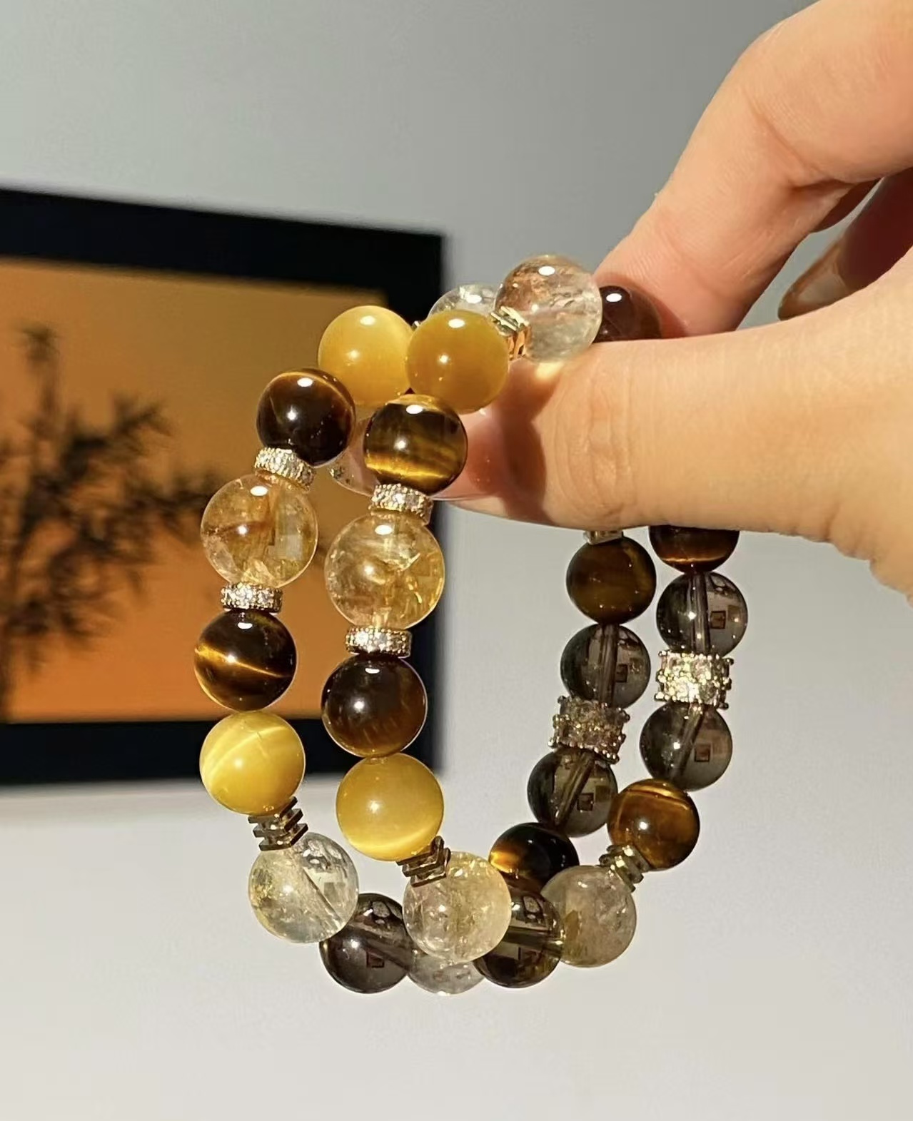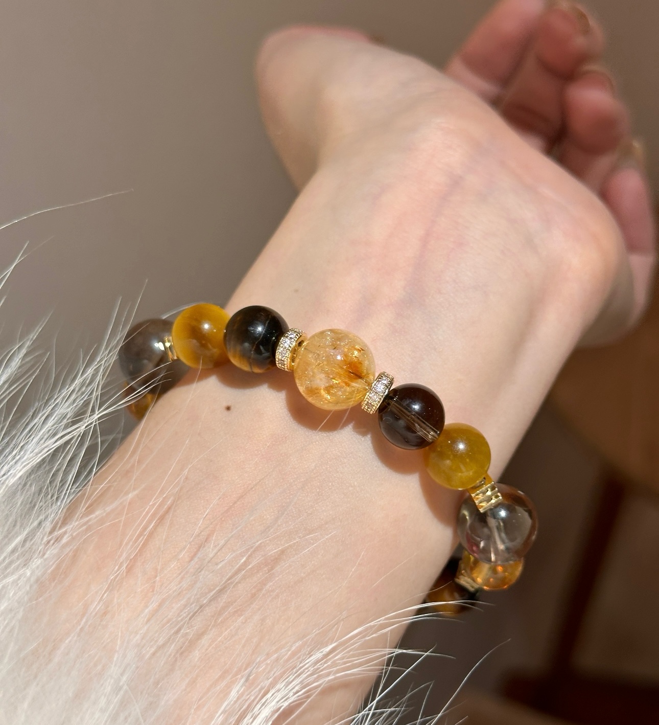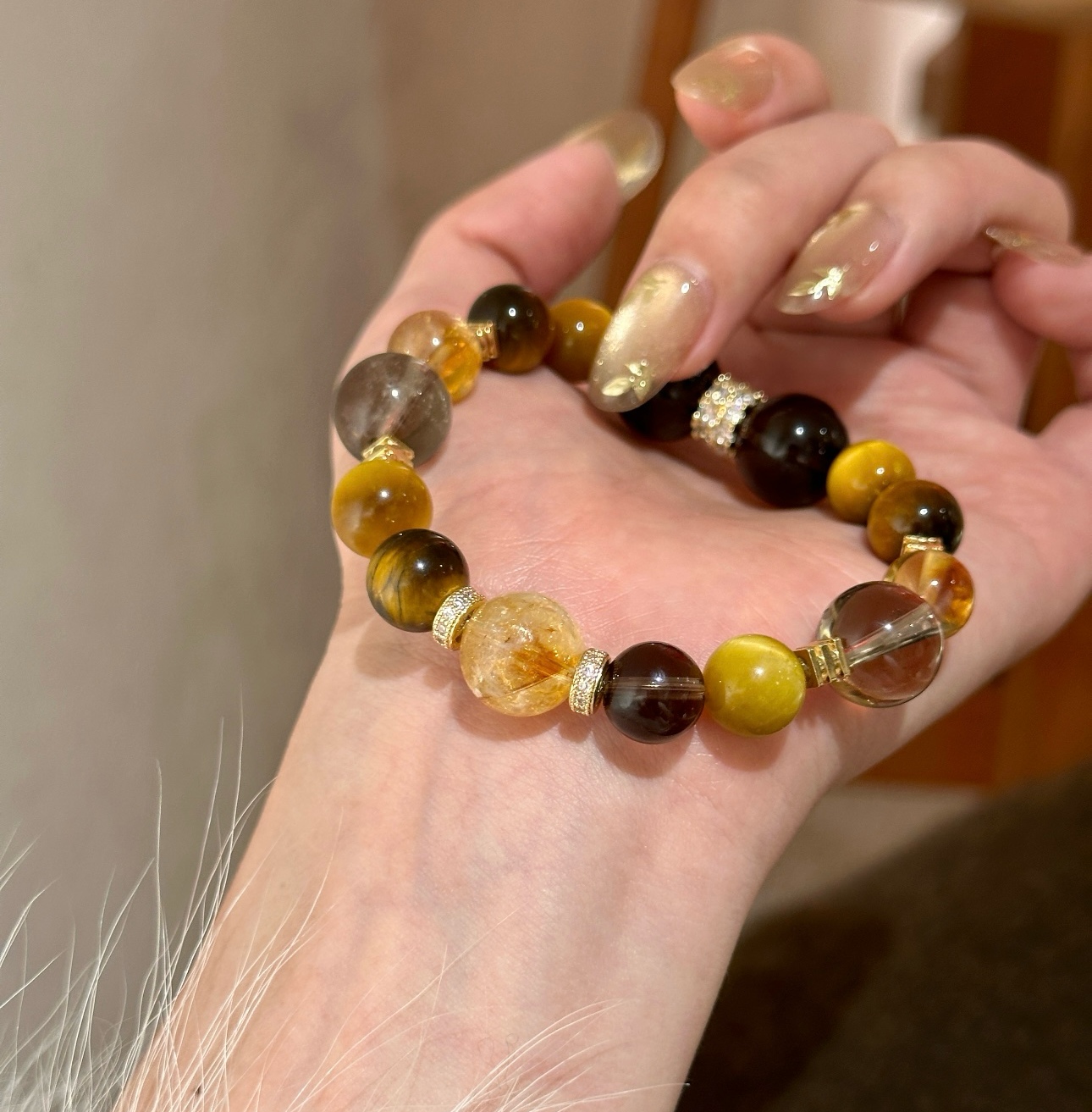 黄水晶手串总能以其独特的光芒,点亮整体造型。