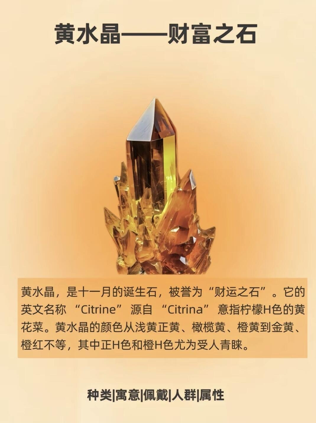 1、黄水晶又称“财富之石”,它的颜色从浅黄到深黄,甚至带有一些金色的光泽,给人带来温馨与希望。