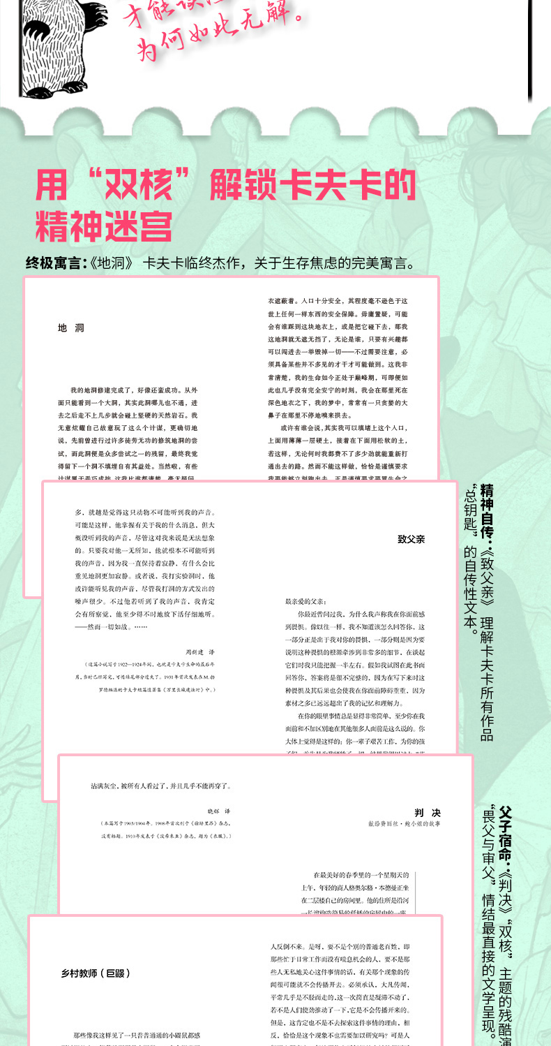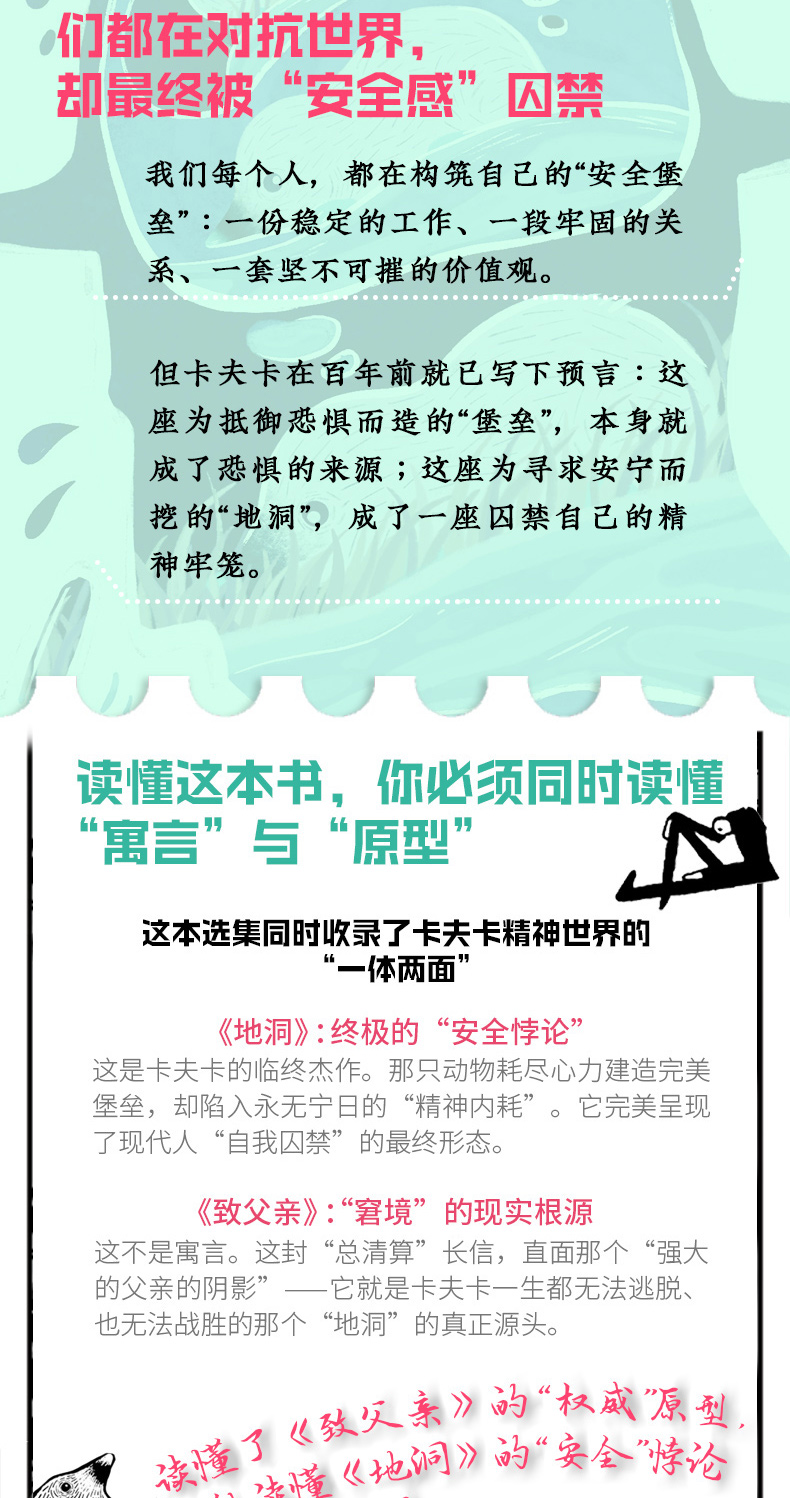 正如本版封面主题所揭示:;安全的堡垒挖得越深,离绝望就越近。这不仅是《地洞》的写照,更像一条隐秘的线索,贯穿于卡夫卡不同时期的众多作品之中。本书精心收录了卡夫卡早期的探索性文本《一次斗争的描述》、奠定其文坛地位的惊世之作《判决》、充满梦魇色彩的《乡村医生》、哲思寓言《一条狗的研究》等代表性篇目,更特别纳入了理解卡夫卡创作根源的;钥匙非虚构长信《致父亲》。