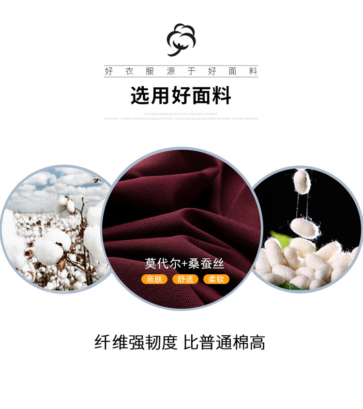 面料:42.5%聚酯纤维 26.4%莫代尔 23.0%棉 5.2%桑蚕丝 2.9%氨纶