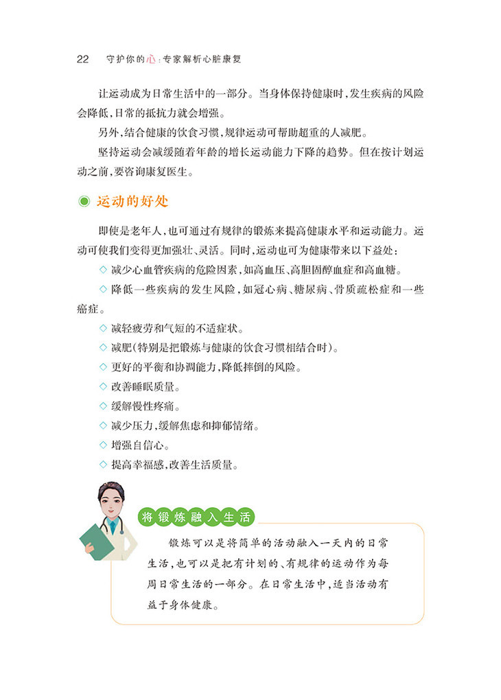 可操作性,本书运动指南部分配有大量图片,便于读者通过图片掌握运动姿势及技巧,进而适当、规律、有效地运动,改善患者的心脏功能,降低再住院率、心血管事件再发率和死亡率。