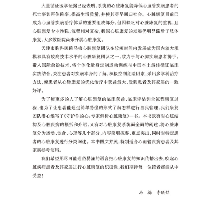 专业性,本书作者均来自天津市胸科医院康复医学科,是由康复医师、康复治疗师、康复护士组成专业的MDT康复团队,具有丰富的心脏康复经验。
