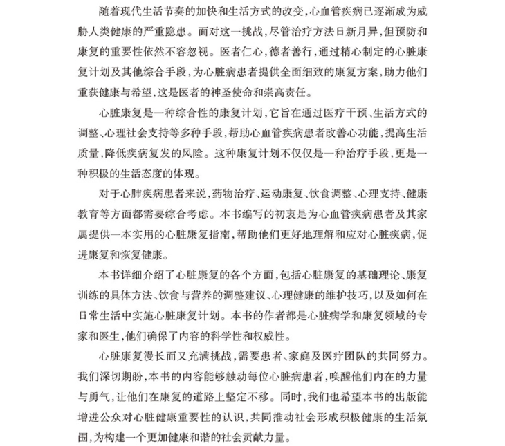 实用性,本书是以天津市胸科医院康复医学科对患者及其家属所实施的心脏康复患者教育为蓝本编写而成,受益患者众多,受到广大患者及家属的好评。
